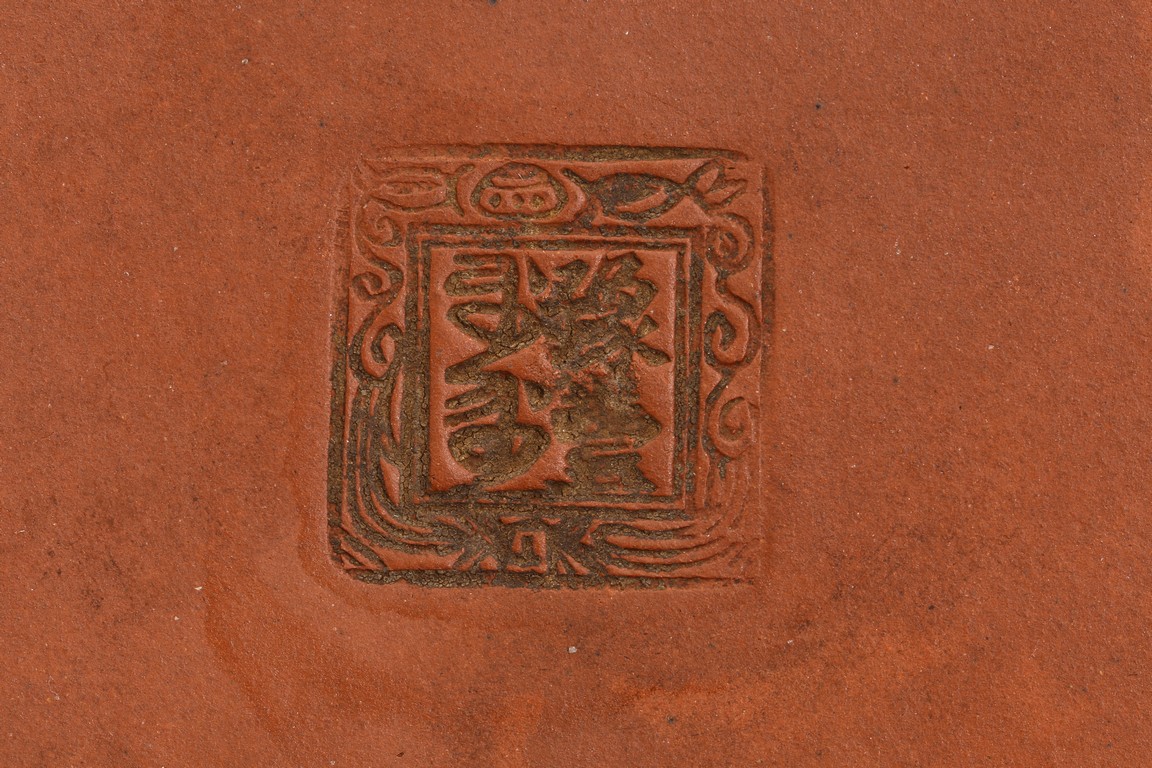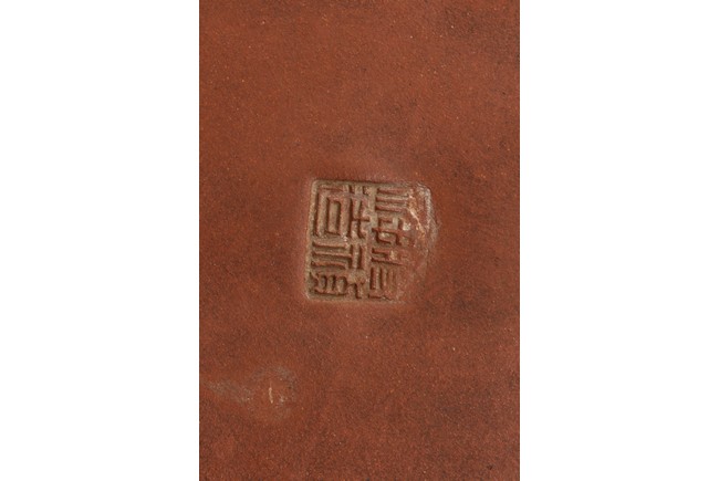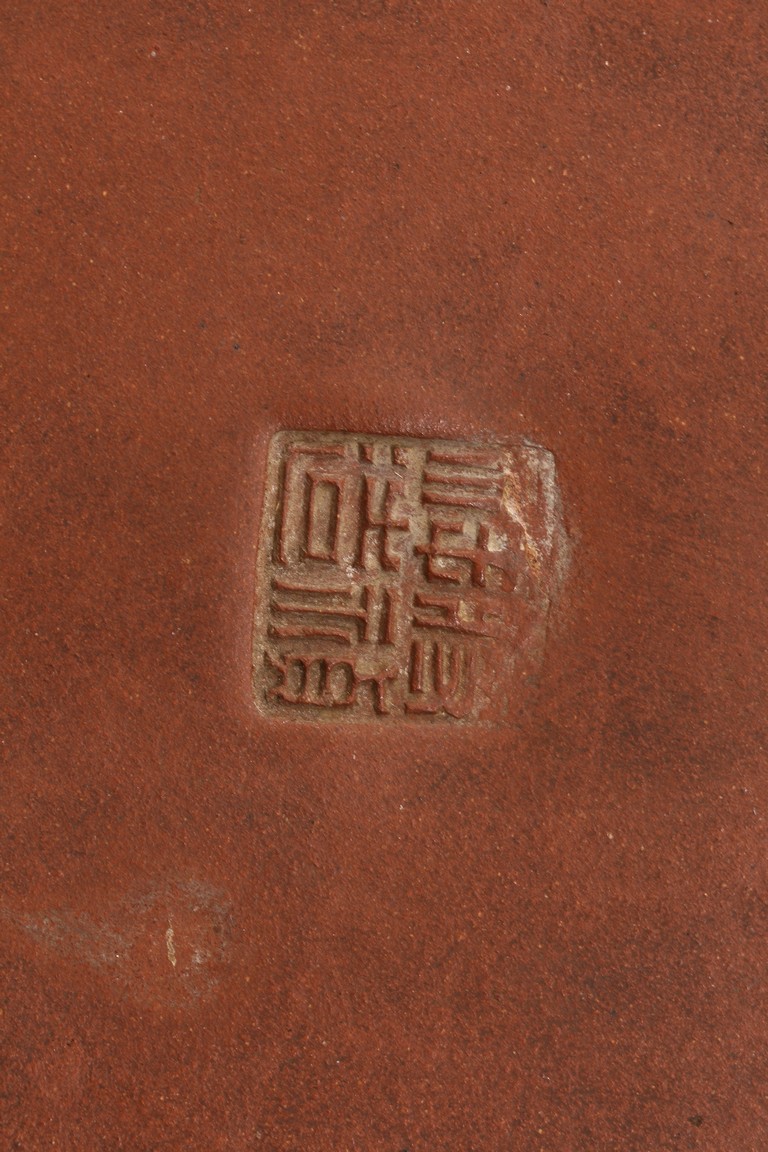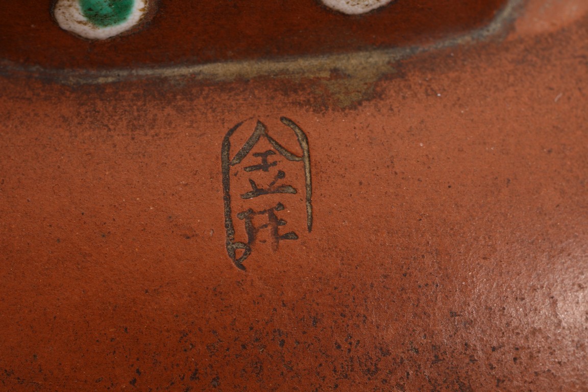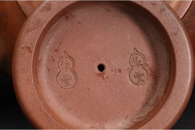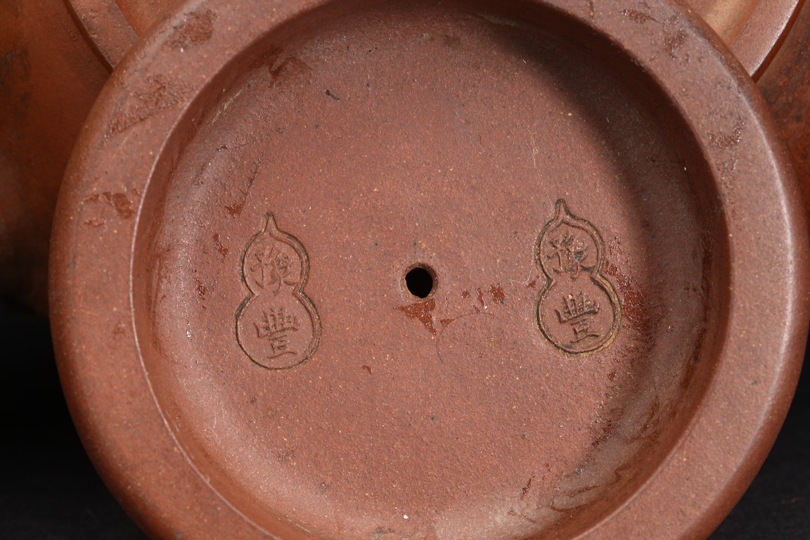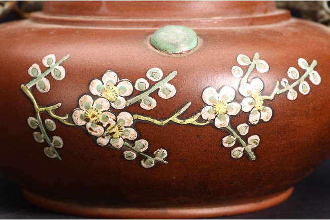 Qing Dynasty period. Consisting of two painted Yixing teapots of different sizes, one painted with phoenix, the other with flowers and rocks, base with marks.