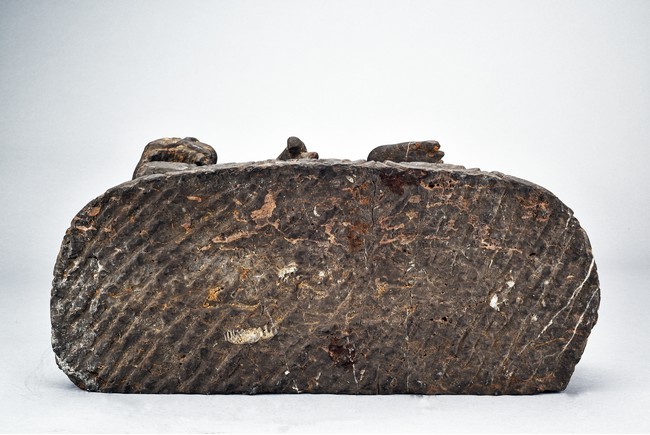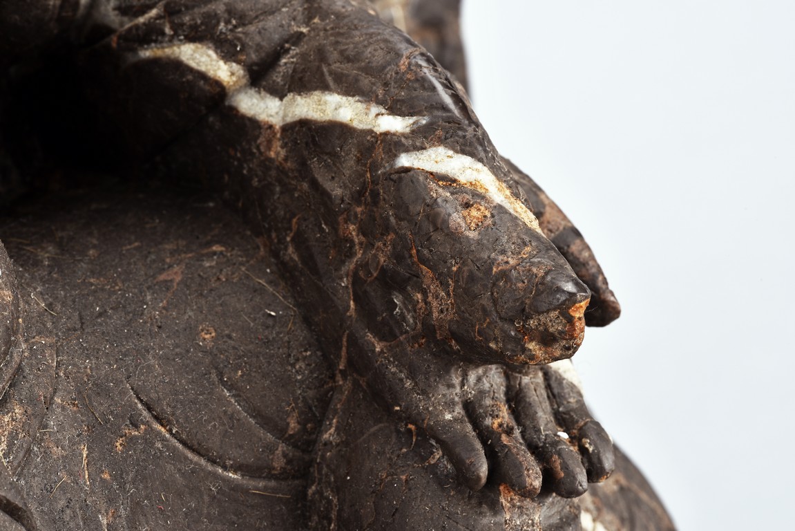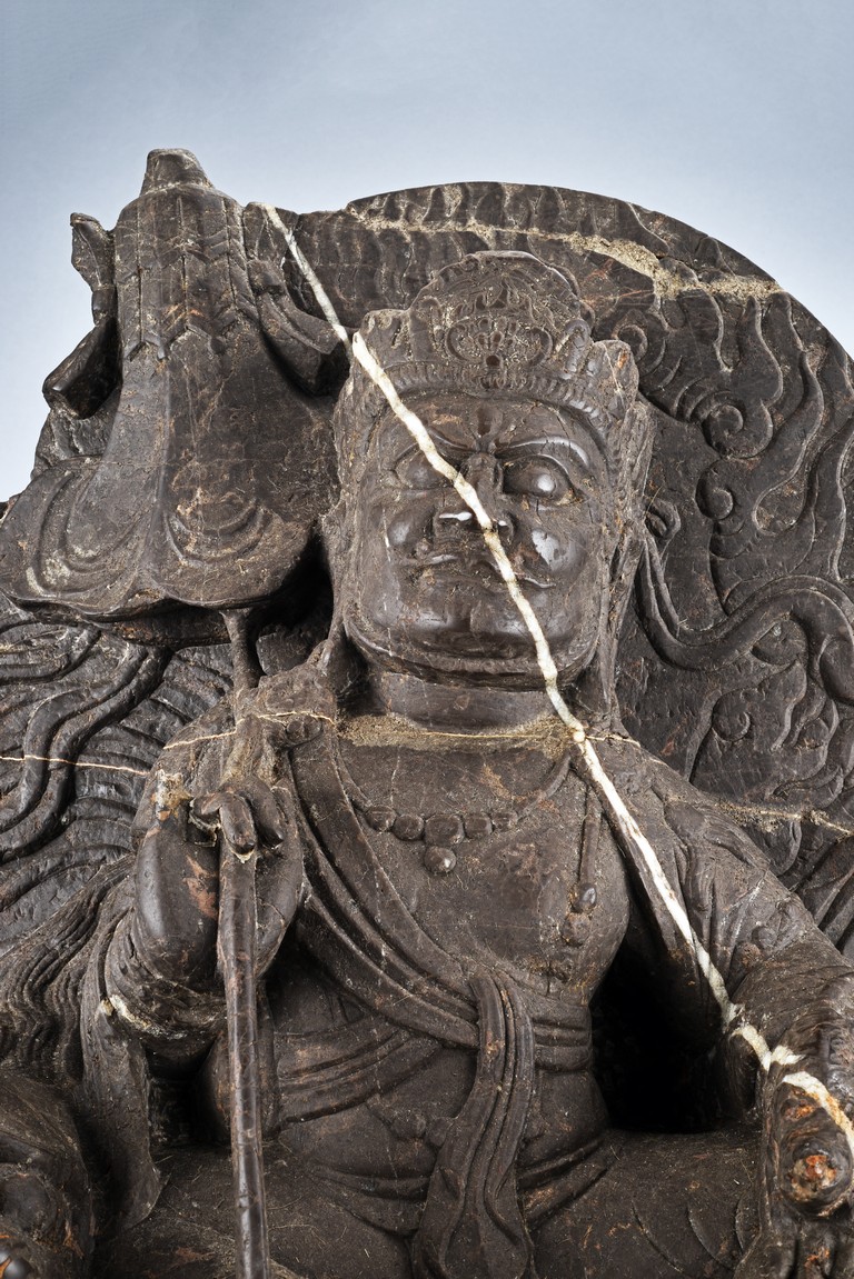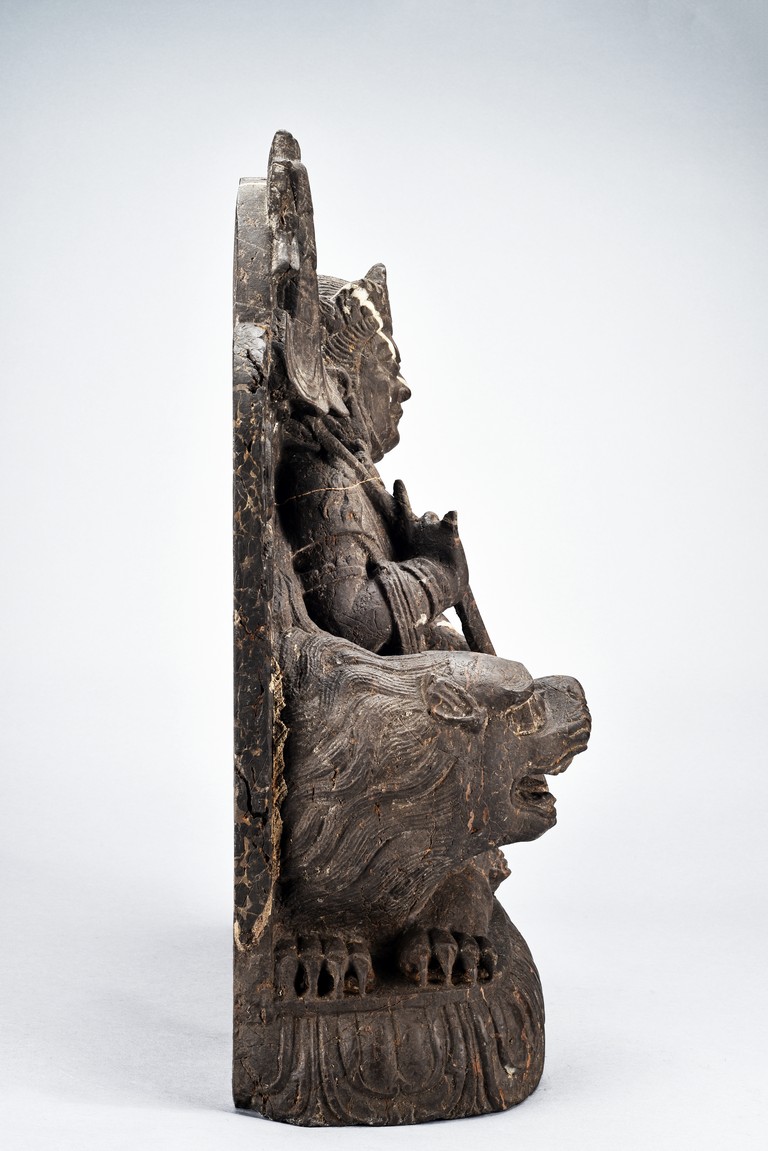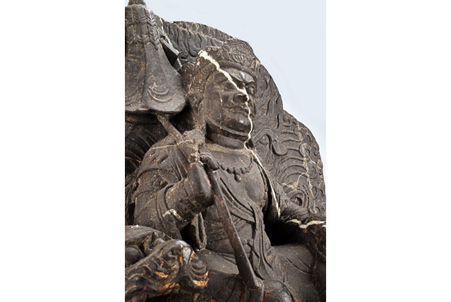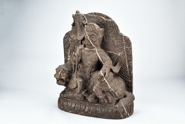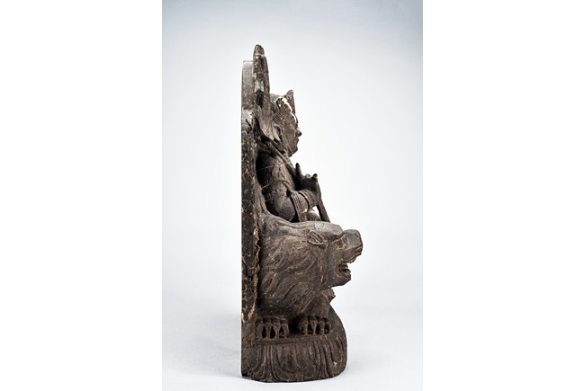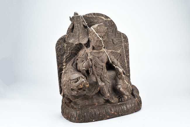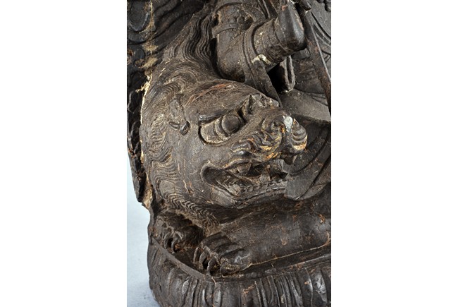 Ming Dynasty period. Shown seated on a lion over a lotus base, his left hand holding a mongoose, right hand holding a staff, dressed in a robe and adorned with flowing ribbons, the face with stern expression and wearing a crown.