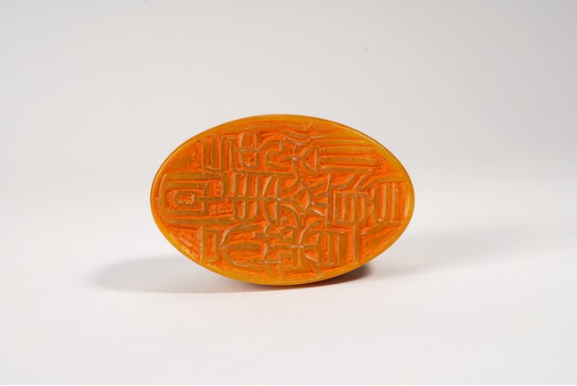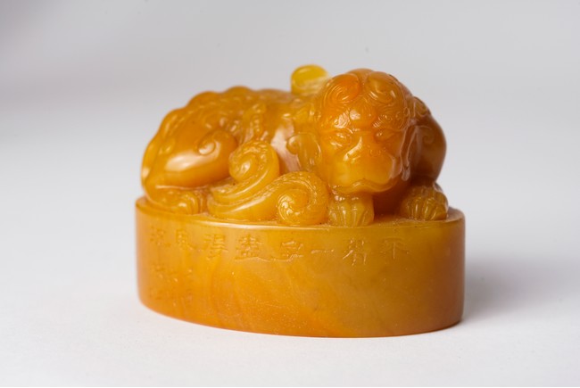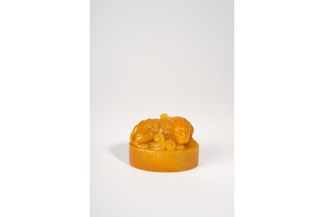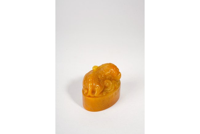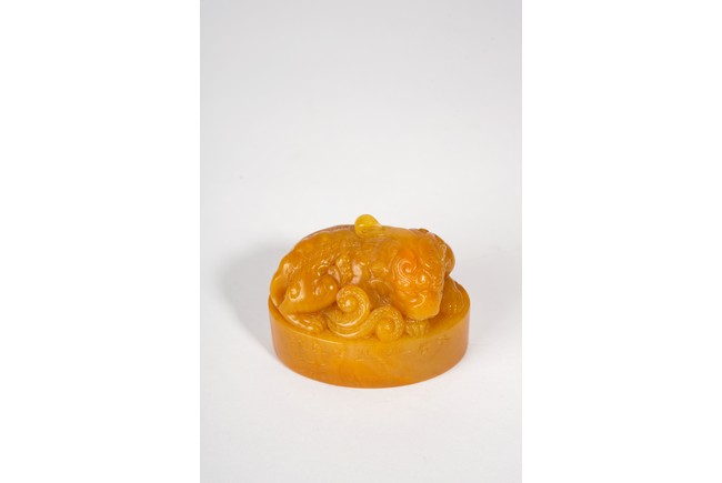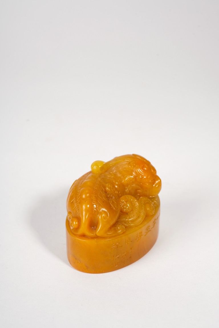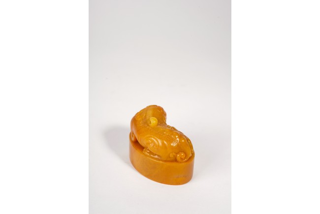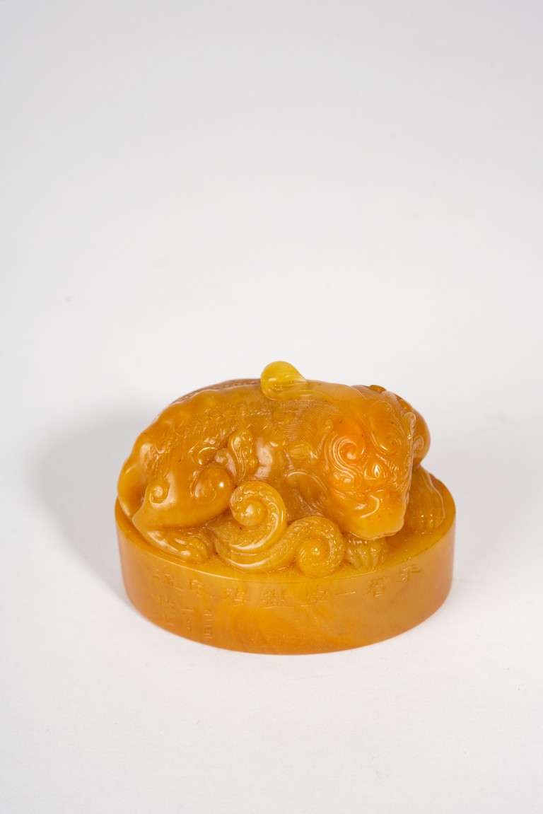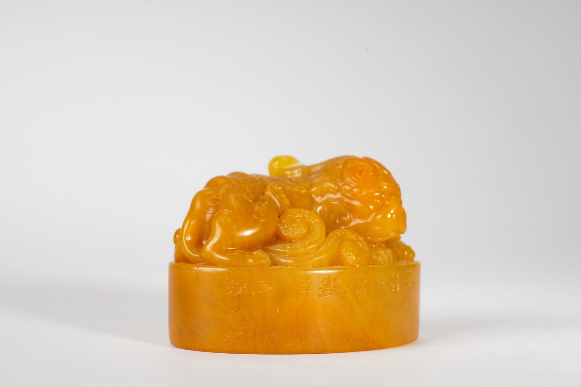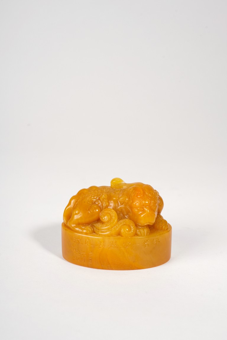 Qing Dynasty period. Carved by Jin Cheng, of ovoid form, this seal finely carved with a recumbent mythical beast as knop, its details intricately depicted, its head with bulging eyes and flared nostrils, its muscles with detailed with fine incisions, with bifurcated tails swept to one side, the seal carved with inscription and signed Gong Bei, the seal face carved, the stone is of warm golden-orange color with characteristic 'radish veining'.