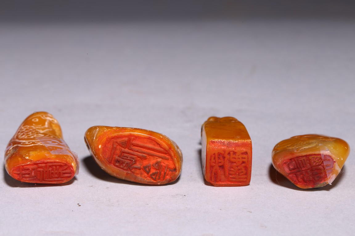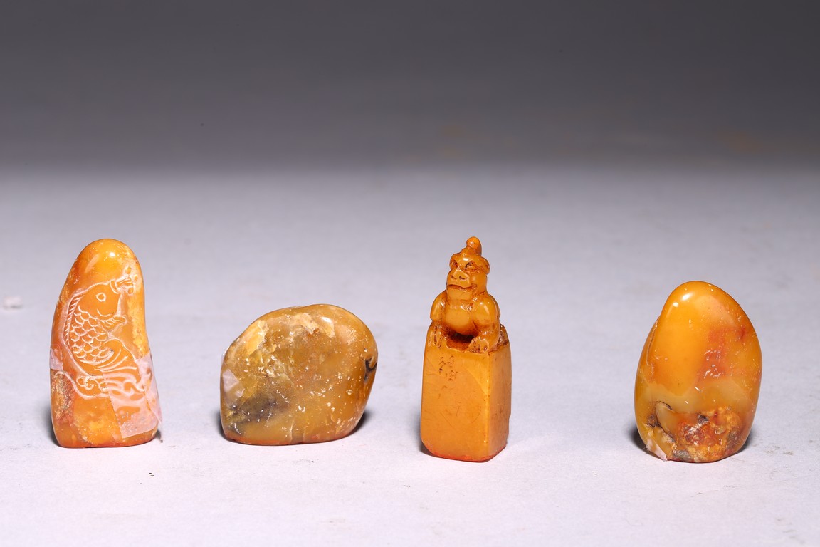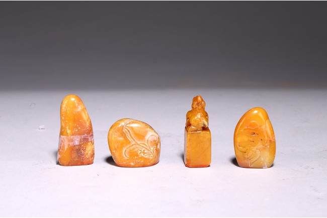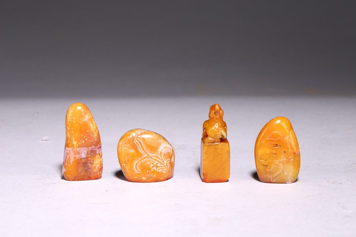 A group of four shoushan stone seals in various shapes, each seal face carved with characters.