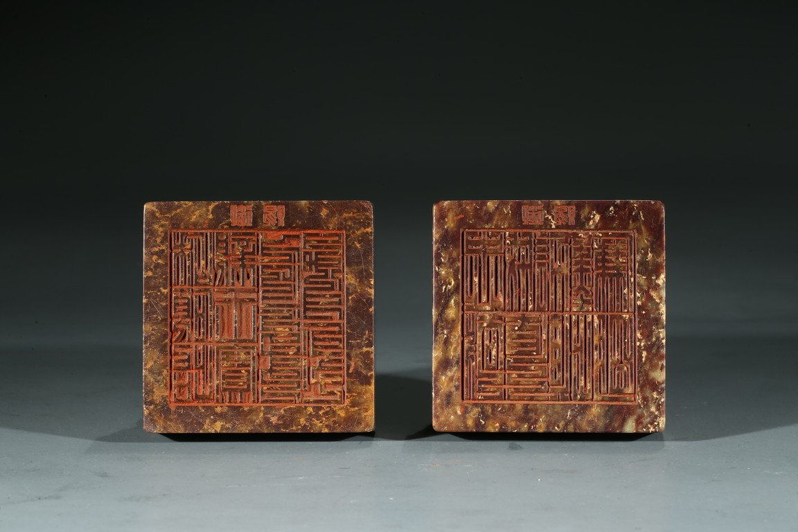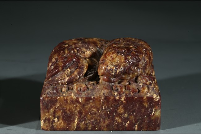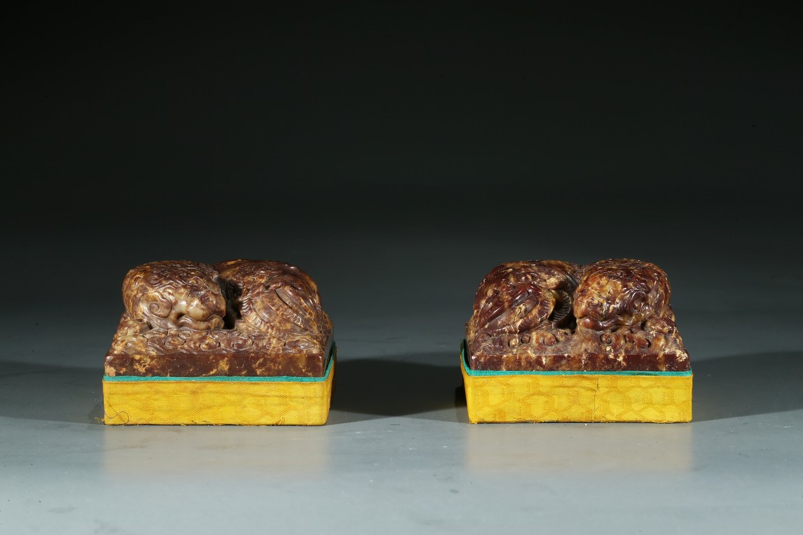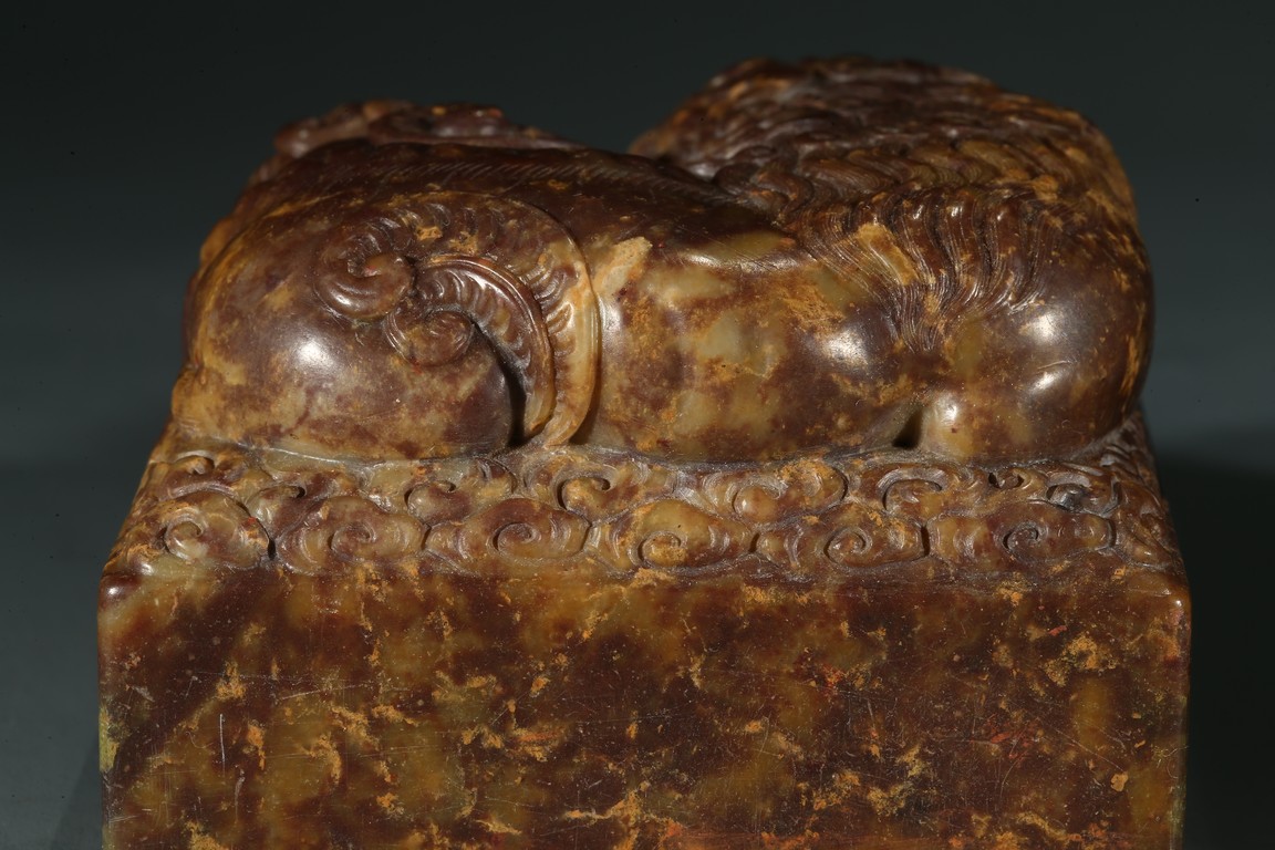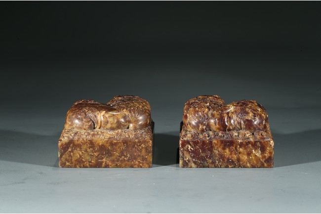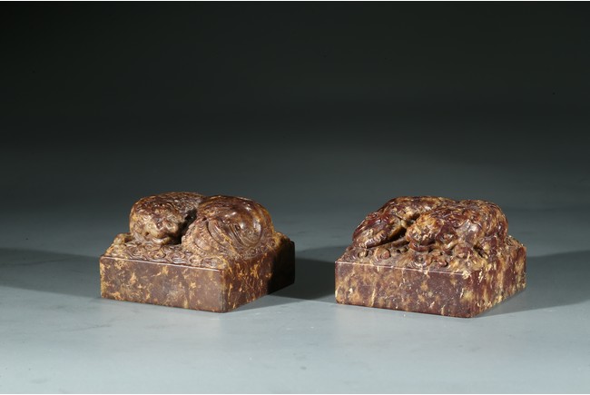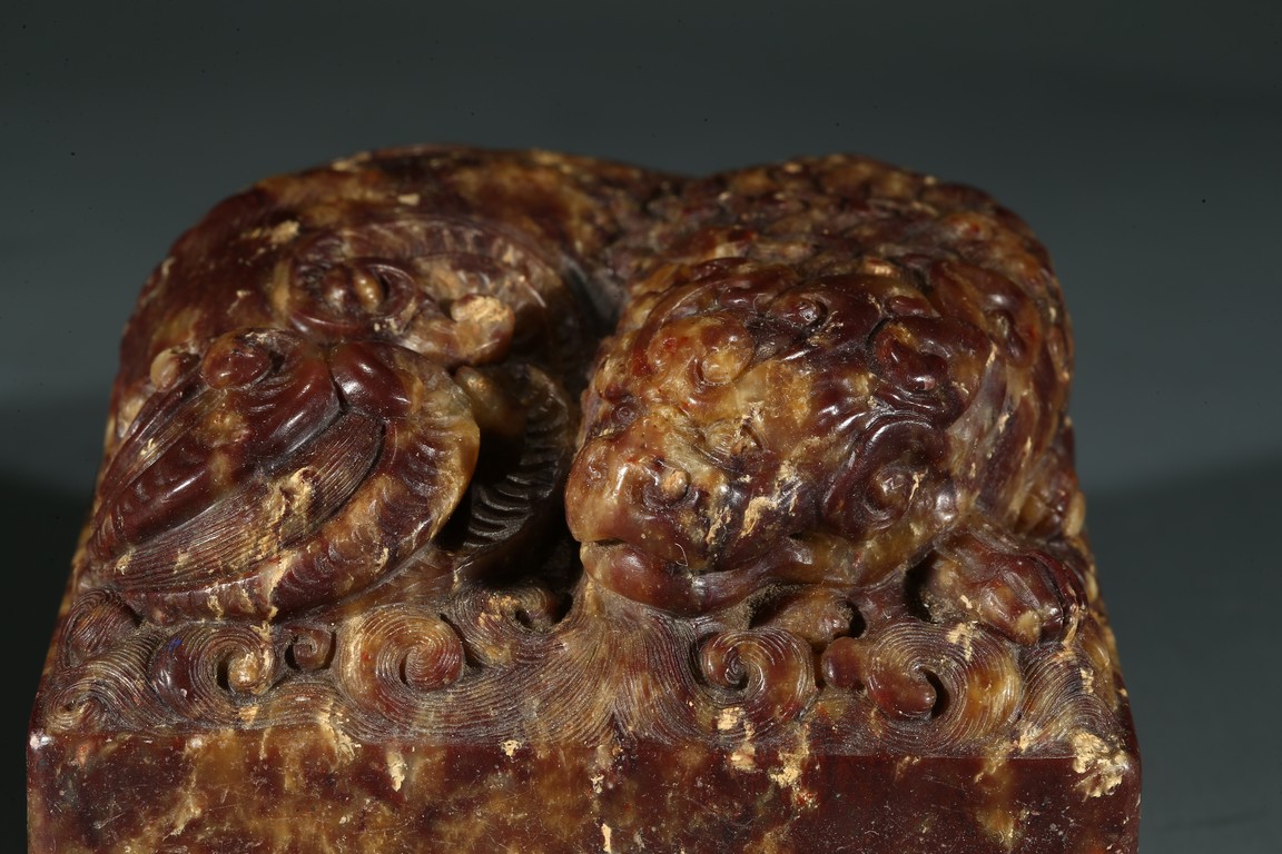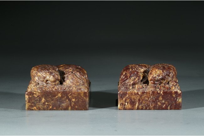 壽山石「溫潤光澤,易於奏刀」的特性,很早就被用於作雕刻的材料。此件藏品紋理美觀,石質溫潤,肌理潔淨,其溫、潤、膩、凝、細、潔具在。圓雕瑞獸為鈕,體態遒勁,雕琢精緻,生動活潑,下淺刻浮雕雲卷紋。壽山石雕品始見於南朝的石俑,至宋代時已經達到可以供玩賞的水平,於是便有了“收藏”的歷史,但大多數為宮廷及達官貴人所收藏。元末開始用壽山石刻印,並因此有壽山石印鈕藝術的產生,收藏壽山石印材和壽山石印鈕,成為當時文人雅士的喜好,並一直影響到現在。此壽山石印,因材施藝,器型規整,刀法樸茂,成對保存完整,收藏價值甚高。