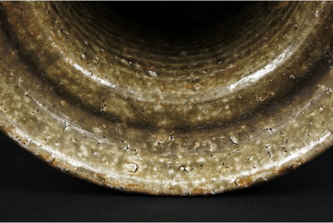 Rising to a widely flared mouth, the vase is covered to exterior with a greenish celadon glaze and carved with a twisting chilong in relief around the neck.