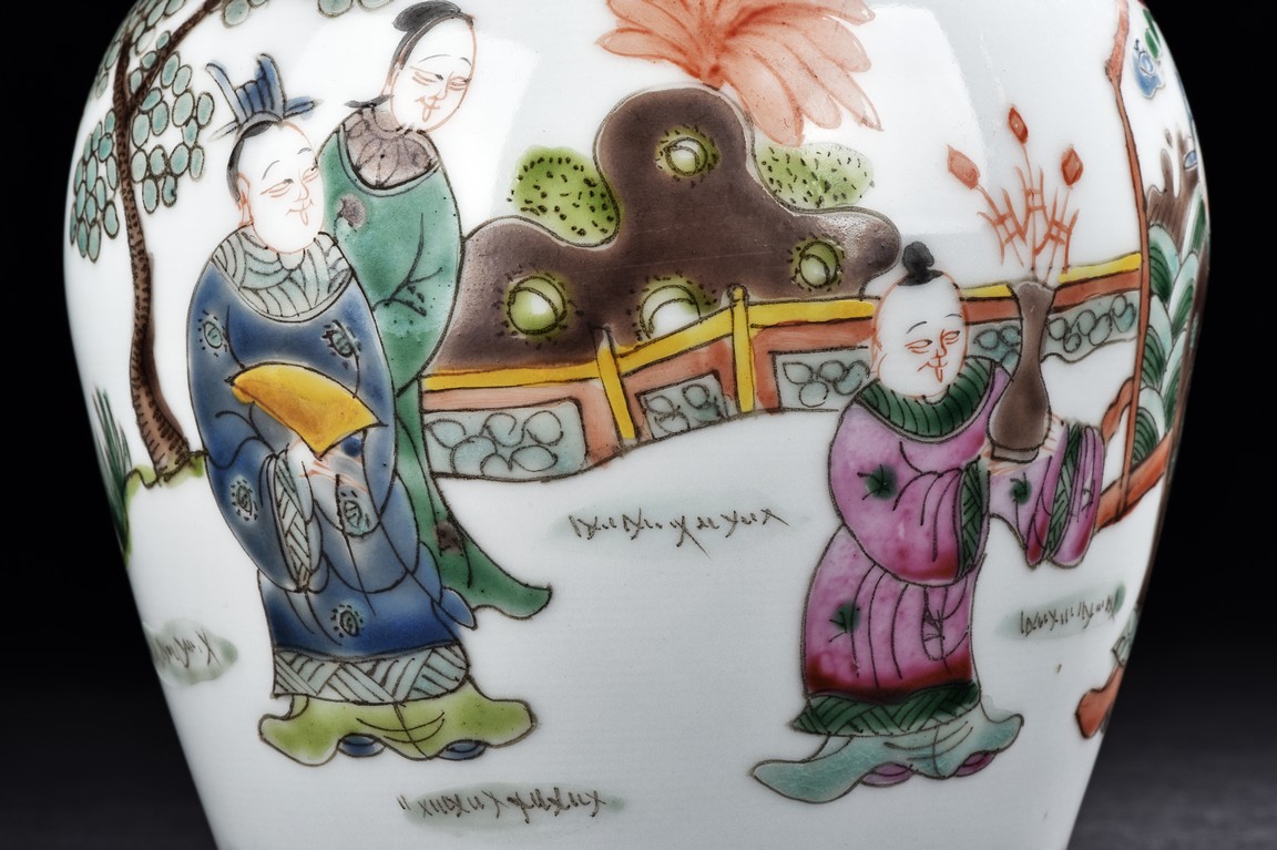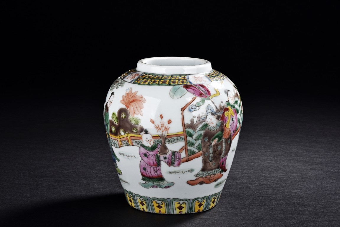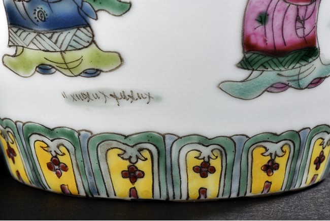 Qing Dynasty period. Painted around the sides with a continuous scene depicting a group of guests presenting their birthday gifts to an official, flanked a band of four character 'wan shou wu jiang' spaced by geometric pattern encircling the mouth rim, and a band of leaves around the bottom. The base with four character 'Tongzhi' mark.