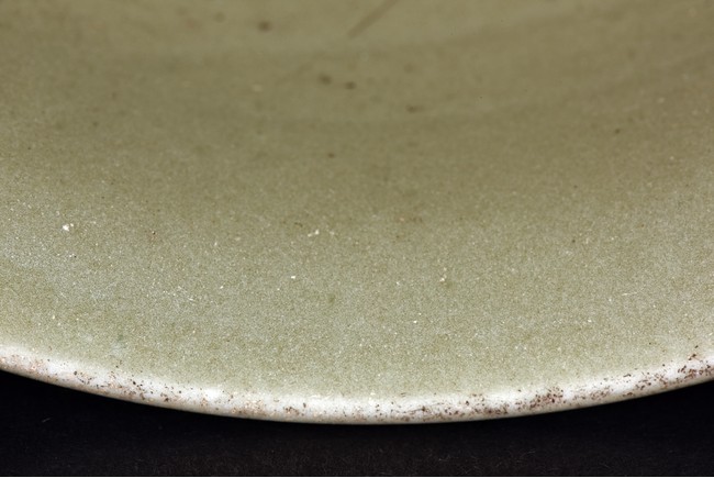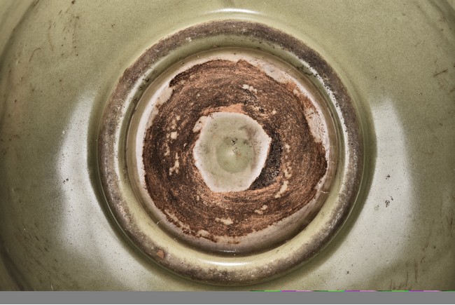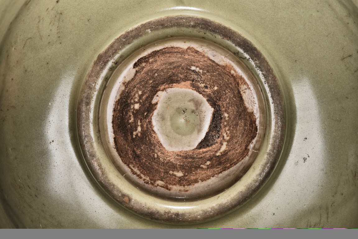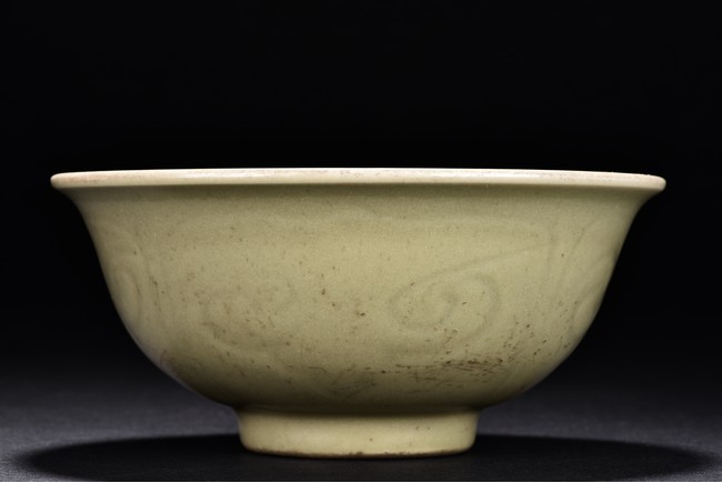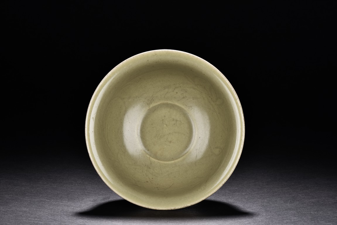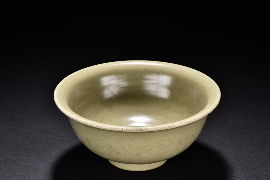 Rising from a circular foot ring,it is overall covered in celadon glaze with shallow floral motif to the exterior and interior.