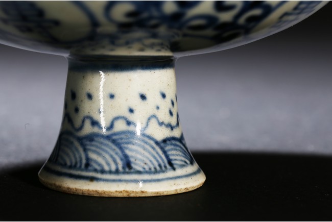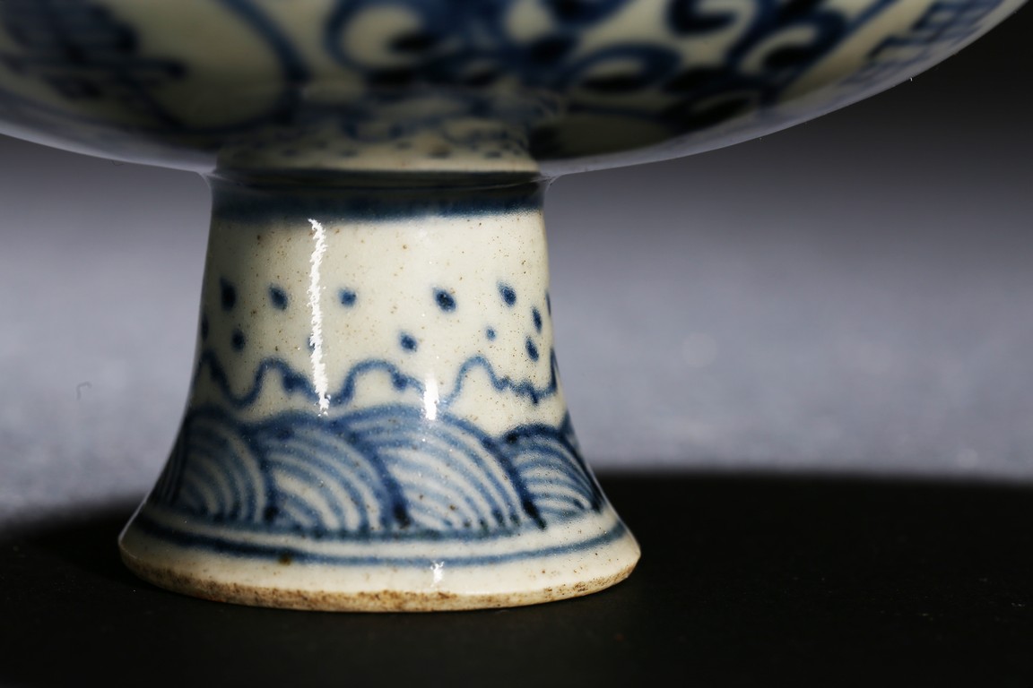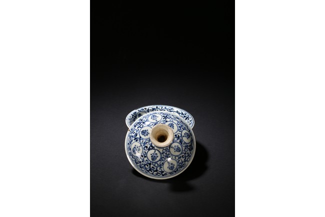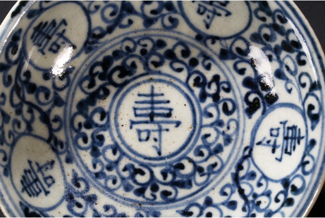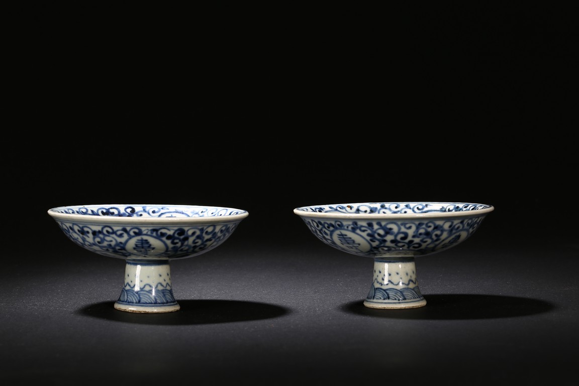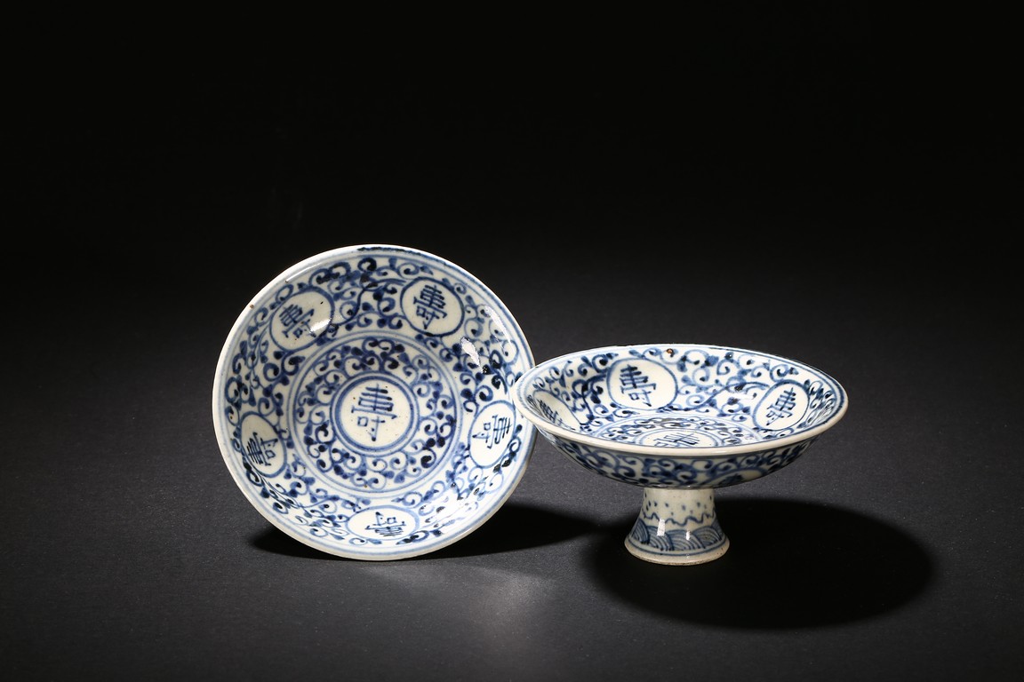 Qing Dynasty period. Each dish supported on spreading foot, the interior painted with shou character.