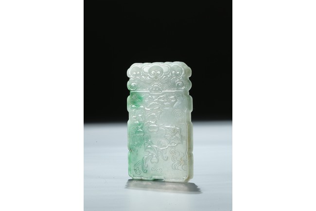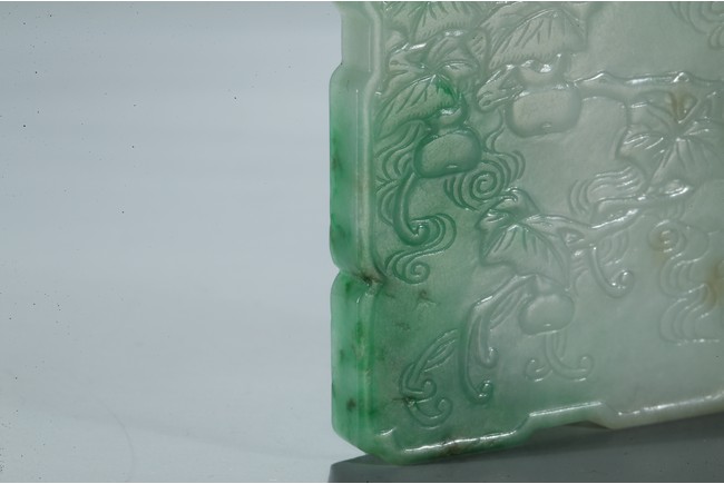 The plaque is delicately worked in low relief with double gourds borne on leafy branches, the reverse inscribed four characters enclosed within a rectangular border, all below lingzhi scrolls, the stone is of high translucent light greenish white tone with green inclusions. Republic period.