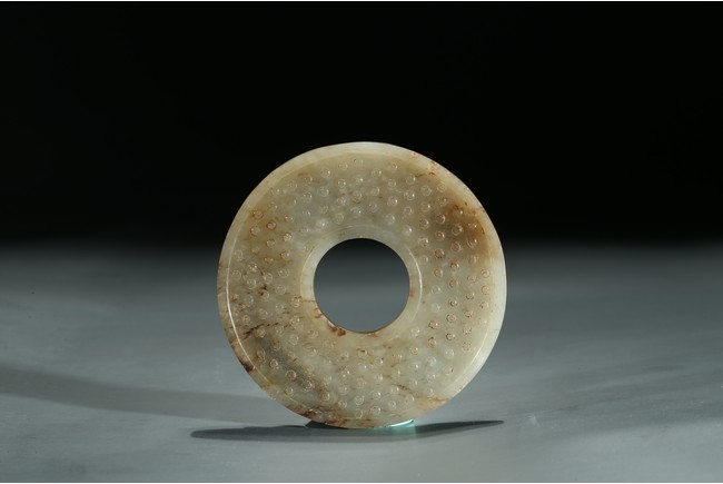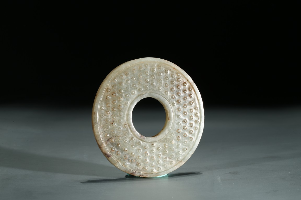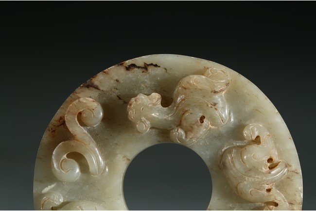 Of circular form, the disc carved to one side with two chilong in high relief, the reverse with dense 'grain' pattern