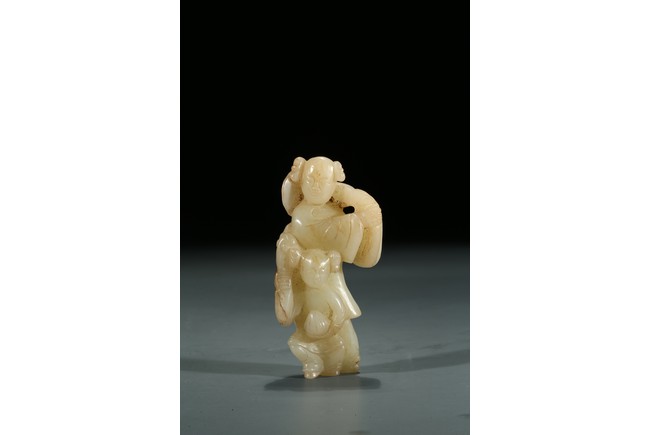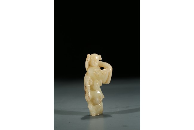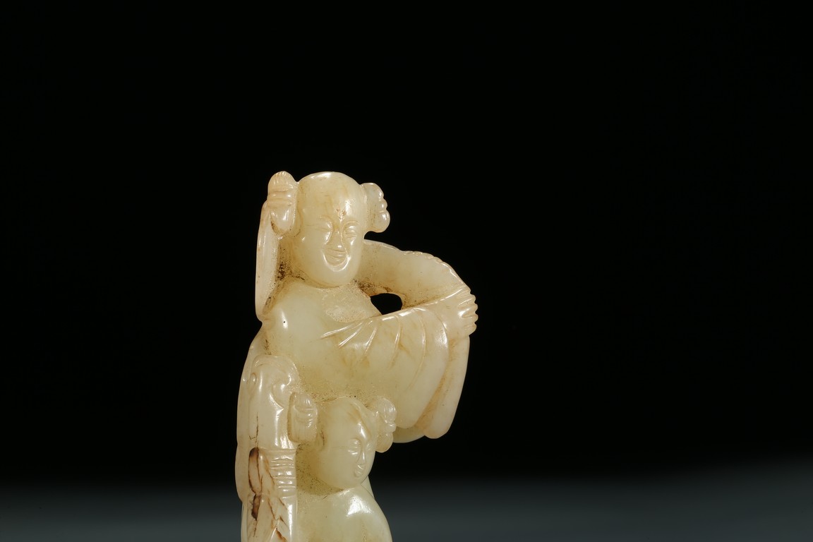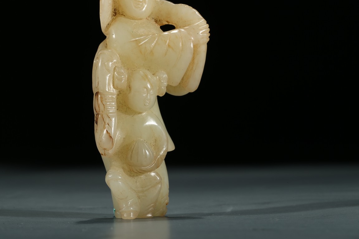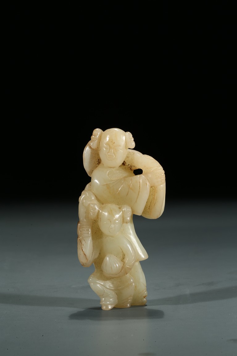 Carved in the form of a lady figure and a child, the former shown carrying a lotus spray and latter with one hand holding a peach.