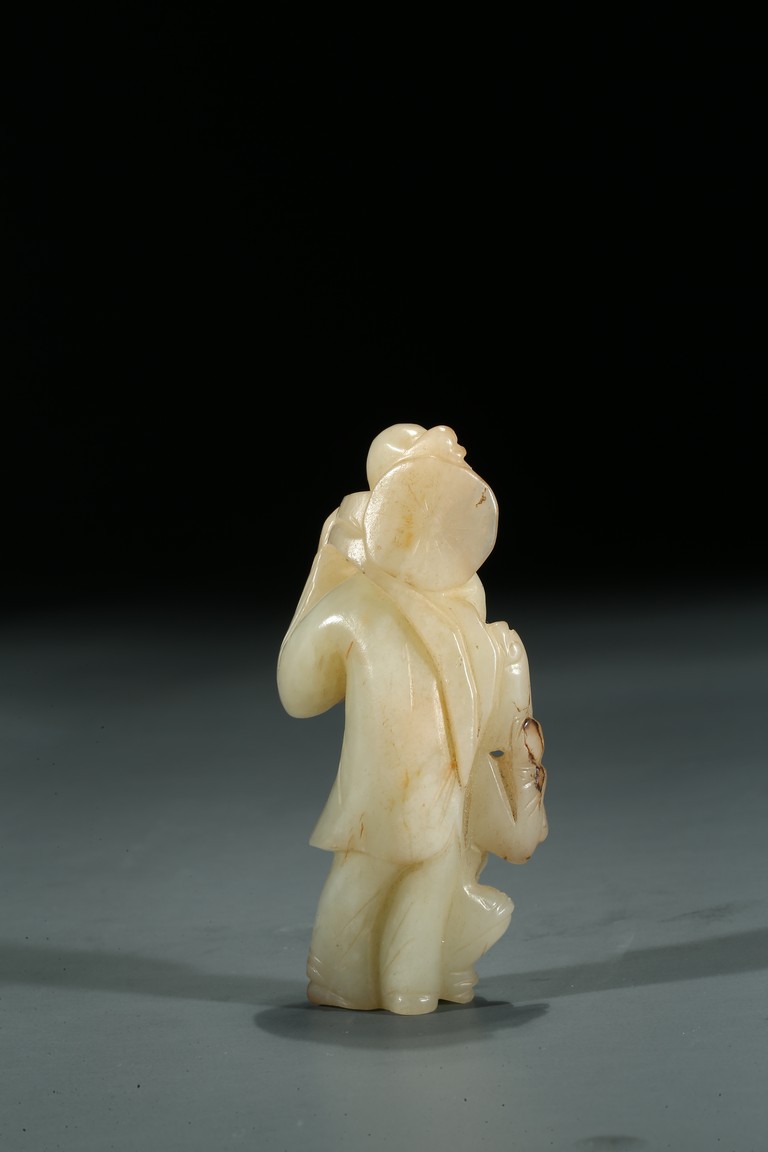 童子白玉質地圓雕,玉質細膩溫潤,。整體作一大一小兩童子造型,小童子半蹲於大童子身前,呈玩耍嬉戲狀。整體造型喜慶而獨特,寓意福祿雙全、人上有人。雕琢傳神有趣,適合陳設把玩。