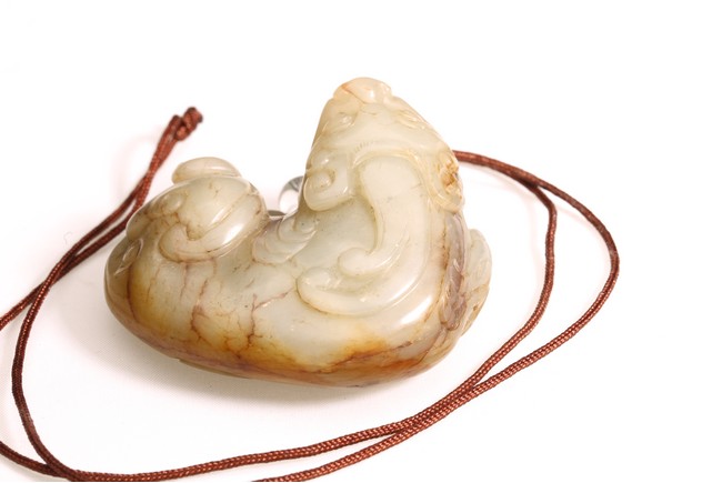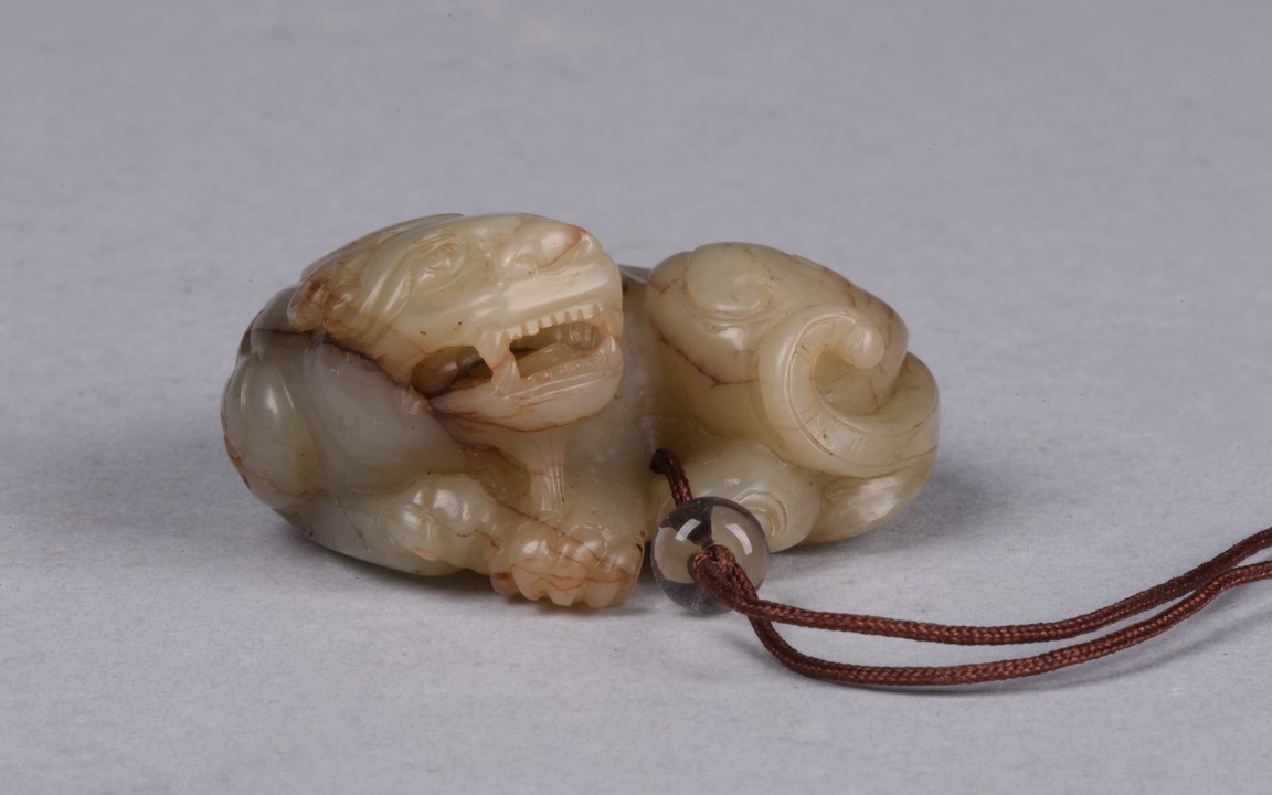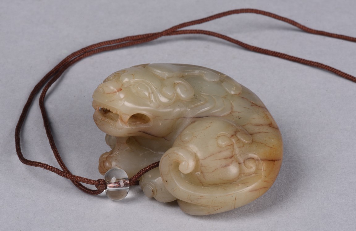 Qing Dynasty period. The recumbent foo dog is carved with mouth agape, bulging eyes and powerful nose, body with curled fur, the stone is of celadon white tone with russet veins.