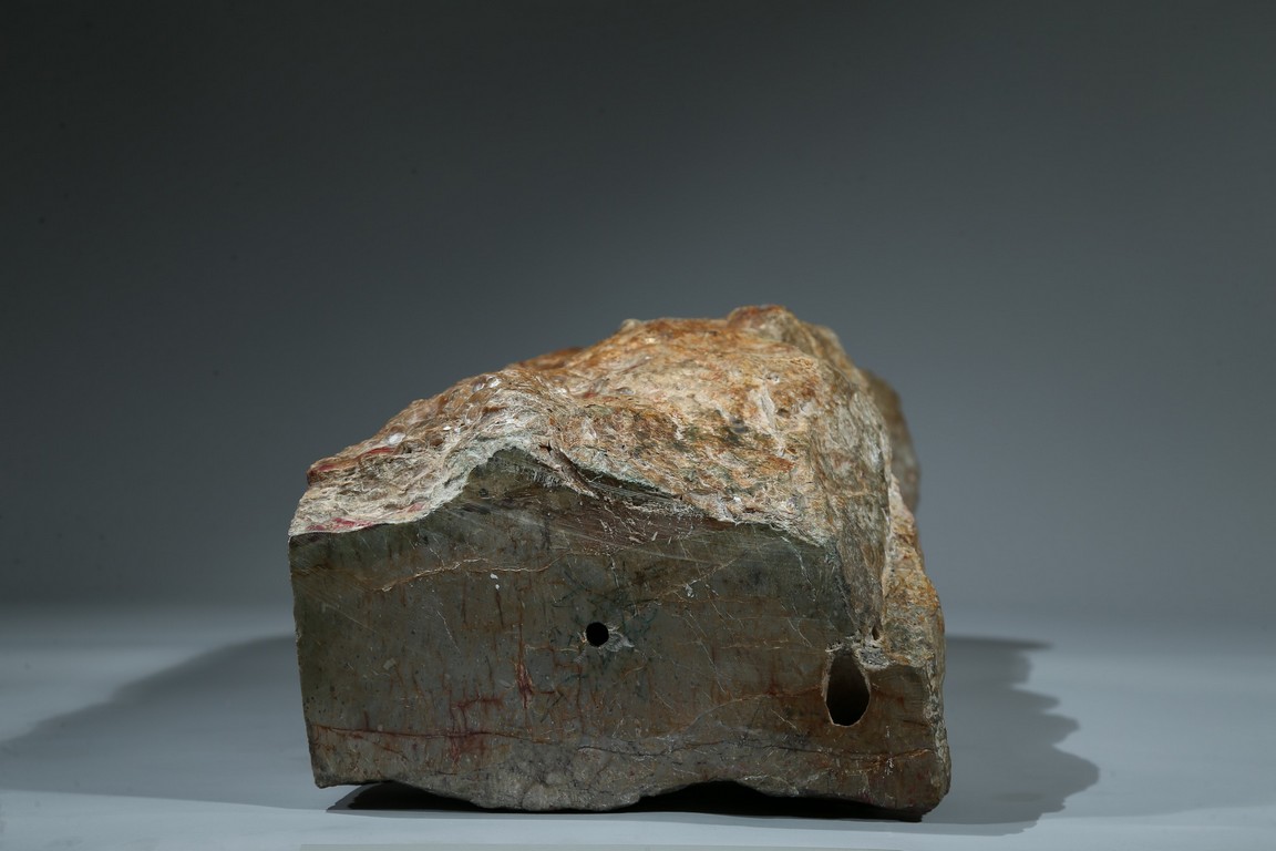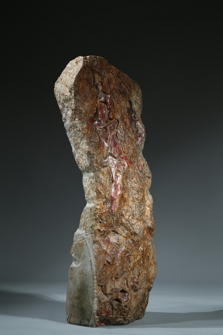 Of naturalistic irregular form, this rare large upright boulder with ochre tone skin exposed to reveal the inside bright red 'chicken-blood' inclusions. 'chicken-blood' is one of the most valued material in Chinese culture, and red is traditionally considered symbolic of good luck, soapstone of this color was gifted on occasions of marriage, birthdays, promotions and success.
