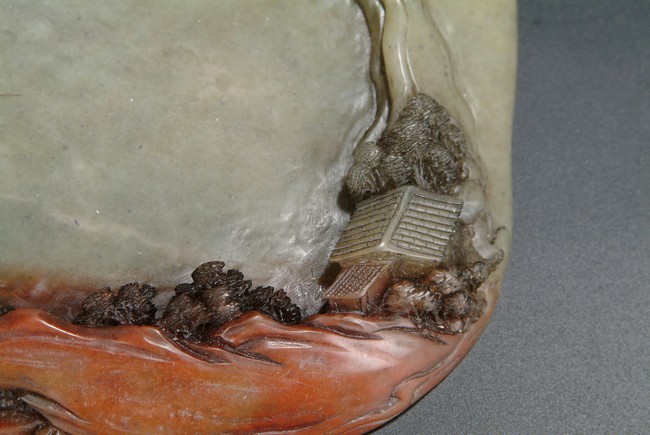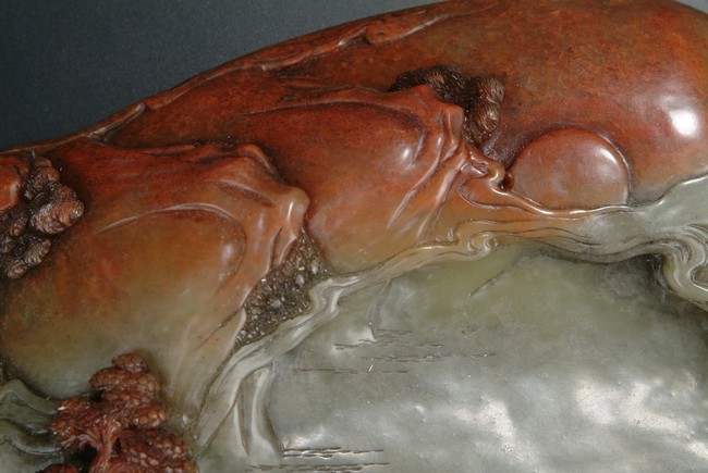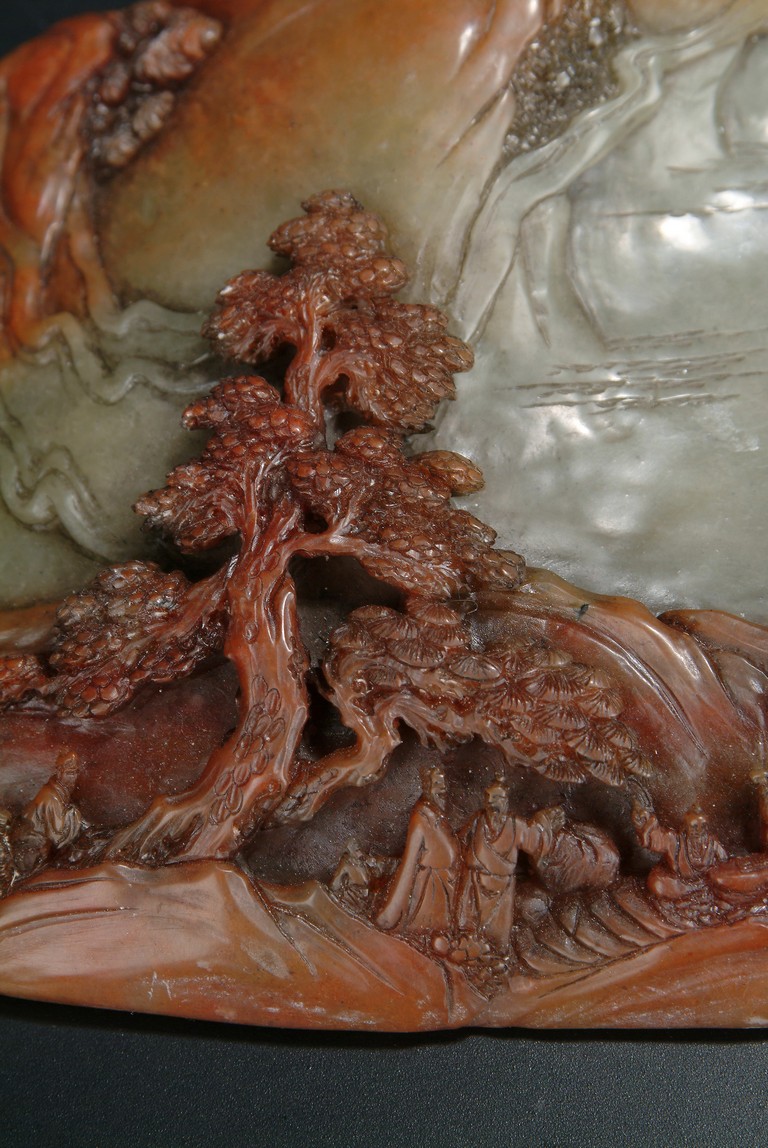 Republic period. A delicate brush washer carved in relief depicting a mountainous scene, comprising two elders under a pine tree leisurely taking a walk towards a small cottage on the far right. The stone's darker tones were cleverly utilized to emphasize the subjects.