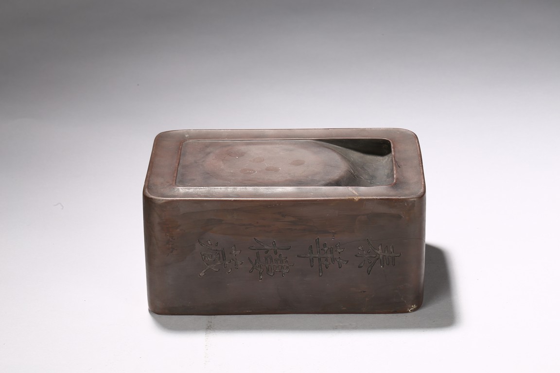 The rectangular inkstone is carved on top with a shaped grinding surface, the side finely incised with a four character inscription.