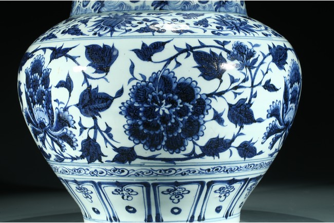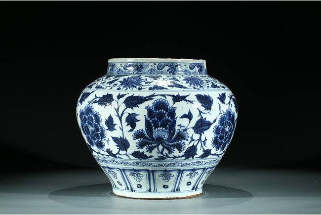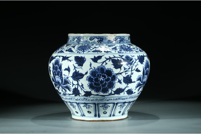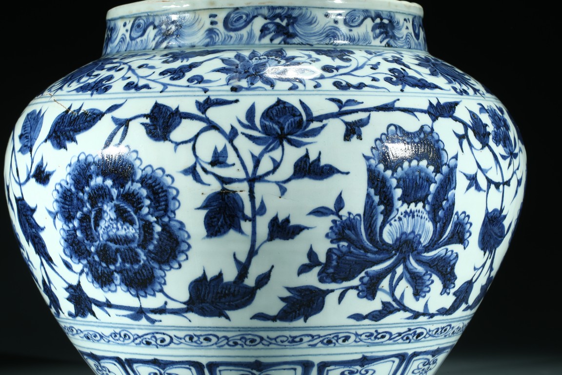 此罐造型別緻,紋飾纖麗典雅,刻畫筆法精準流暢,製作工藝精細,在粗獷樸雅面貌風行一時的作品中,屬別開生面的上乘之作。此罐唇口,短頸,溜肩,鼓腹,圈足。罐身胎體白潤細堅,釉面肥腴,膩白閃青。通體以青花繪製五層紋飾,頸部繪海浪紋一週,肩部繪纏枝蓮紋一週,腹部繪以纏枝牡丹紋一週,腹下部與足脛部之間繪一圈卷草紋作分隔,足脛部繪蓮瓣紋一週。其青花髮色深沈含蓄,藍中泛黑,品貌俱佳,時代特徵明顯,精品佳作,唯有口沿一處殘缺,略帶遺憾。