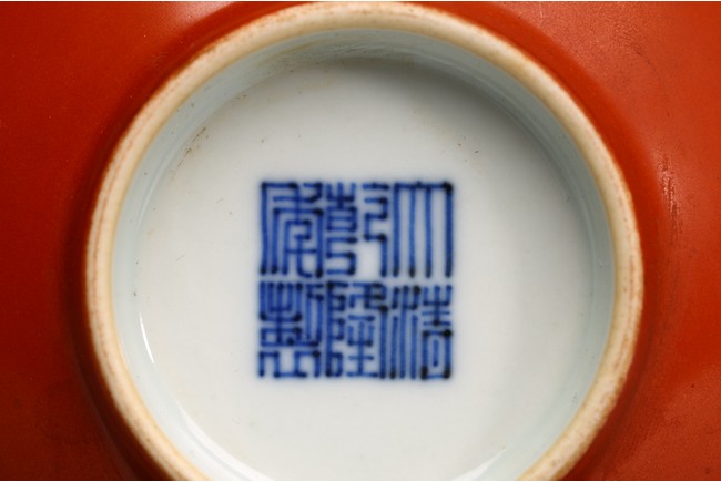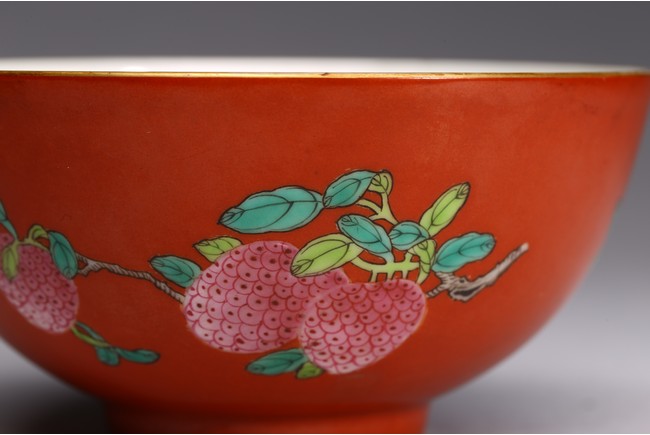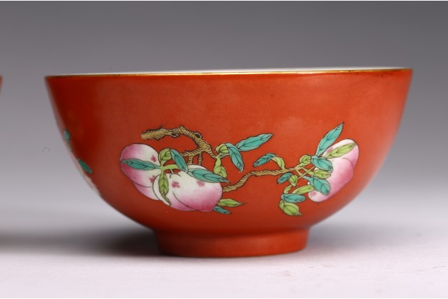 Qing Dynasty period. Each bowl exterior painted with pomegranates reserve in red ground, base with mark.