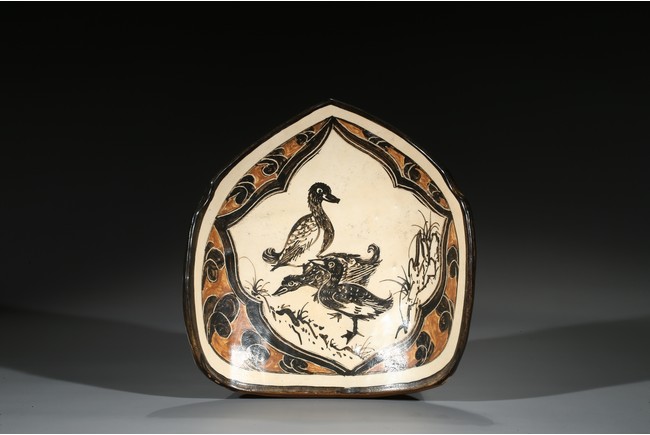 Of ruyi form, painted to the surface with three Mandarin ducks, covered overall with white glaze stopping above the base.