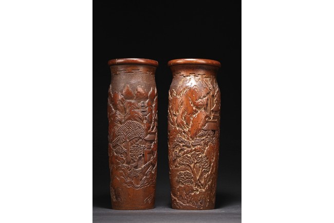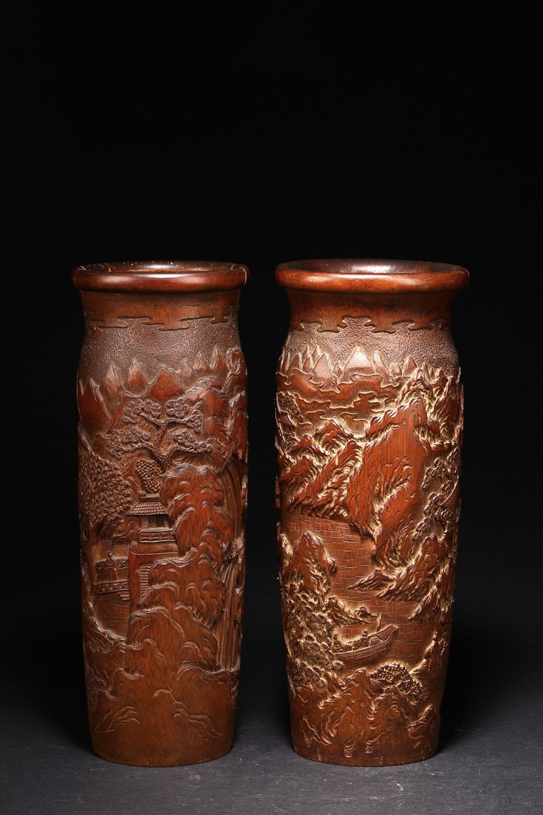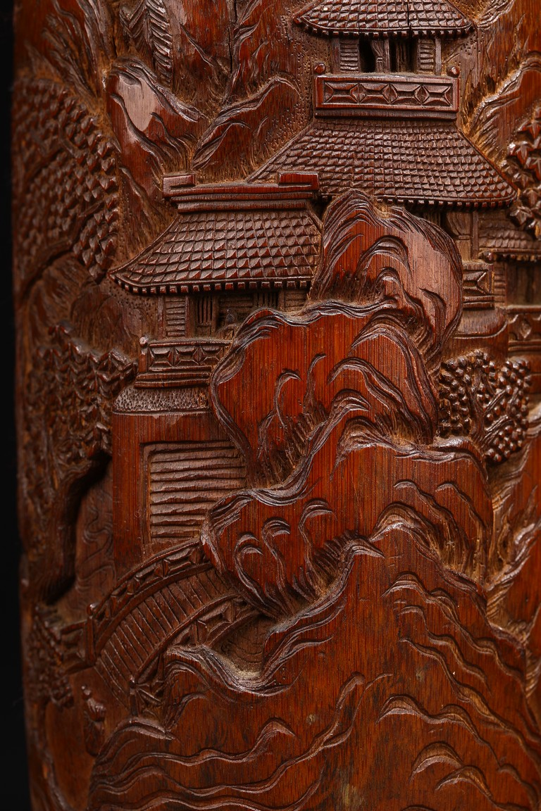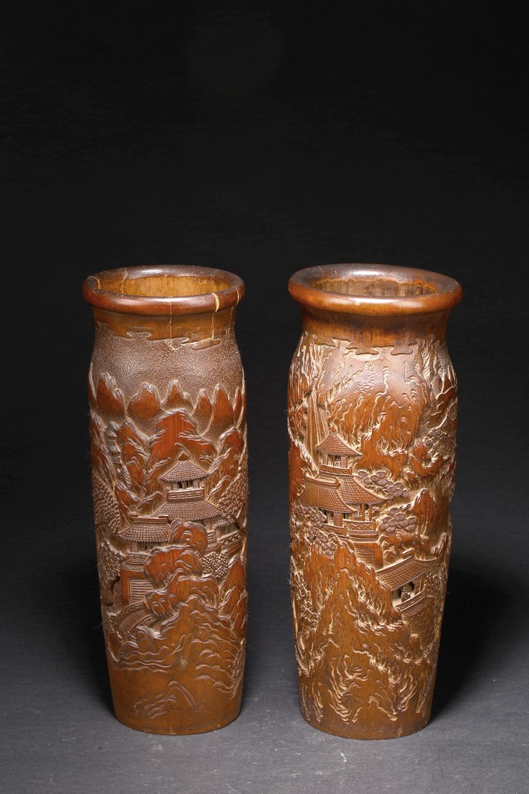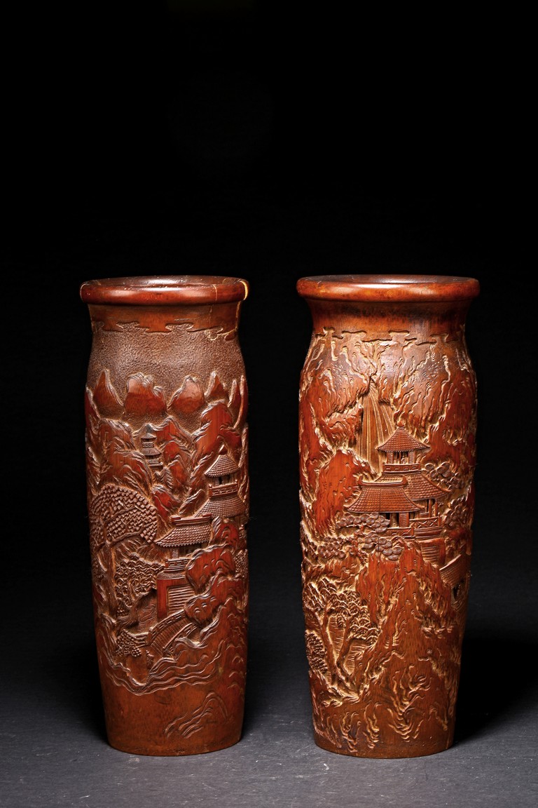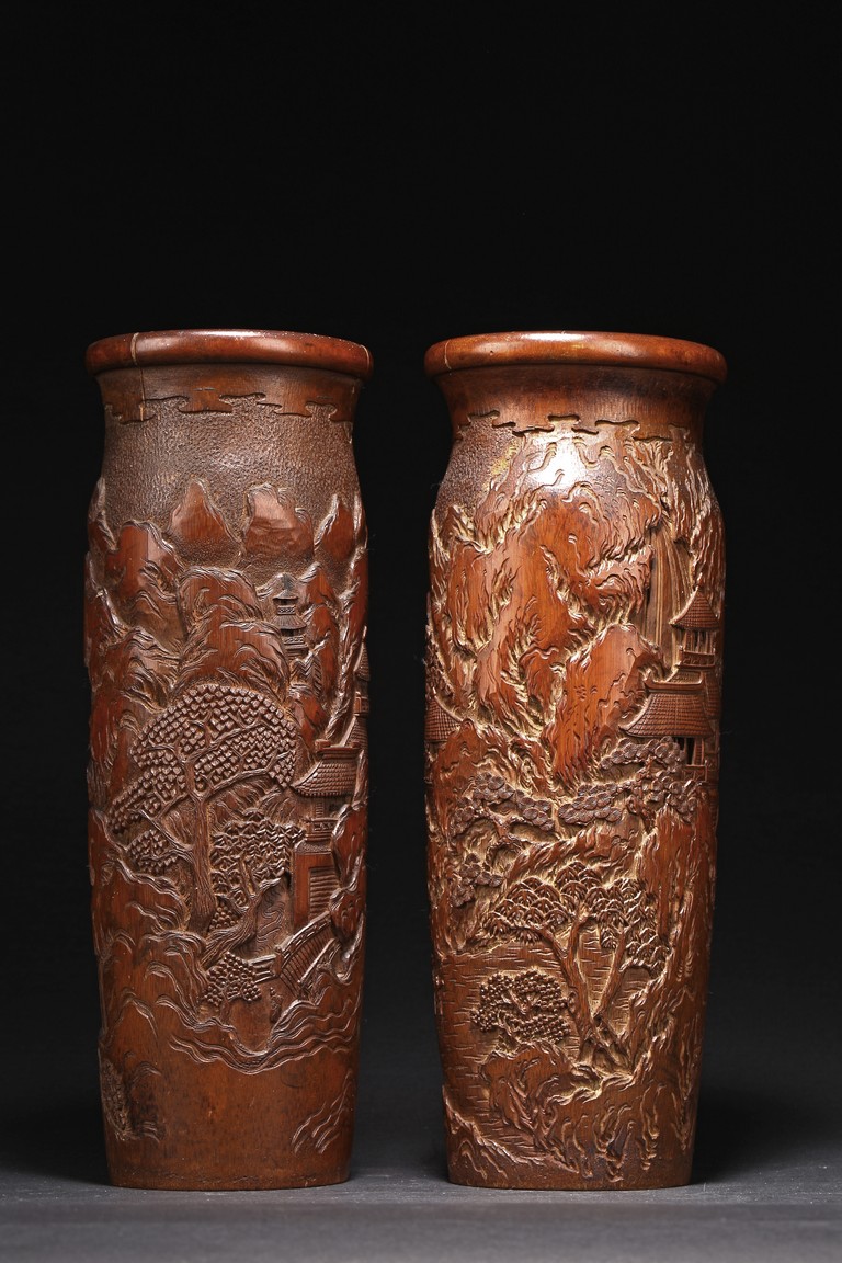 Late Qing Dynasty period. Each of cylindrical form, the body carved in relief with pavilions and palaces within rocky mountain landscapes.