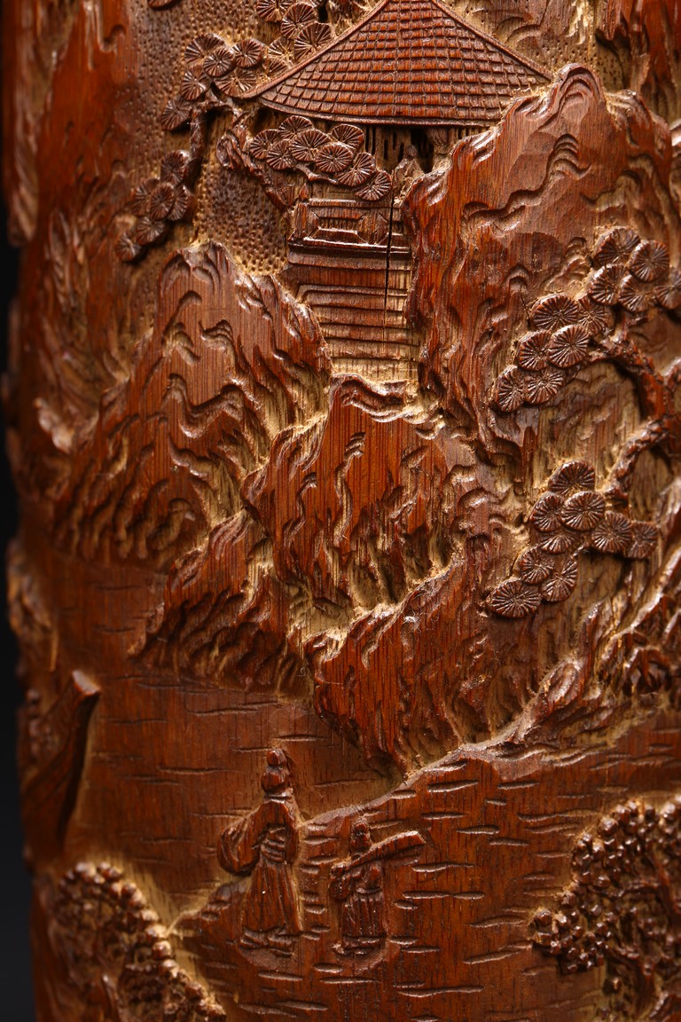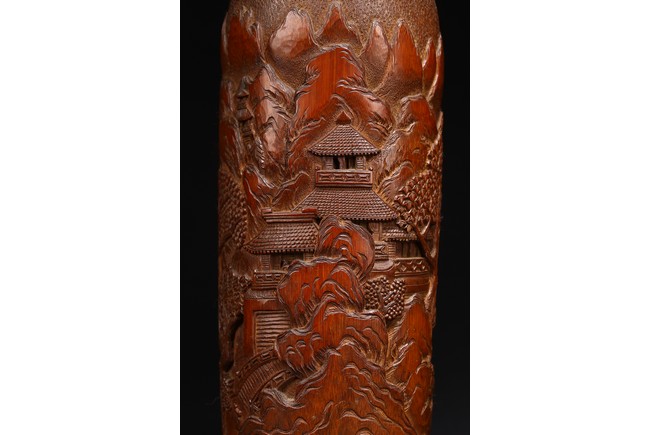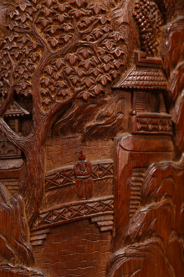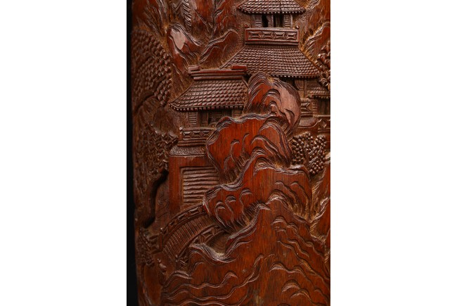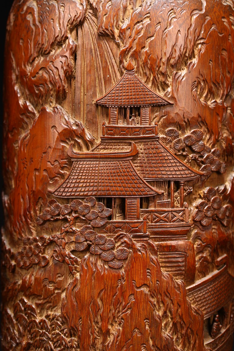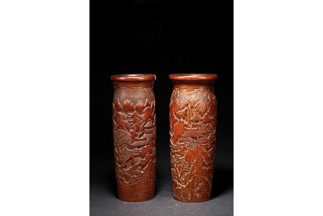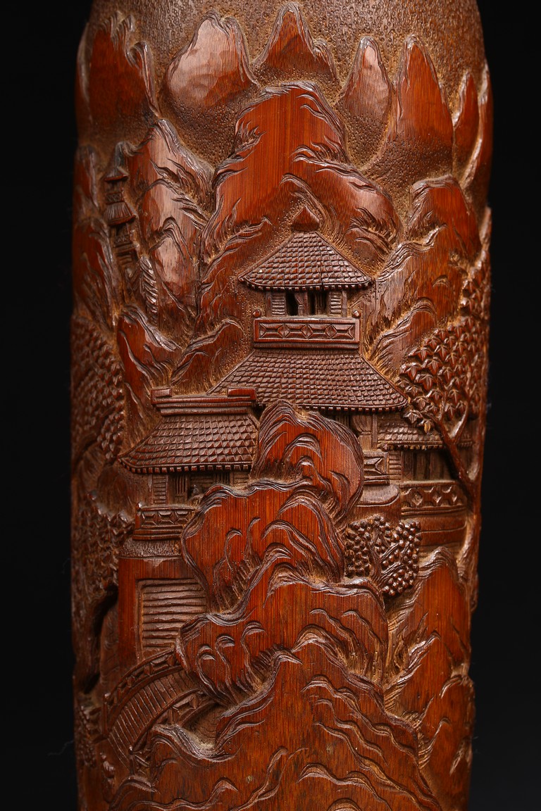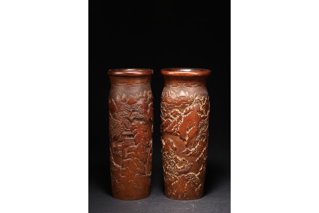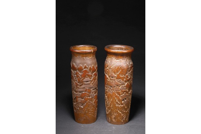 Late Qing Dynasty period. Each of cylindrical form, the body carved in relief with pavilions and palaces within rocky mountain landscapes.