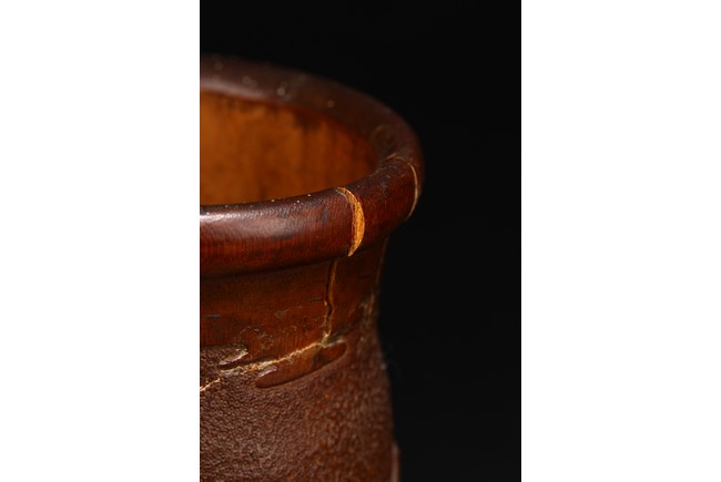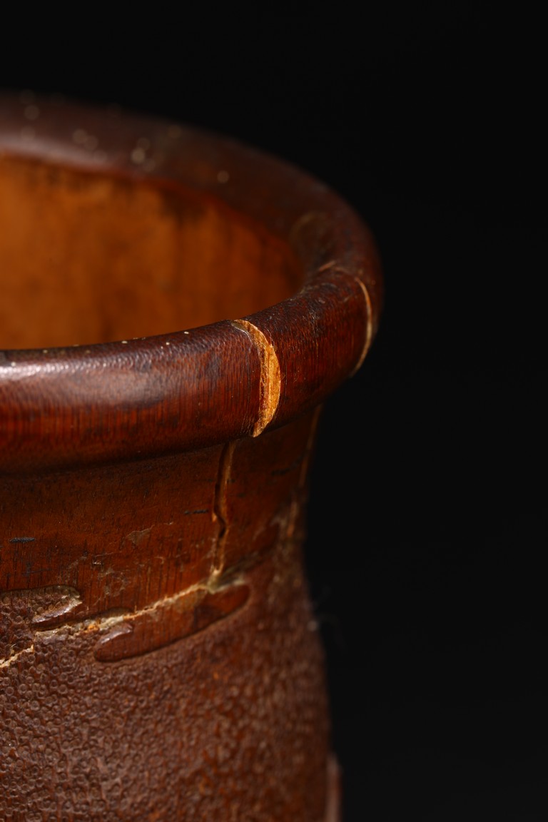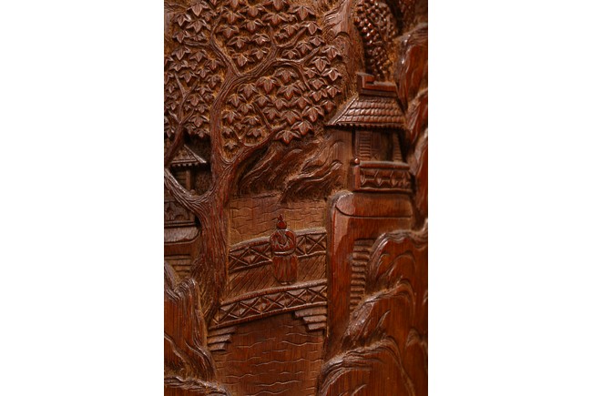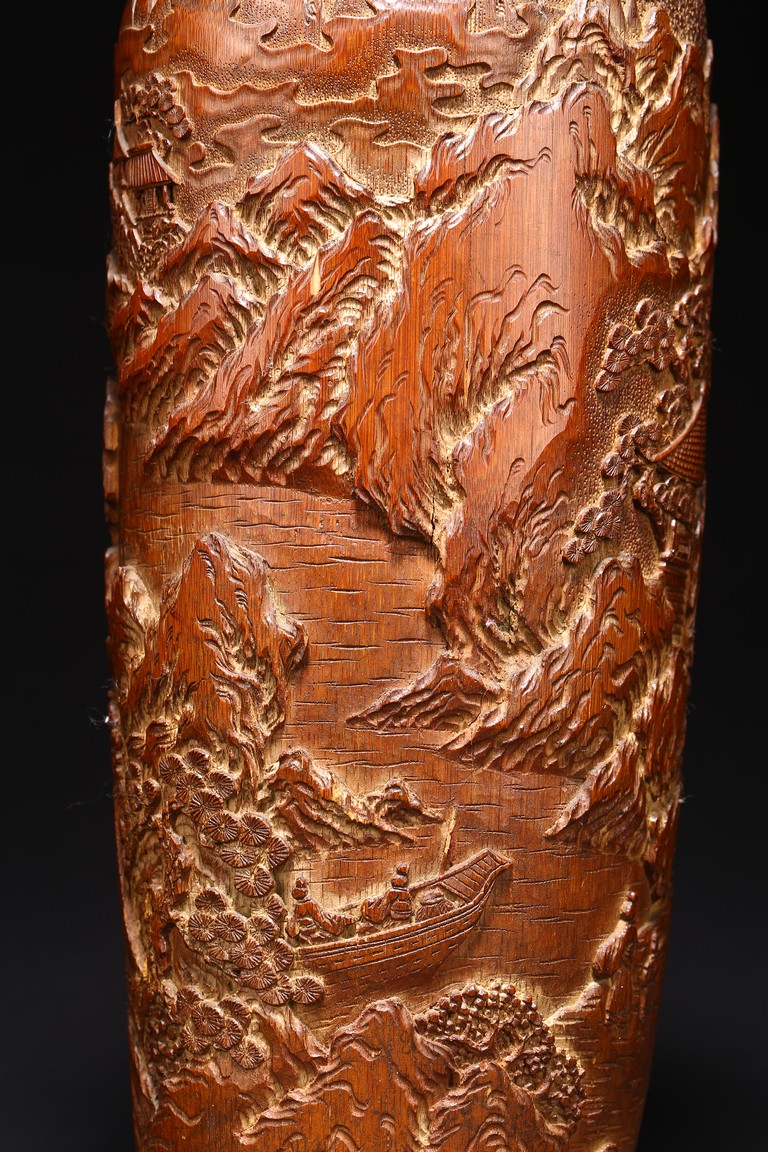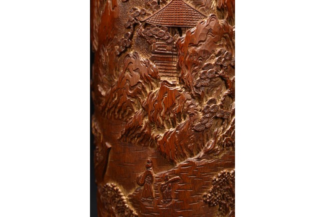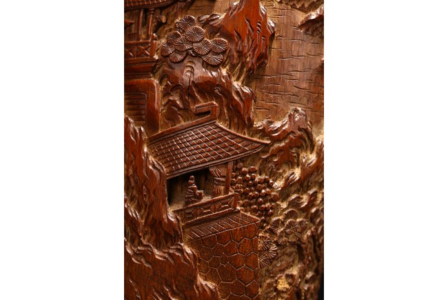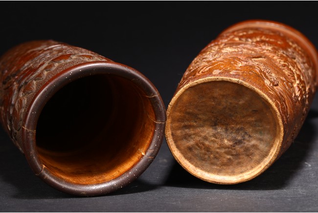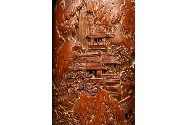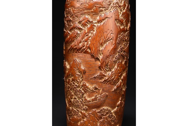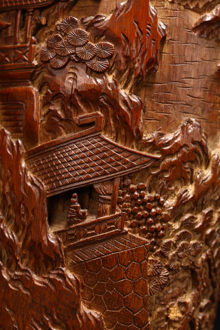 Late Qing Dynasty period. Each of cylindrical form, the body carved in relief with pavilions and palaces within rocky mountain landscapes.