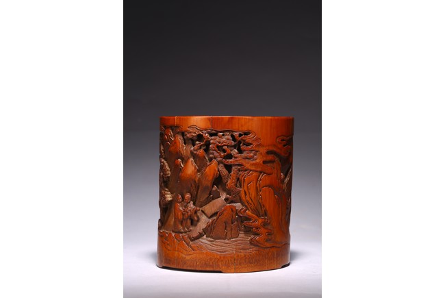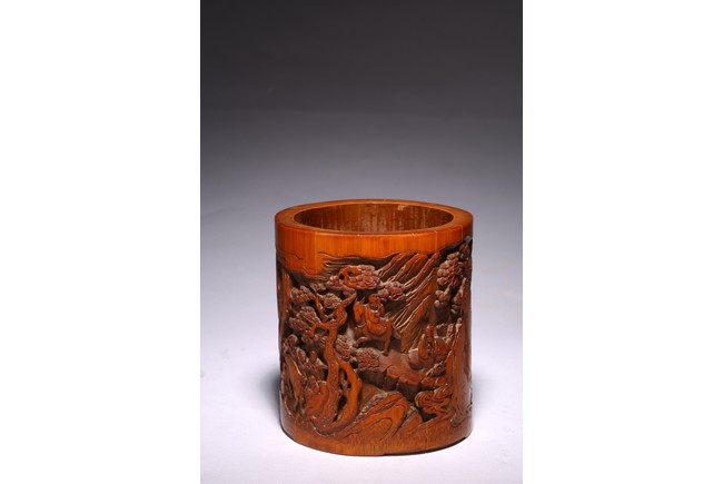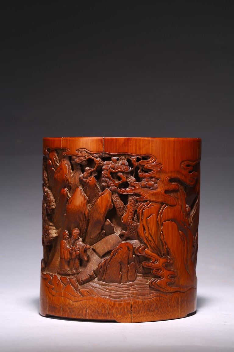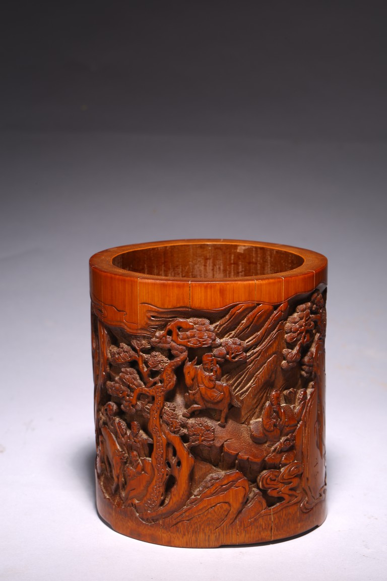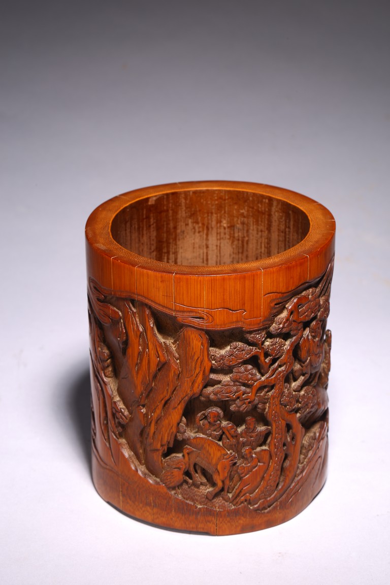 竹根雕是竹刻家族中的一個支脈,是質樸高雅的審美特征,更受文人士大夫的青睞。此筆擱大小適中,入手盈握,打磨精細,包漿明亮。清雅之極。上刻“鶴壽”二字,下方刻仙鶴回首側望,鶴在人們心目中是祥瑞之鳥,其地位在百鳥中僅次於傳說中的鳳凰。象征忠貞、吉祥、長壽等意。筆筒圓形,下承四足,外壁以通景形式刻山水人物,巨石插立江中,湍流洶湧。橫雲煙嵐,橫亙繚繞,茂密虬松,氣勢撼人極盡深遠、幽邃之境,儼然如畫。人物神情、姿態各異,眉目宛然,衣褶清晰,堪稱鬼斧神工,令人嘆為觀止。“三仙”款識。