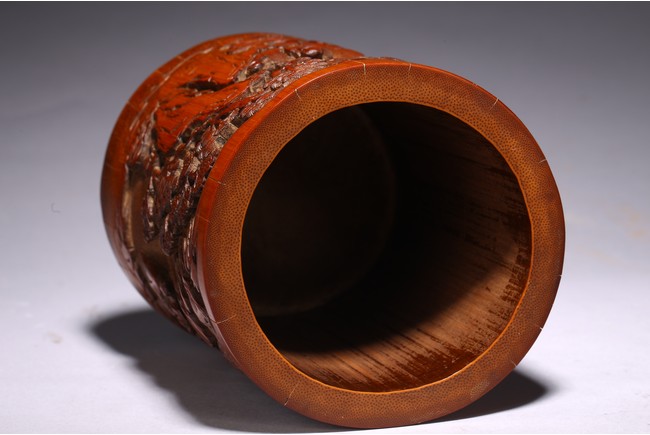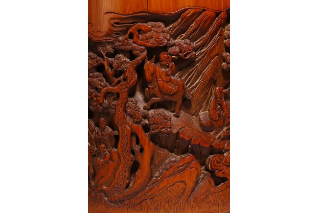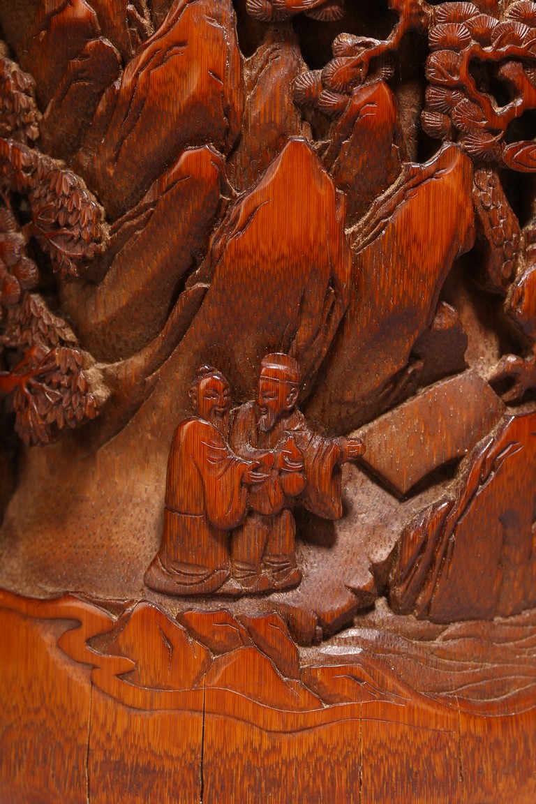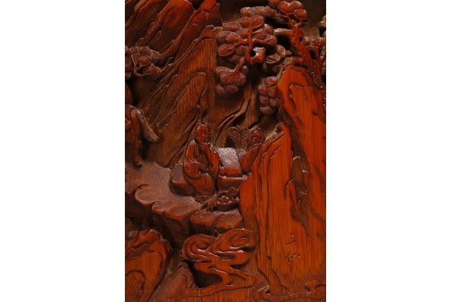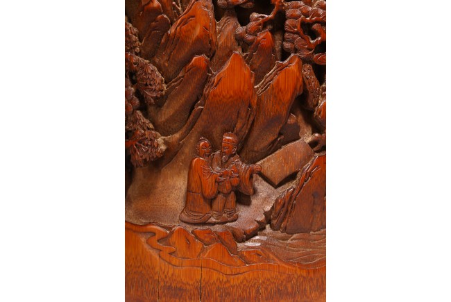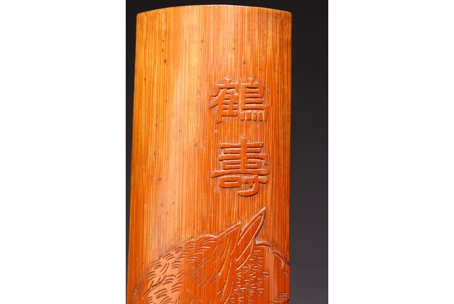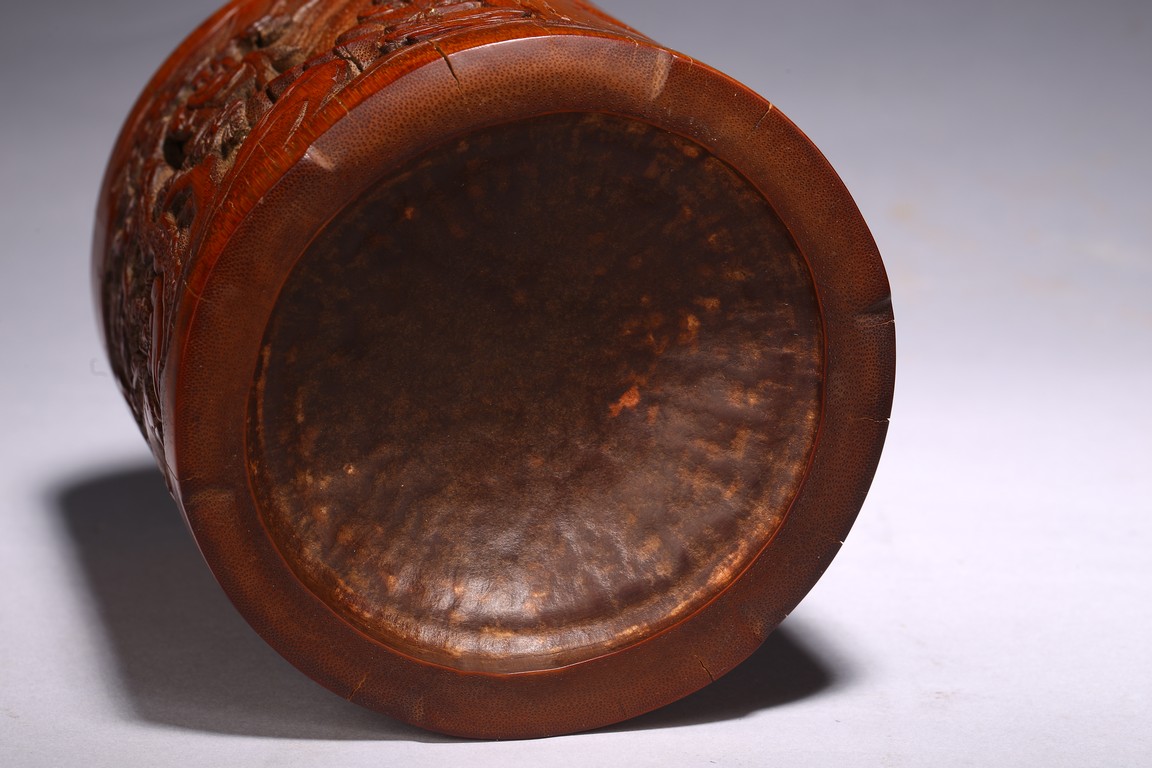 竹根雕是竹刻家族中的一個支脈,是質樸高雅的審美特征,更受文人士大夫的青睞。此筆擱大小適中,入手盈握,打磨精細,包漿明亮。清雅之極。上刻“鶴壽”二字,下方刻仙鶴回首側望,鶴在人們心目中是祥瑞之鳥,其地位在百鳥中僅次於傳說中的鳳凰。象征忠貞、吉祥、長壽等意。筆筒圓形,下承四足,外壁以通景形式刻山水人物,巨石插立江中,湍流洶湧。橫雲煙嵐,橫亙繚繞,茂密虬松,氣勢撼人極盡深遠、幽邃之境,儼然如畫。人物神情、姿態各異,眉目宛然,衣褶清晰,堪稱鬼斧神工,令人嘆為觀止。“三仙”款識。