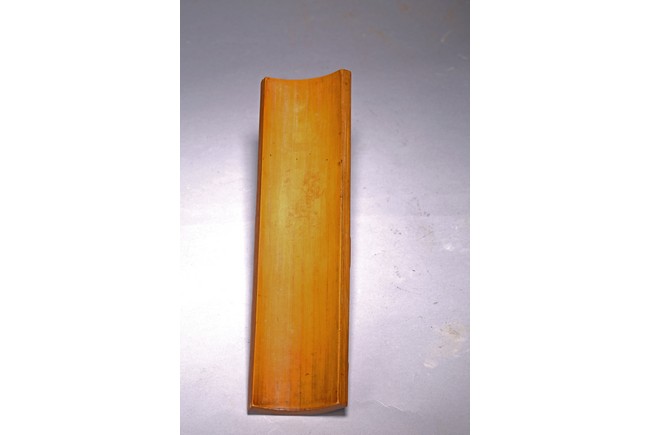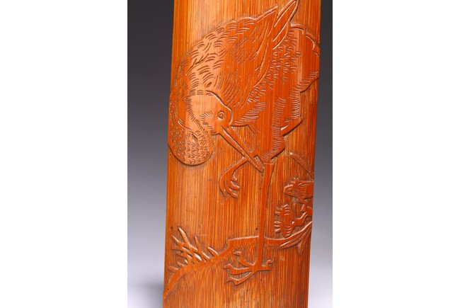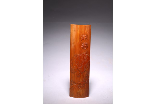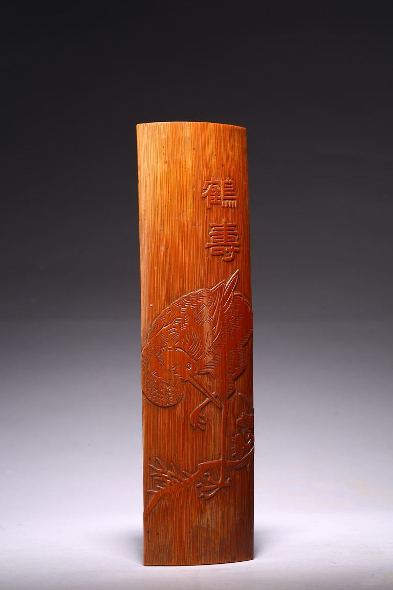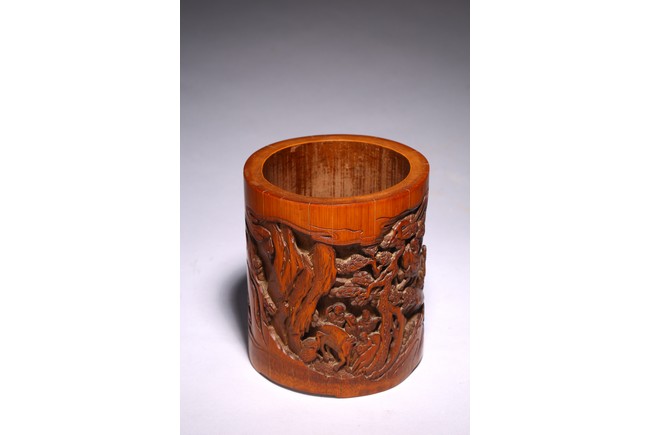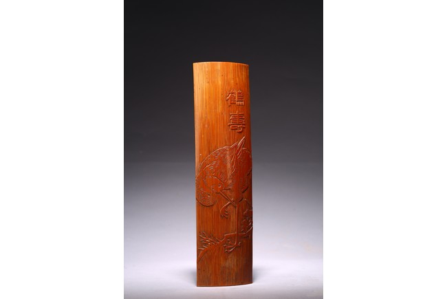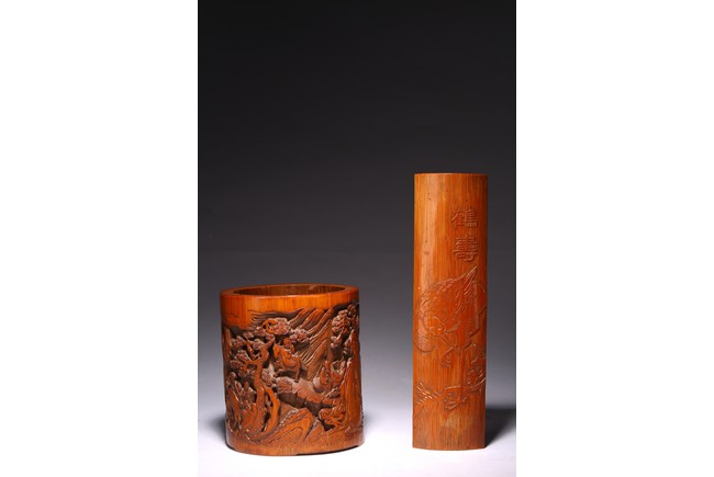 Including a cylindrical brushpot carved in deep relief with figures in a mountain landscape; a wrist rest carved in shallow relief with crane standing on one foot and two characters.