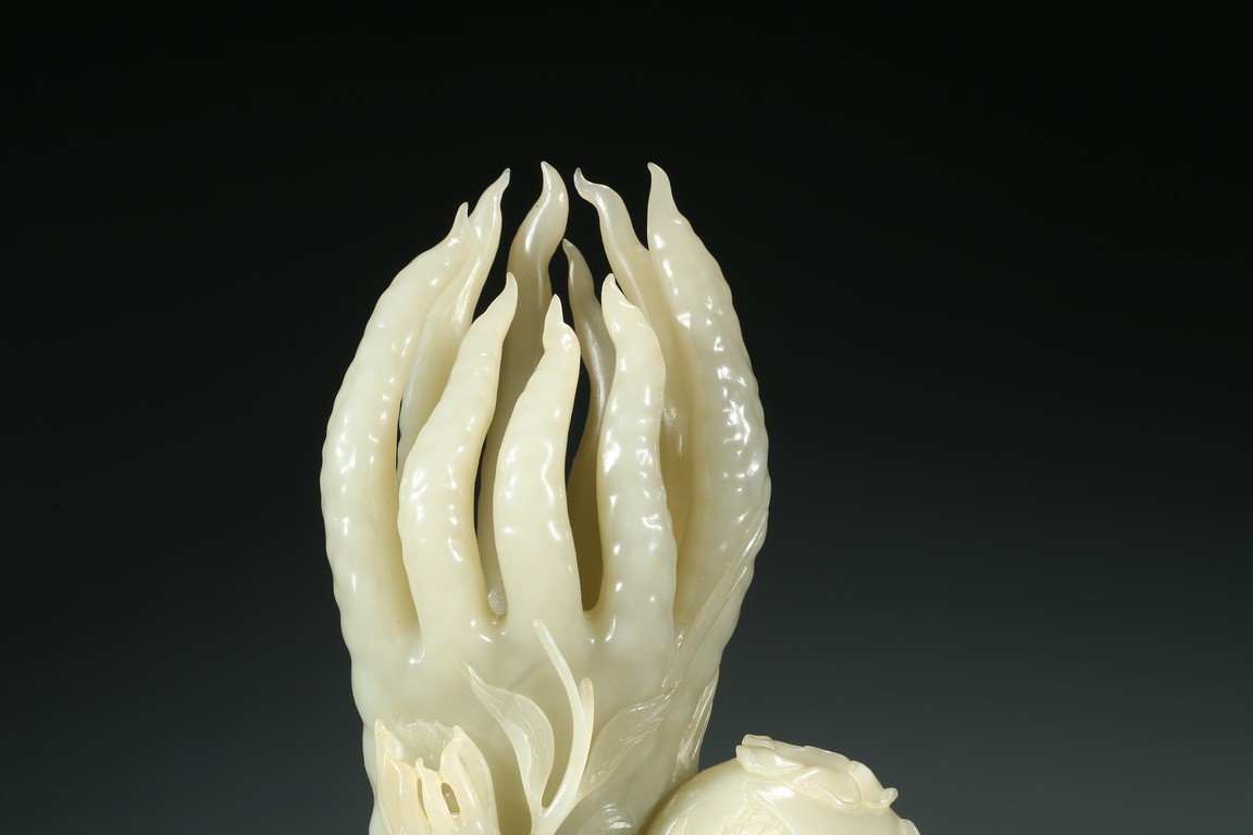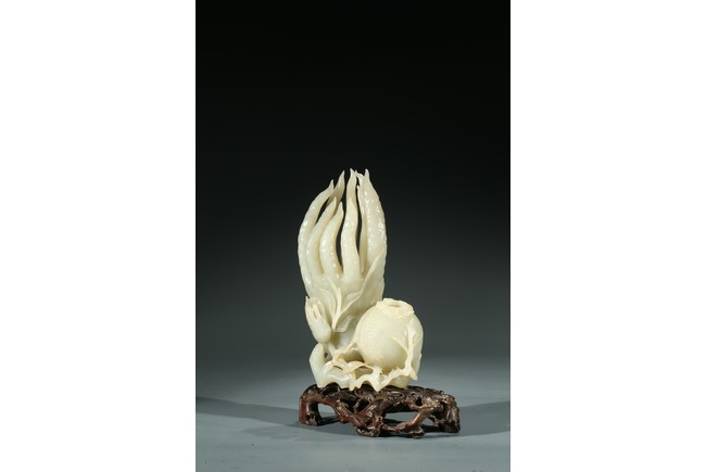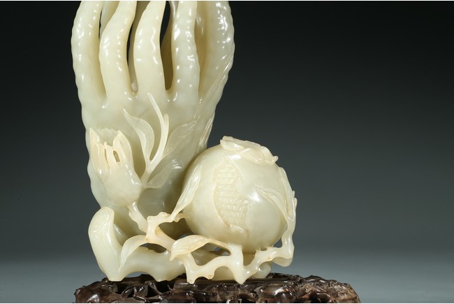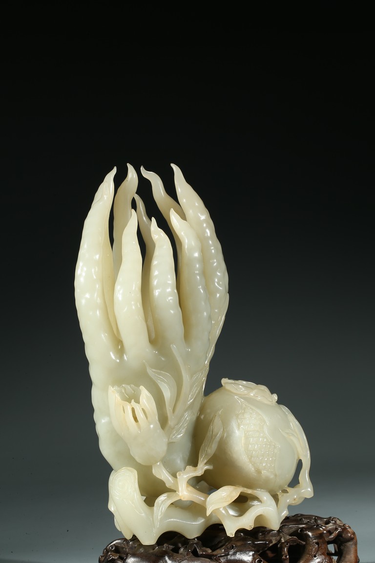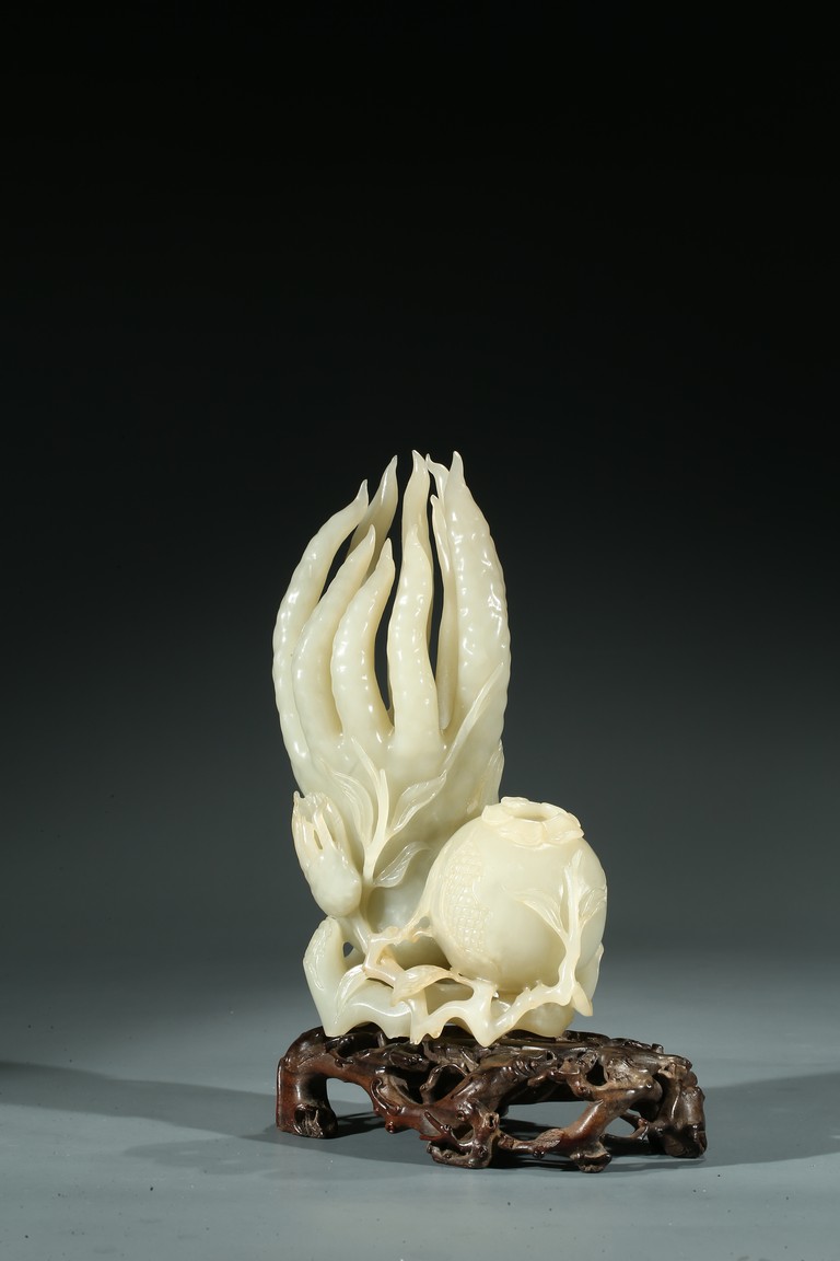 The 'fingers' of the citron curling upwards from a gnarled leafy stem forming the base of the vessel along with a pomegranate next to it, all supported on hardwood stand carved in form of gnarled wood branches.
