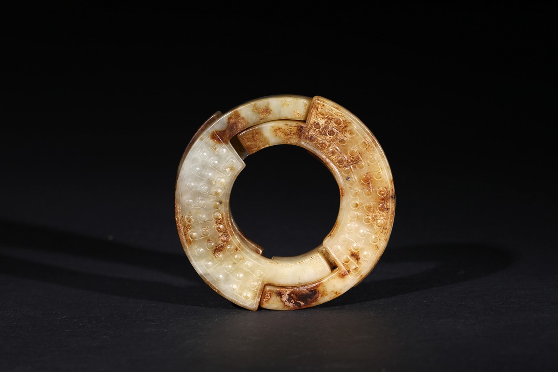 A WHITE AND RUSSET JADE RING CARVING 明 玉活環