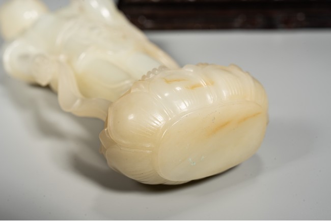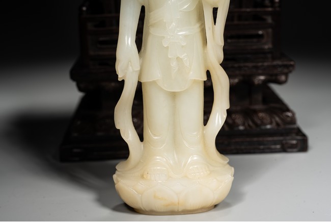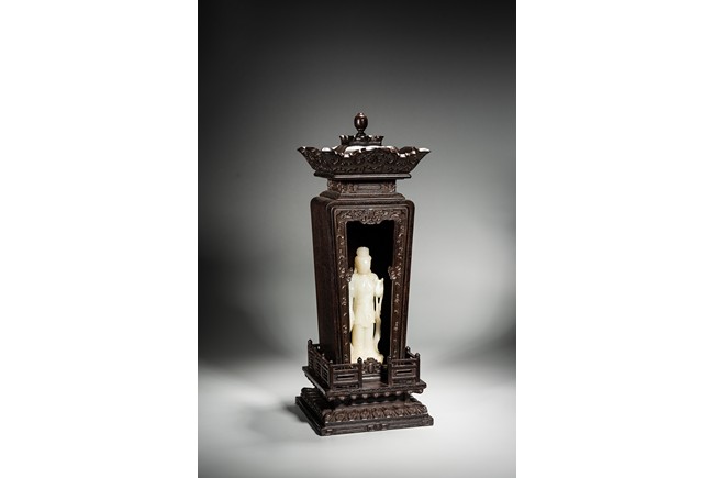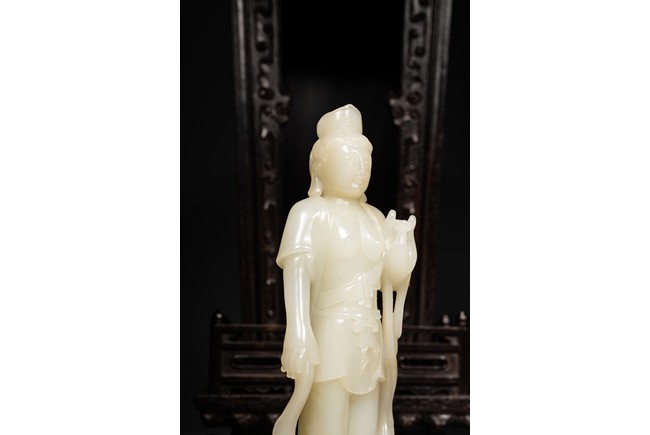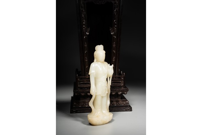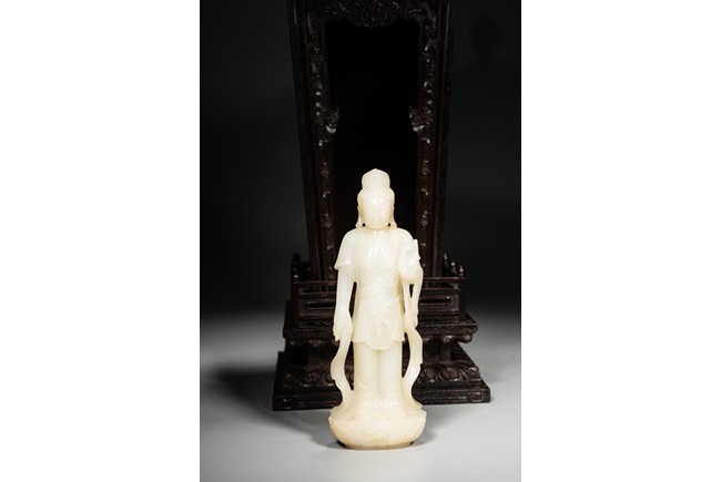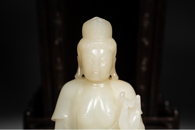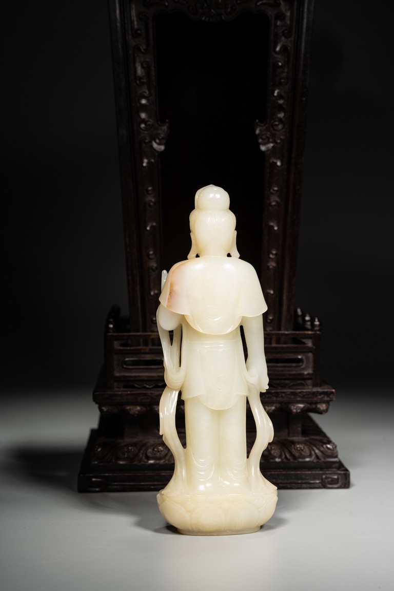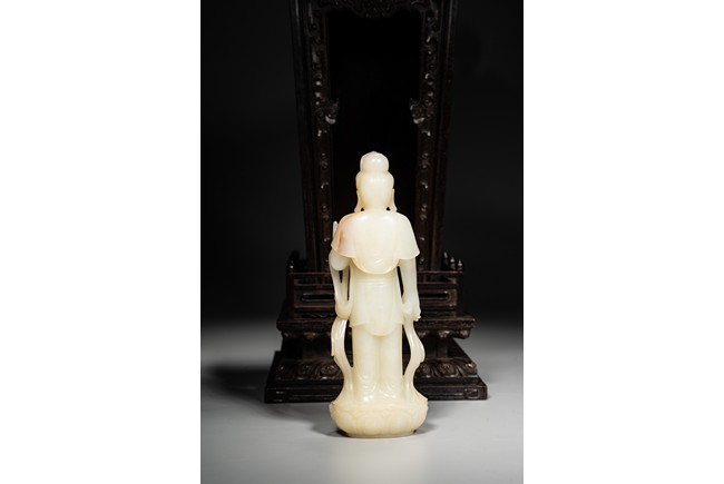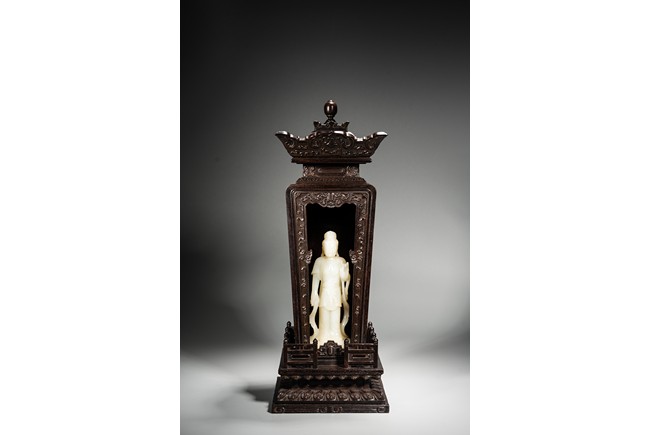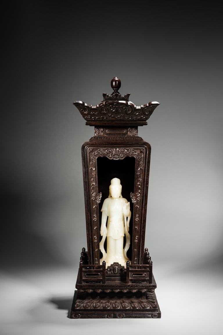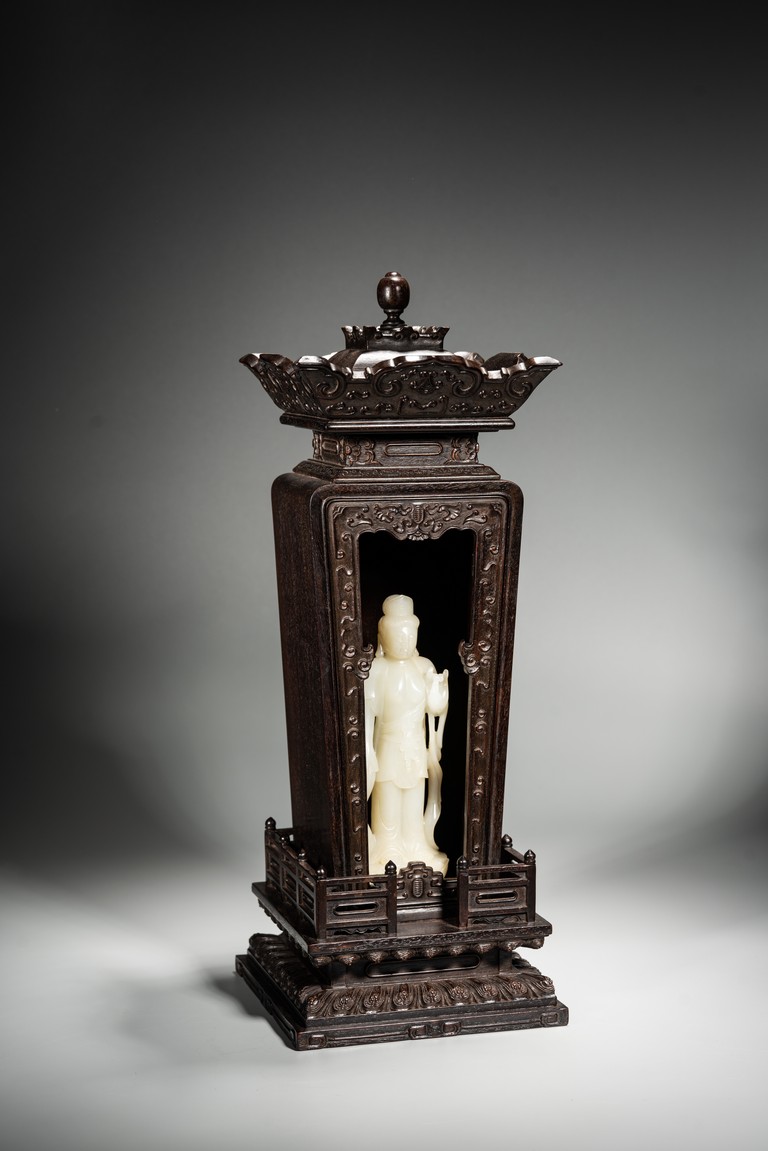 此尊觀音和田白玉材質,玉質細膩瑩潤,觀音束螺发、面貌慈祥、身著紗衣、呈站姿,端莊典雅,原配紫檀僧帽式佛龕,佛龕之物是特指專門放置佛像的地方,一般置於屋舍吉位之上,起到護佑家宅、人事平安的作用。此佛龕用紫檀雕刻而成,形制獨特,比例完美,端莊大氣,雕工精美絕倫,實為難得。