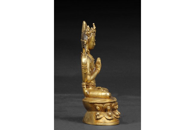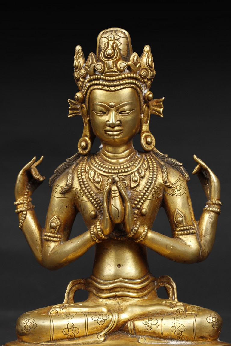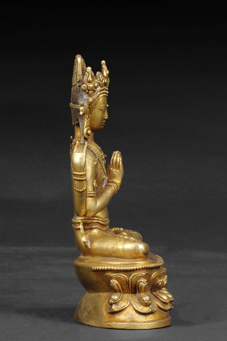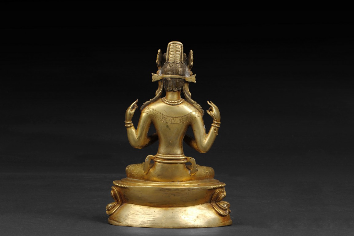 Seated in dhyanasana on a double lotus throne, two hands clasped together with a ritual ornament in-between, other two hands in apana mudra, wearing many ornate bead strands around neck and arm, the Avalokitesvara with a stern expression. Qing Dynasty period.