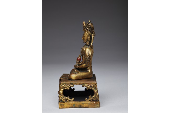 Qing Dynasty period. Shown seated in dhyanasana with the hands in dhyana mudra,wearing a dhoti tied over the left shoulder and adorned with beaded jewellery,the head crowned by pointed tiara,all supported on a tapering rectangular throne above the Qianlong reign mark.