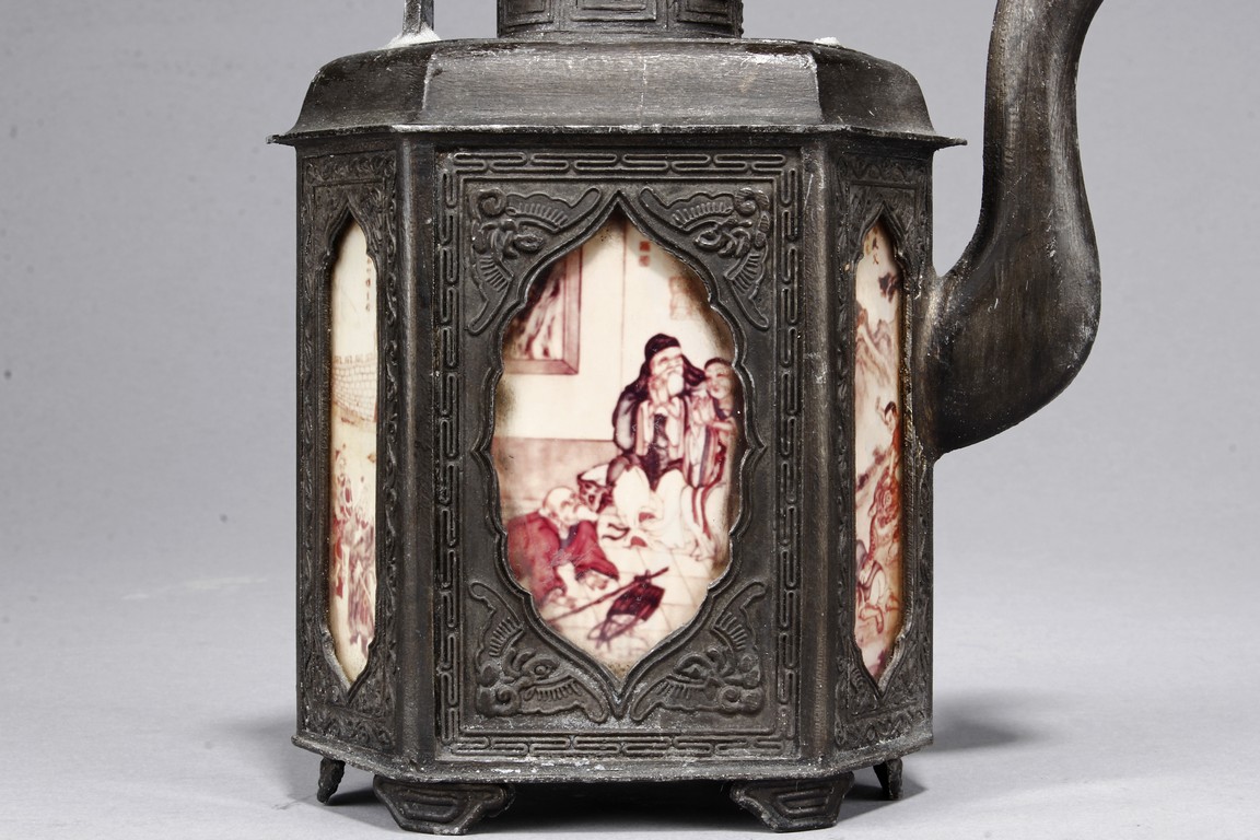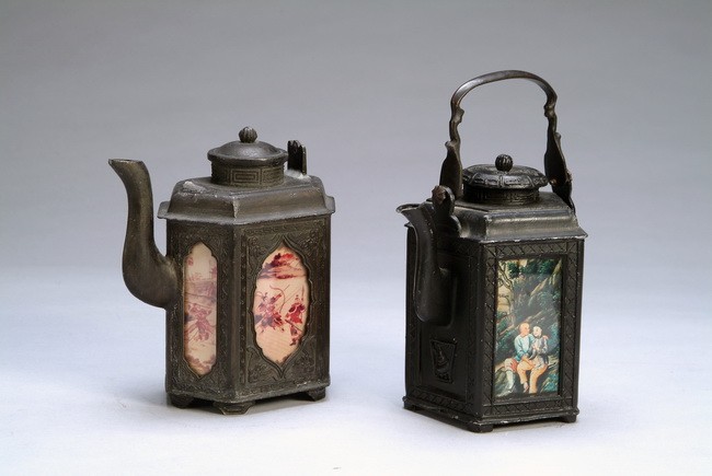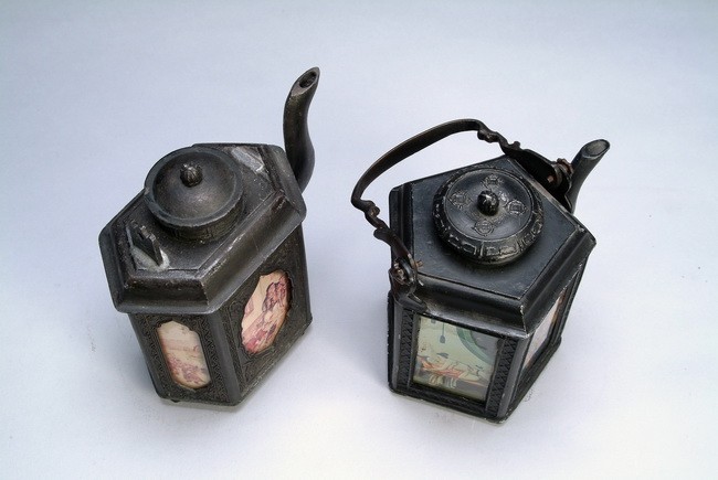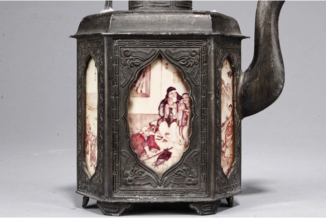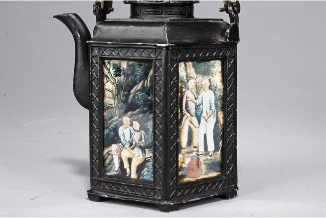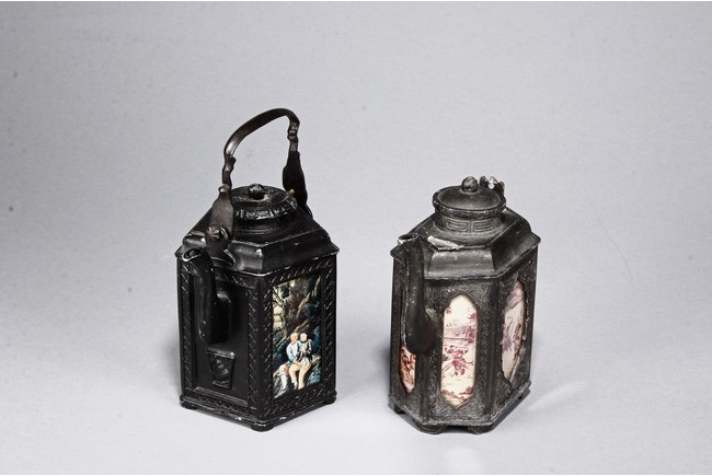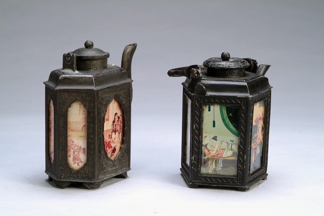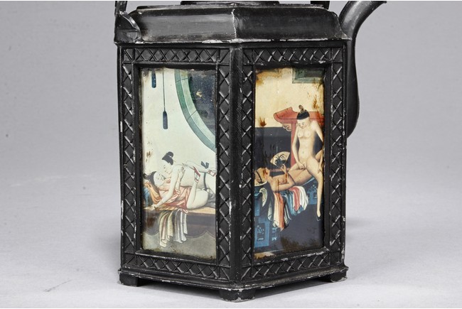 Of octagonal shape, one is painted with erotic scenes in panels; the other painted with historical scenes; the bottom bears a ten character mark.