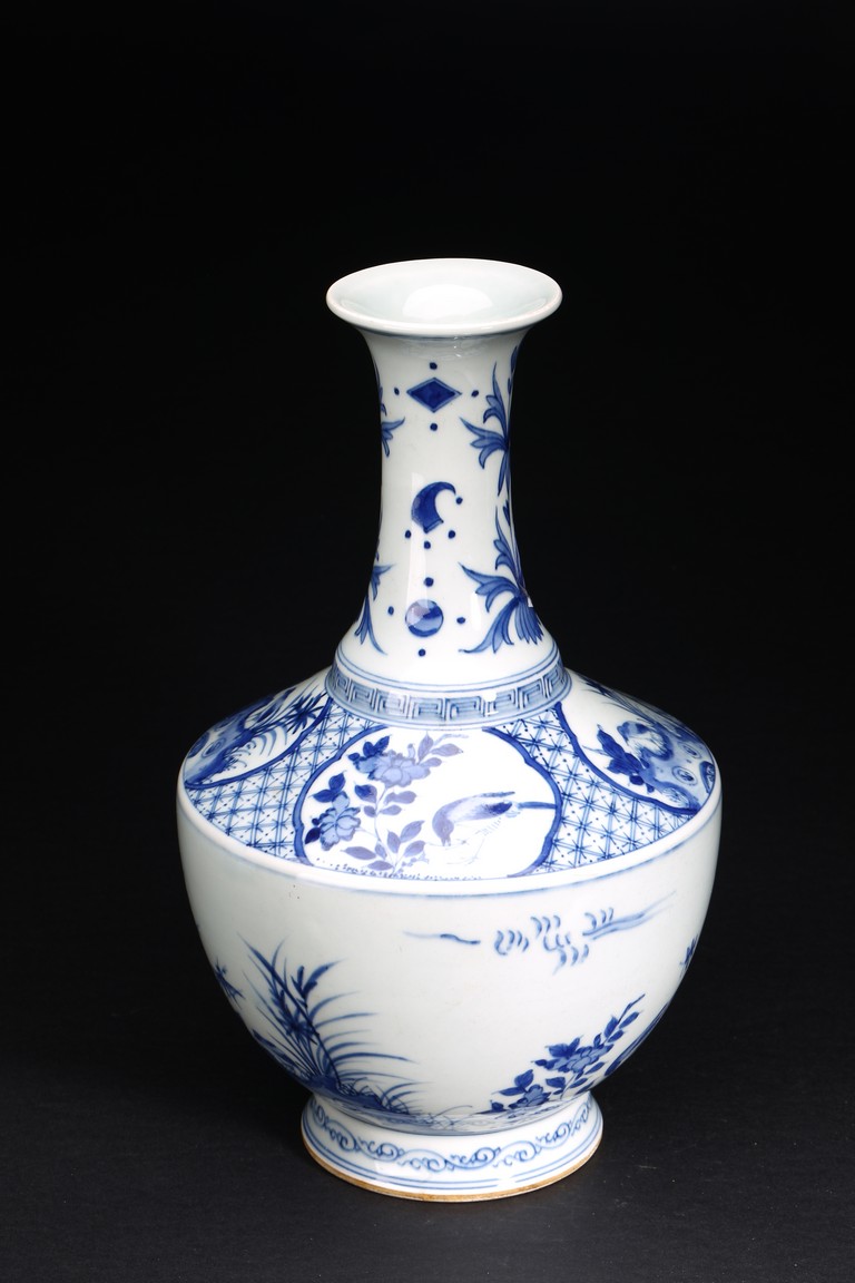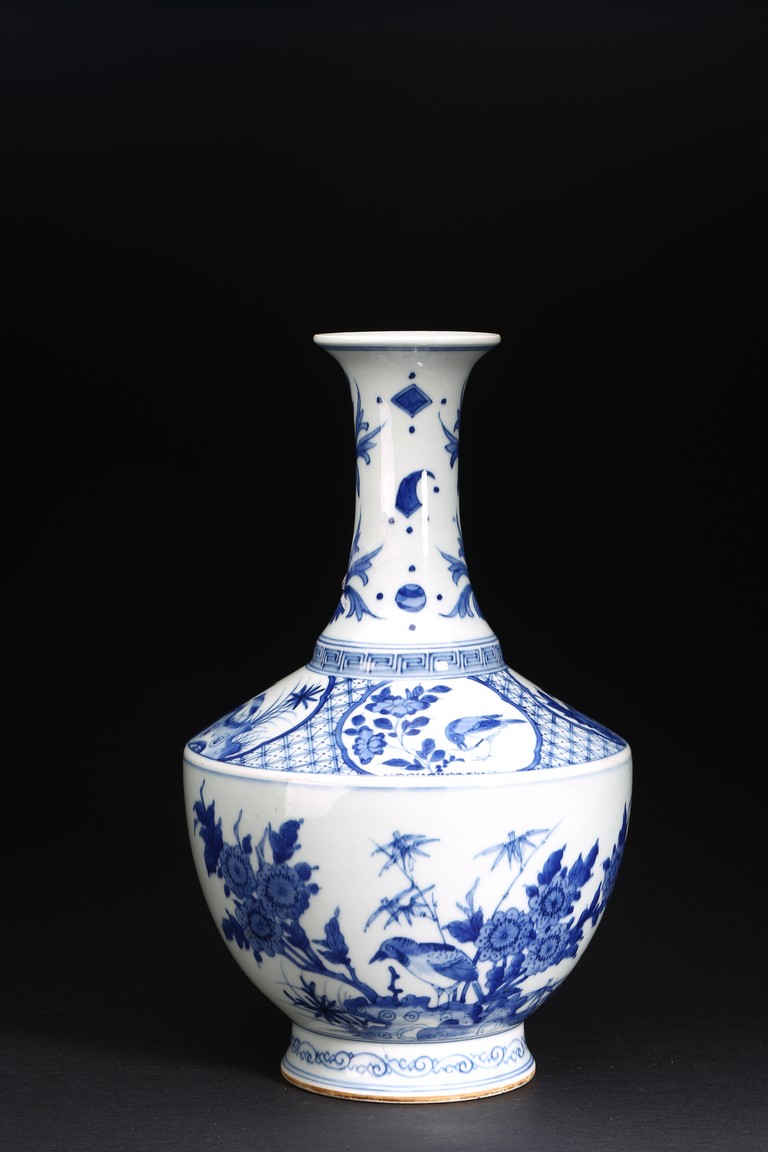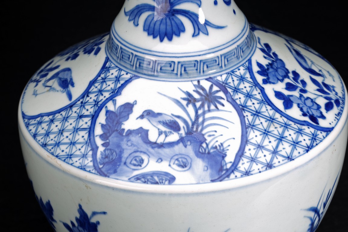 The body painted with flowers and birds, the shoulder further decorated with alternating cartouches enclosing birds and flowers.