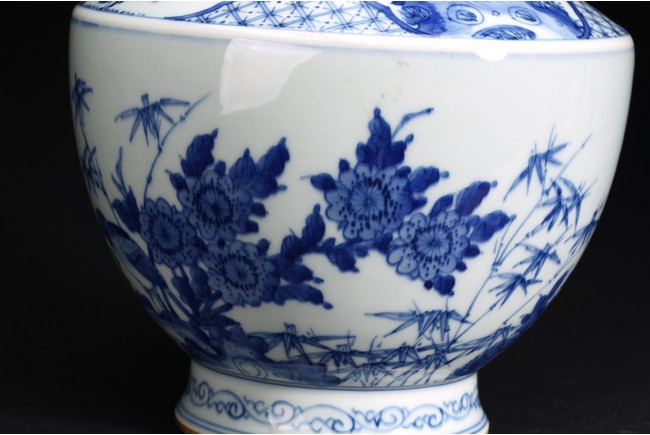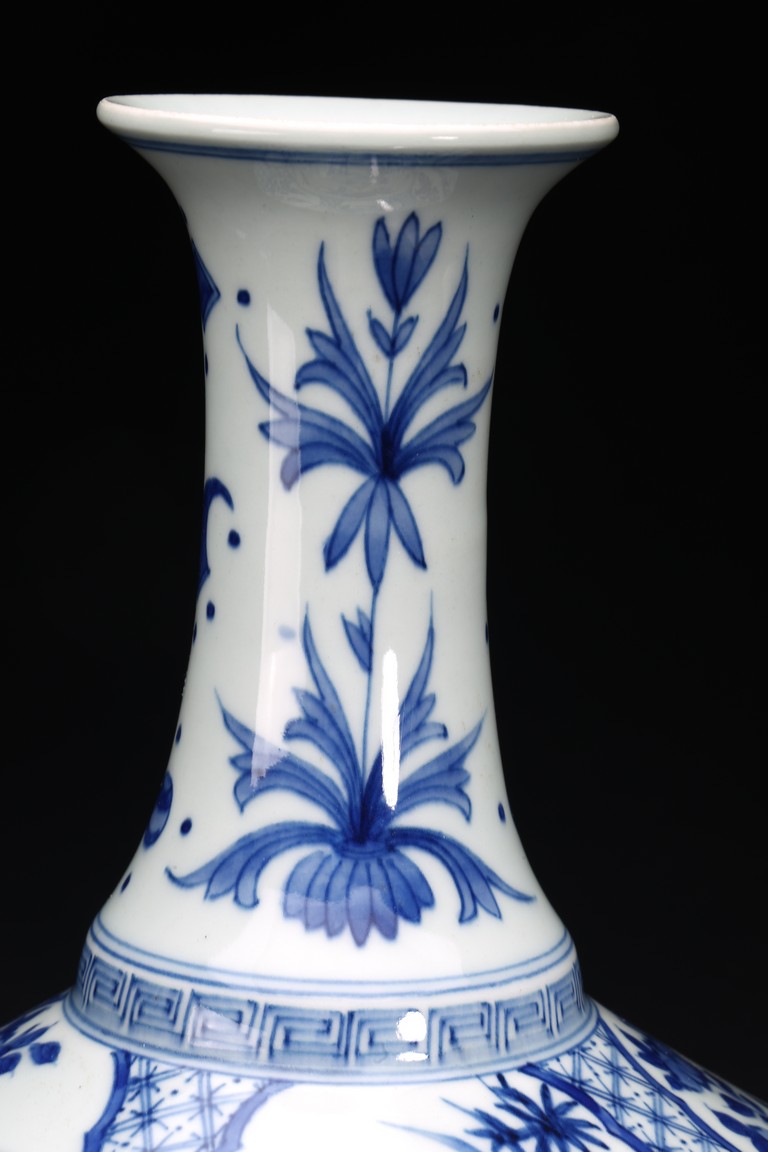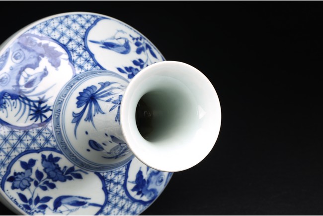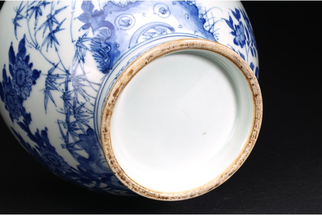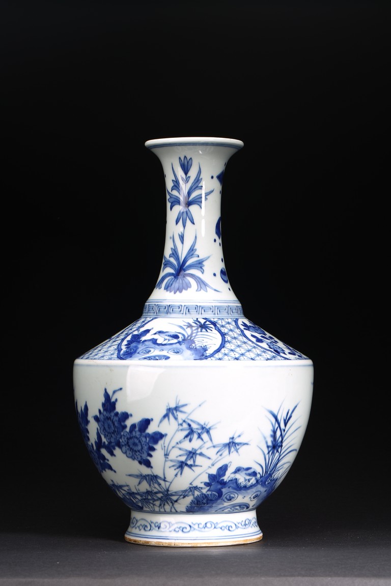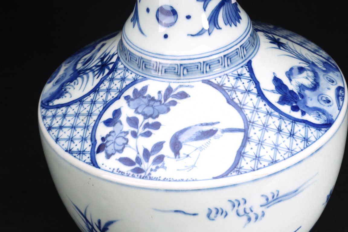 The body painted with flowers and birds, the shoulder further decorated with alternating cartouches enclosing birds and flowers.