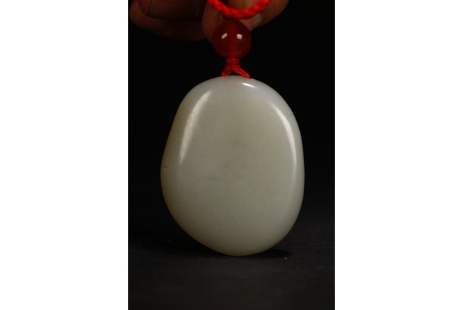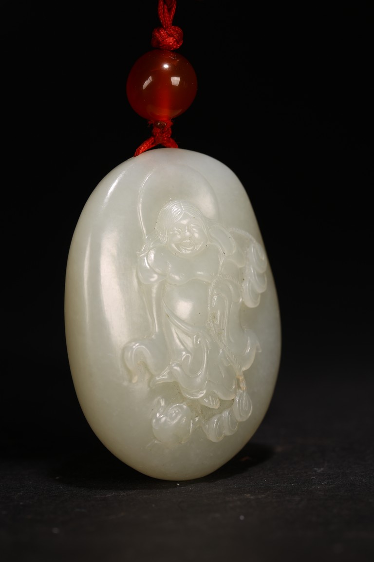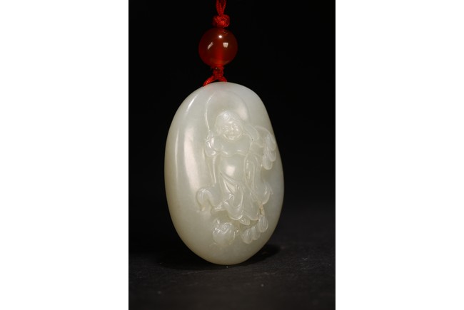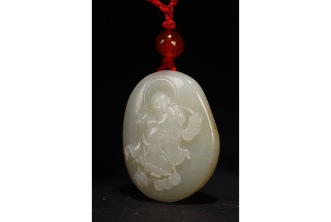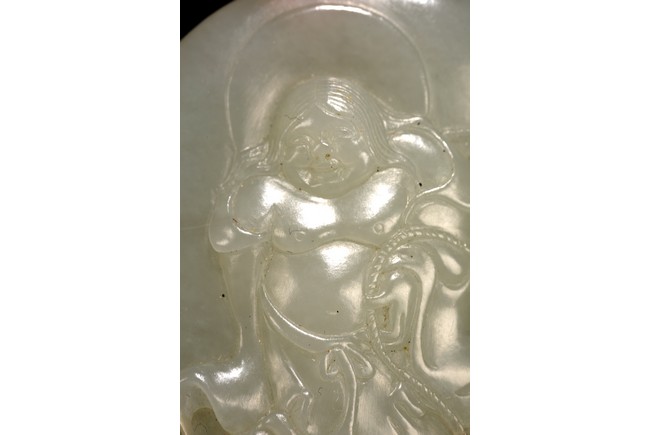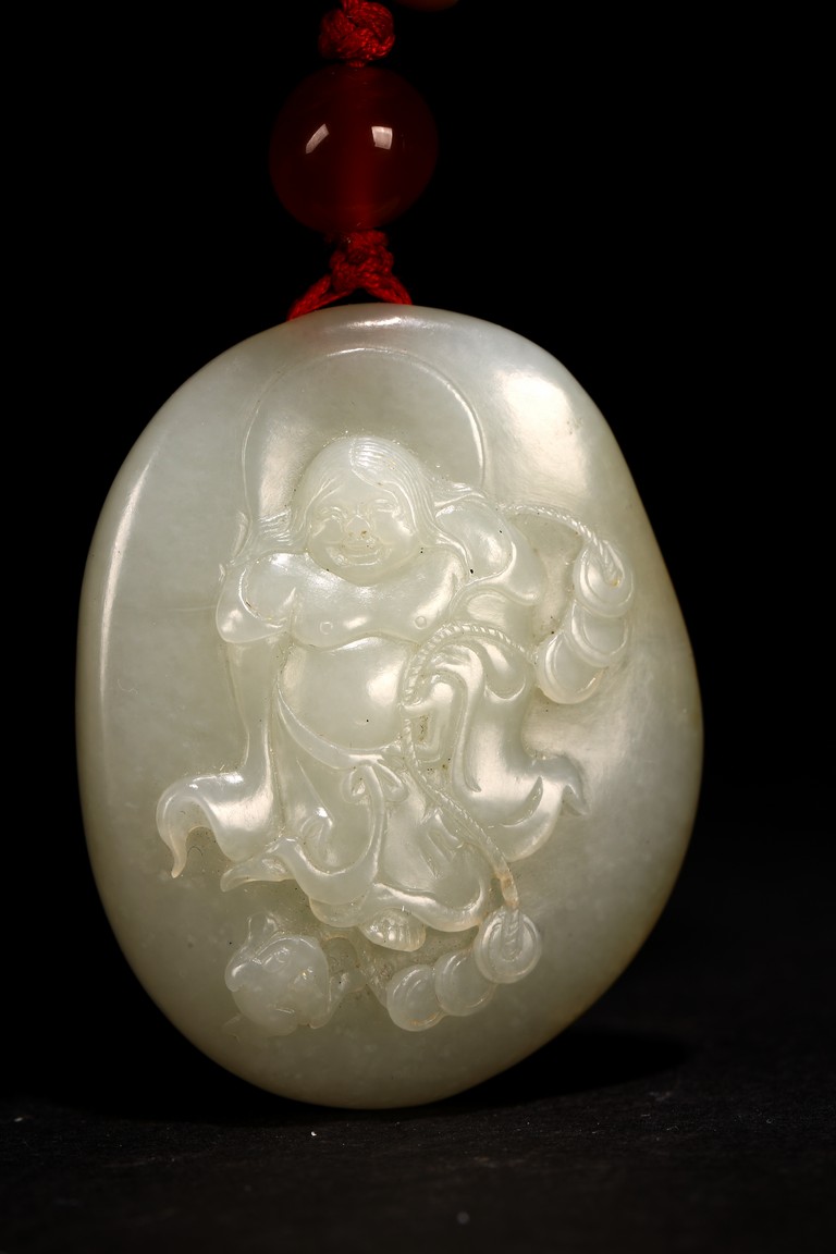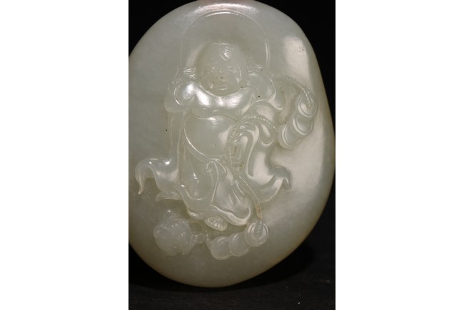 Qing Dynasty period. Of oval form, carved in relief with the laughing liu hai holding bag of coins over shoulder and the golden toad underneath.
