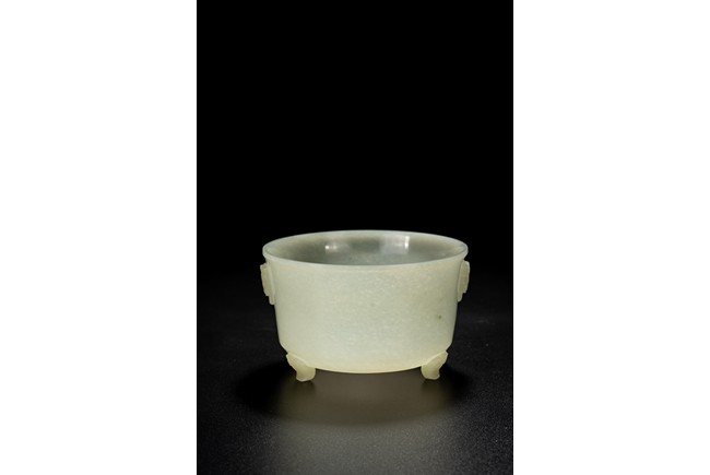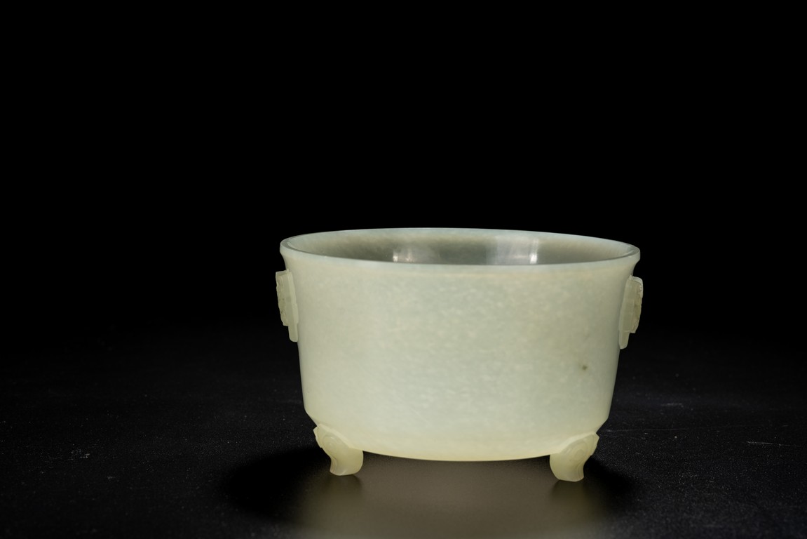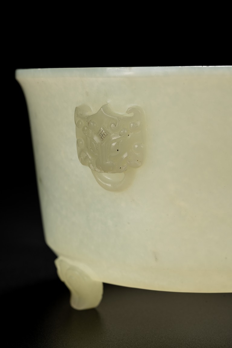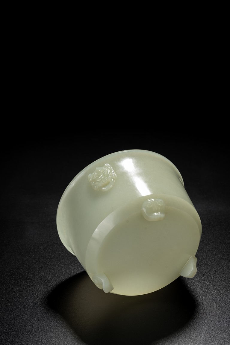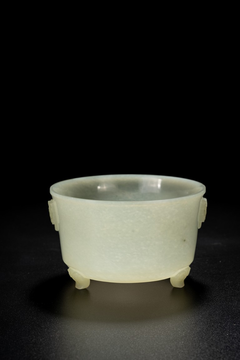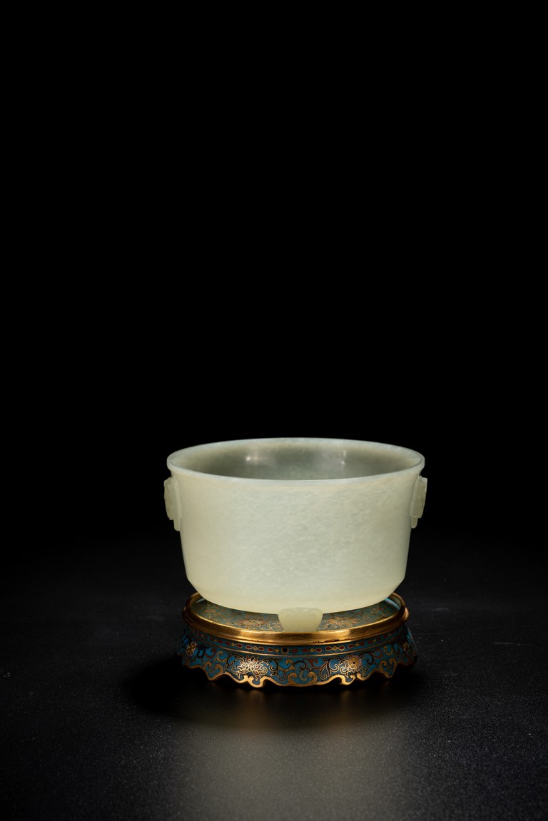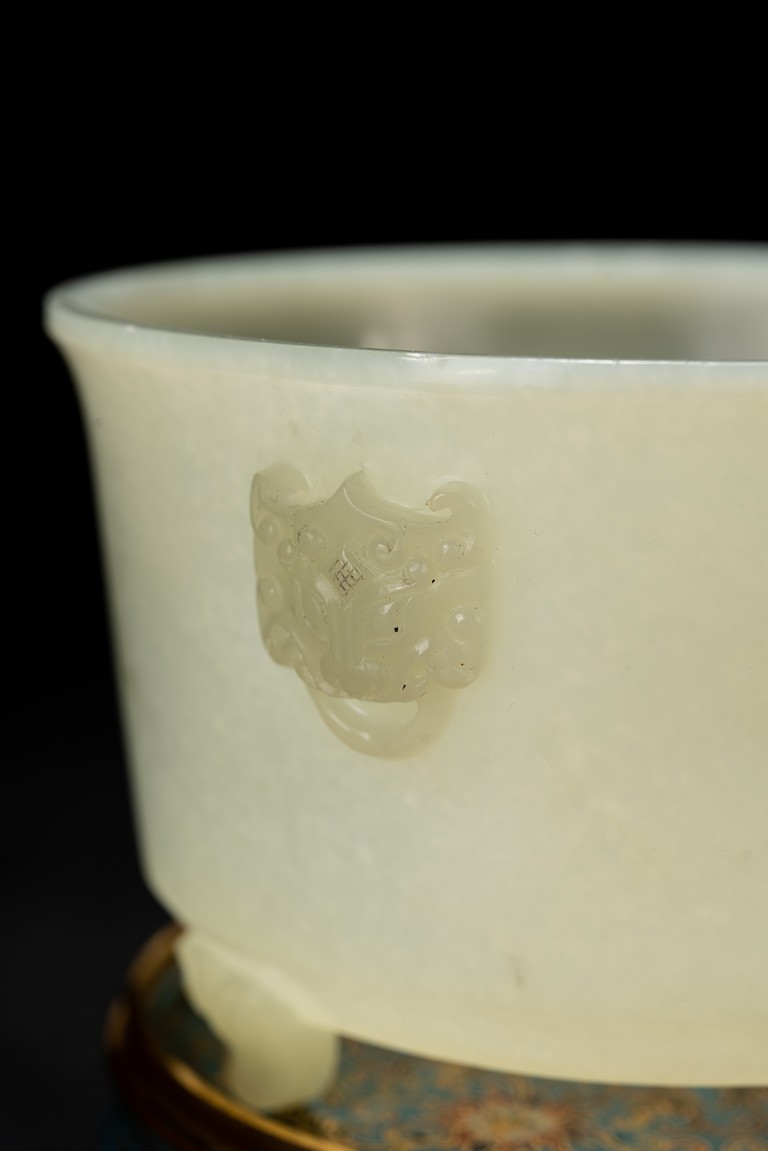 Qing Dynasty period. The white jade censer carved with pair of moulded mythical beast heads and supported on three stubs, the jade is of polished even white tone, accompanied with a cloisonne enamel stand with reign mark on the underside.