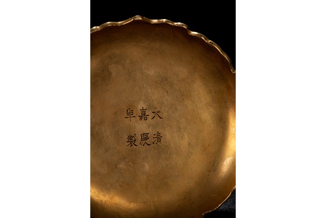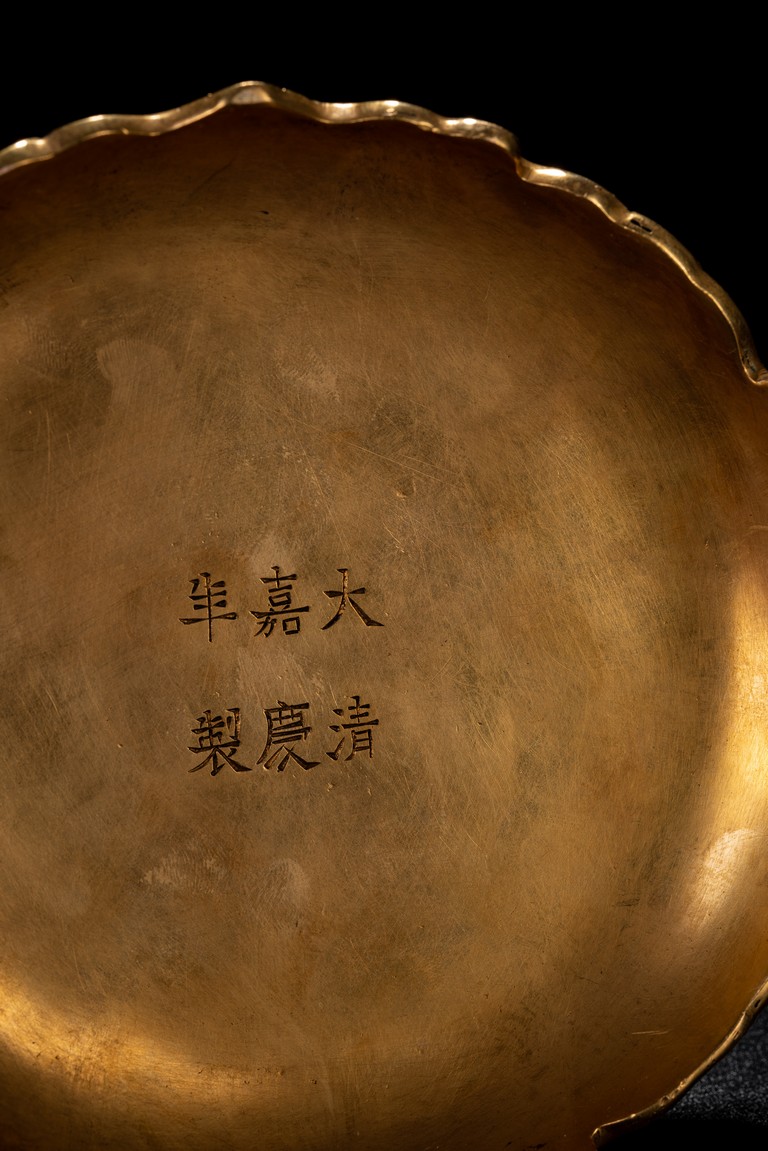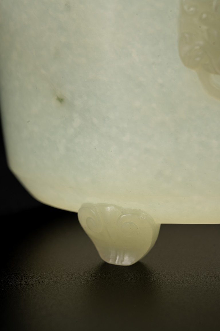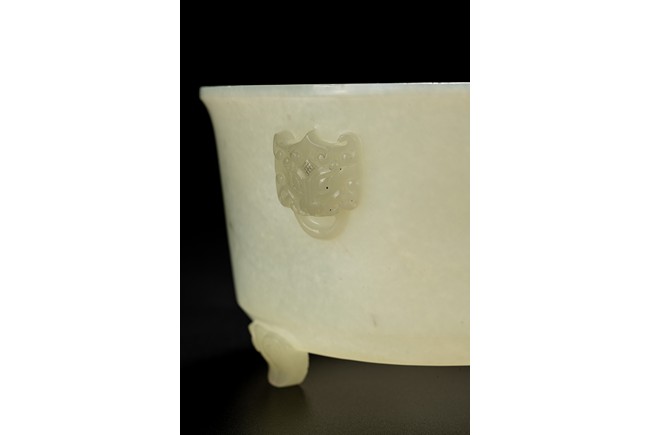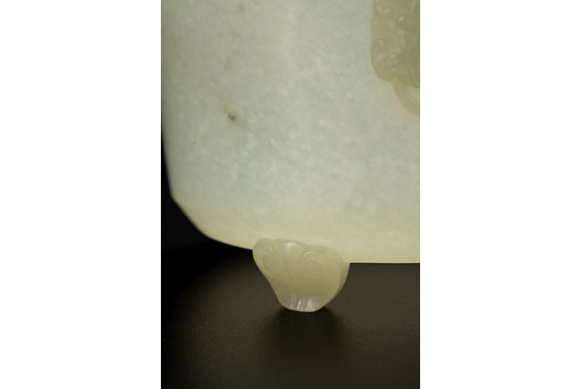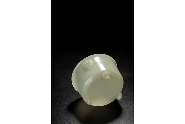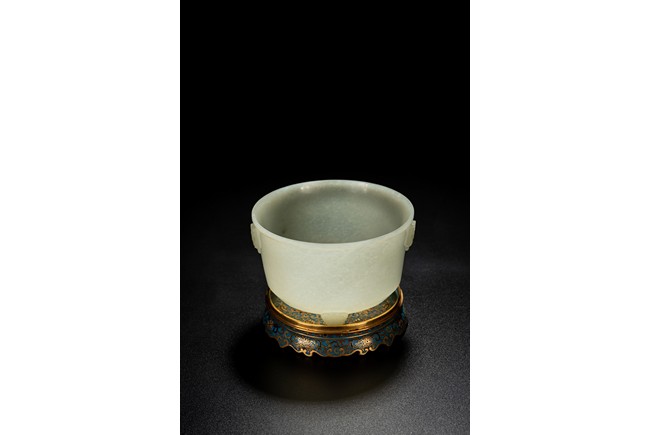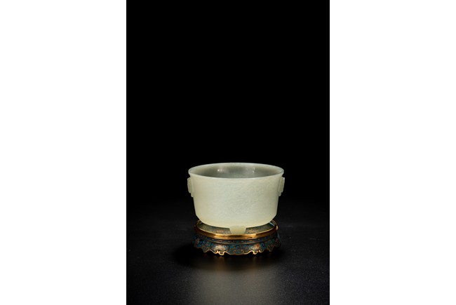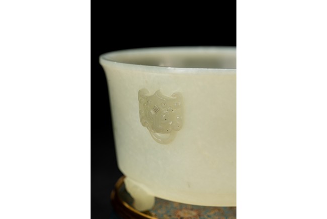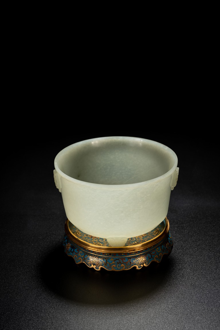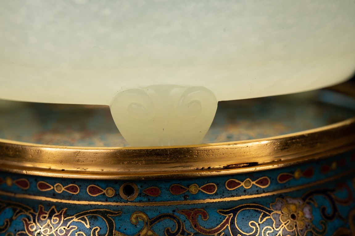 爐圓形,撇口,腹部圓鼓,下承三蹄形足。兩側雕飾蟠龍形鈕,和田玉質瑩潤微透,如脂若冰。整個爐造型樸拙,典雅生動,韻味無窮。玉雕技藝精湛,琢刻規矩整齊,壓地光潔如鏡,拉線圓轉流暢,精細絕倫,珍稀罕見。下帶原配掐絲琺瑯鎏金纏枝蓮紋底座,保存完整,實屬難得。