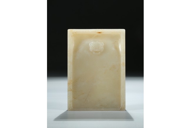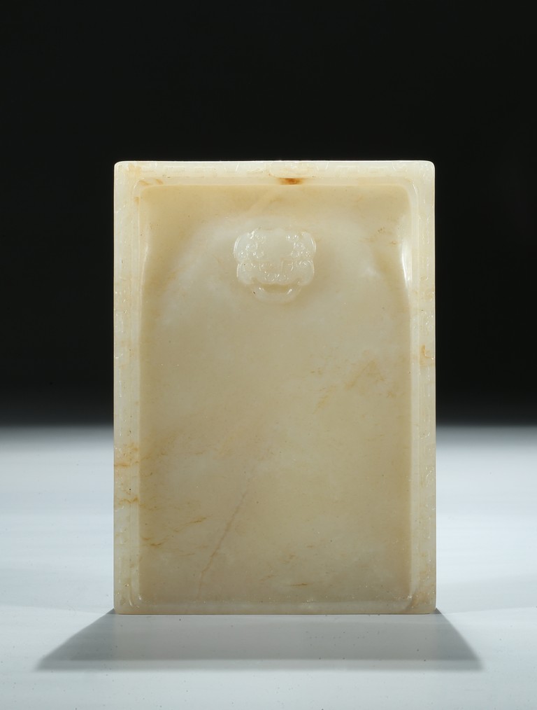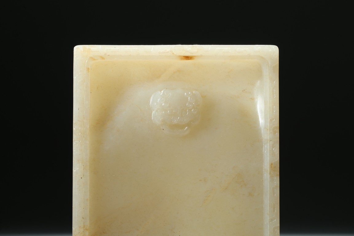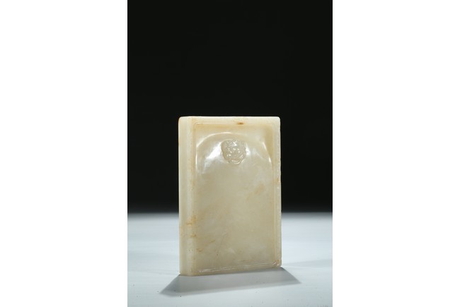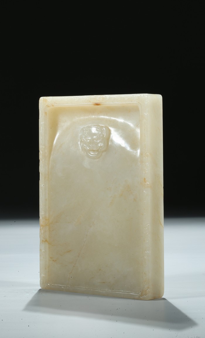 Of rounded rectangular form, the inkwell carved with a raised mythical beast head mask, the border incised with archaistic pattern, the translucent stone of a white and slight russet color. Qing Dynasty period.