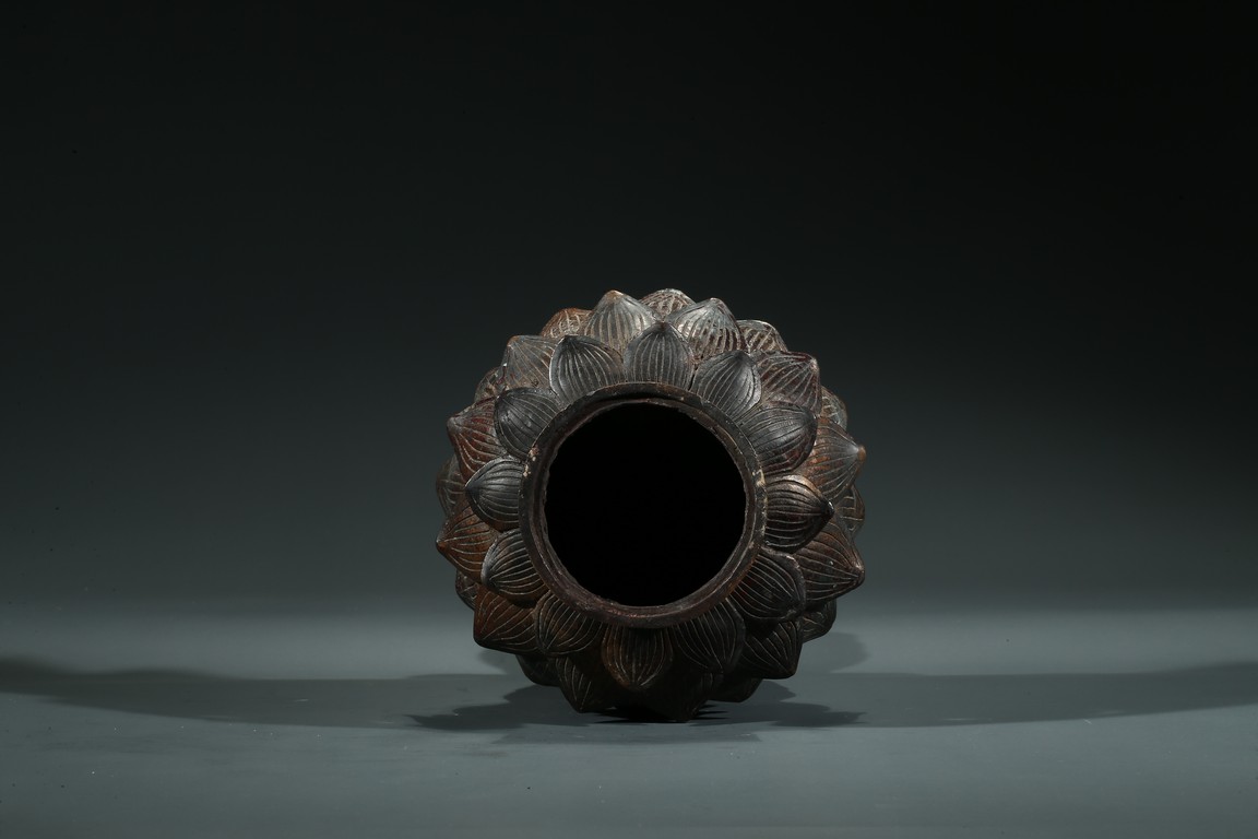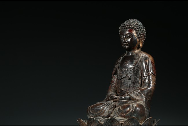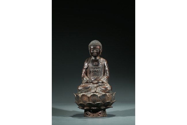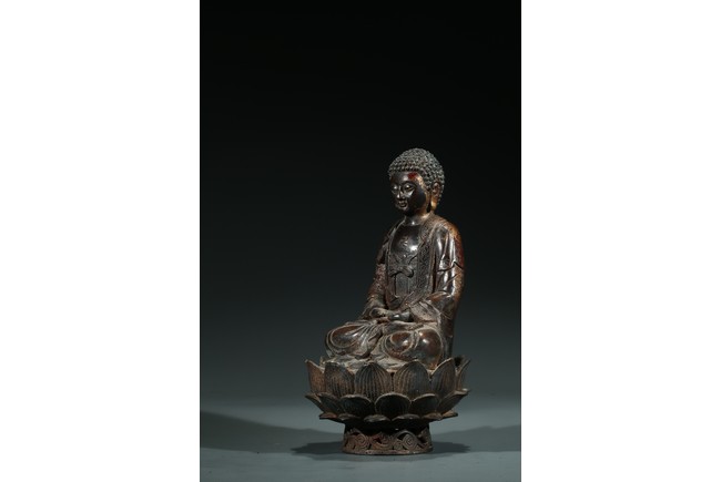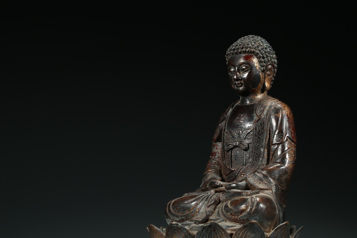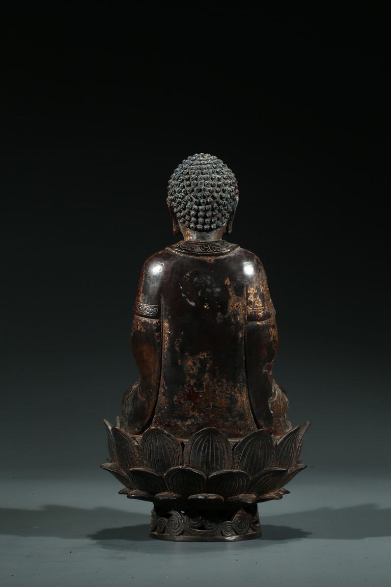 阿彌陀佛是梵文“阿彌陀婆佛陀”和“阿彌陀庚斯佛陀”的音譯略稱,意思是“無量壽”和“無量光”,是主持西方極樂世界的教主。這尊造像是標準的明代中原漢傳佛教造像。造像雙手結禪定印,結全跏趺坐。頭部較大,頭飾螺發,肉髻圓隆高凸,頂飾摩尼寶珠,是宋元以來中原漢傳佛教常見的裝飾形式。面相方圓端莊,眼瞼低垂,目光下斂,雙目宛若未開敷的蓮花苞,俯視著芸芸眾生,神態慈祥柔和,典型的明代漢地造像面相特徵。上身著雙領式通肩大衣,下身著高束腰長裙,腰繫束帶並打結,這是中原造像典型的裝束形式。衣紋採用內地傳統寫實性技法,簡潔流暢,表現出衣料較強的質感。整尊造型端莊大方,比例舒展勻稱,胎體厚重敦實,時代風格鮮明,是明代中晚期中原造像中的典型作品。