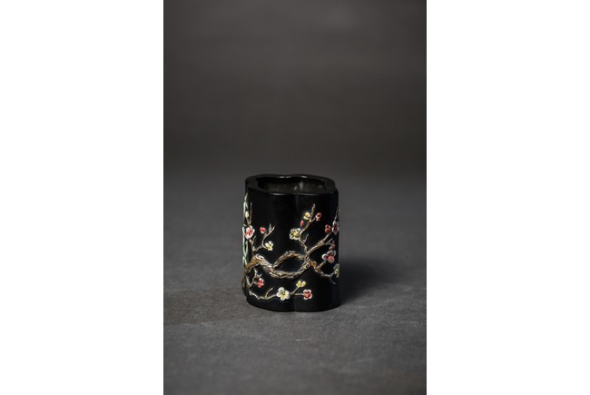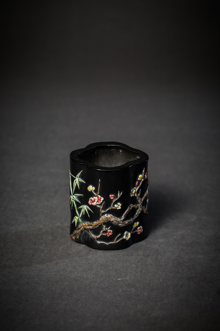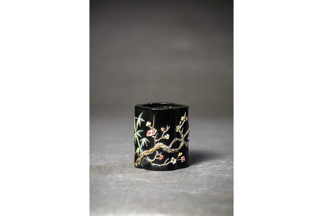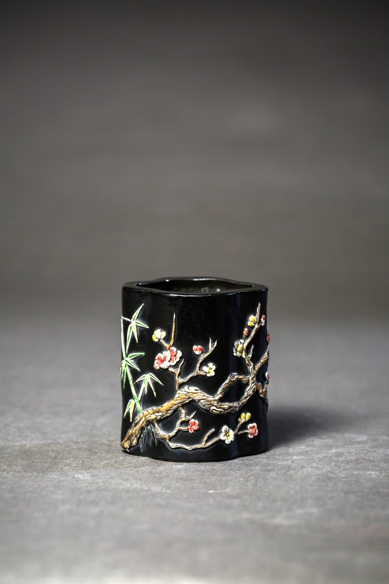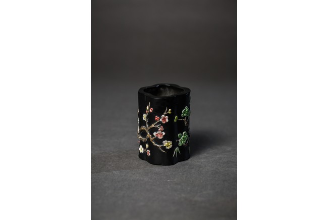 形作海棠,內外皆施黑釉,上鑲彩瓷,飾“松竹梅”,枝幹纖韌,葉片抑揚向背,極為寫實,各色朵花,相互爭艷,花容秀美,吐萼含苞,又顯顧盼有情。寓意美好,合稱“歲寒三友”,都有不畏嚴霜的高潔風格。“大清乾隆年制”款識。