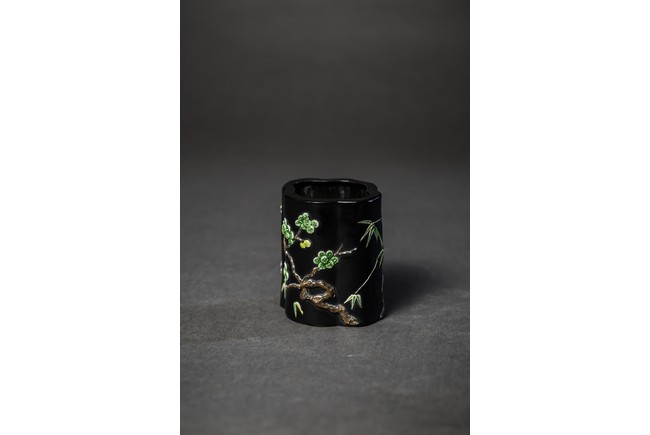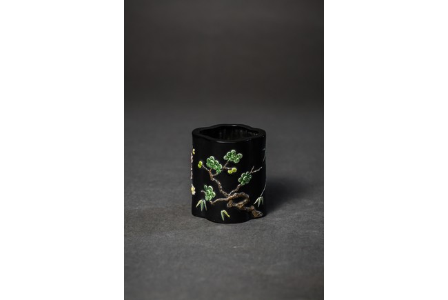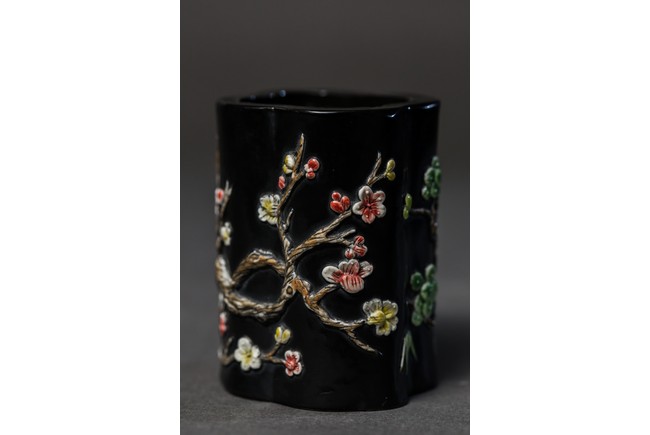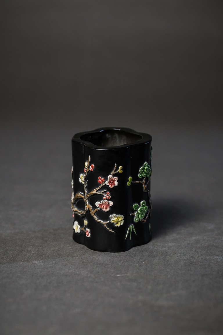 Of lobed form, the black glazed body moulded in relief to depict plum blossom, bamboo, and pines, base with mark.