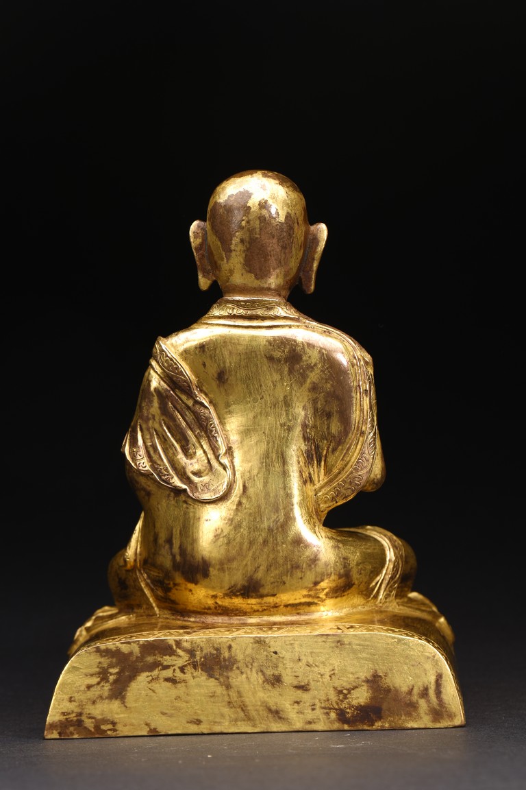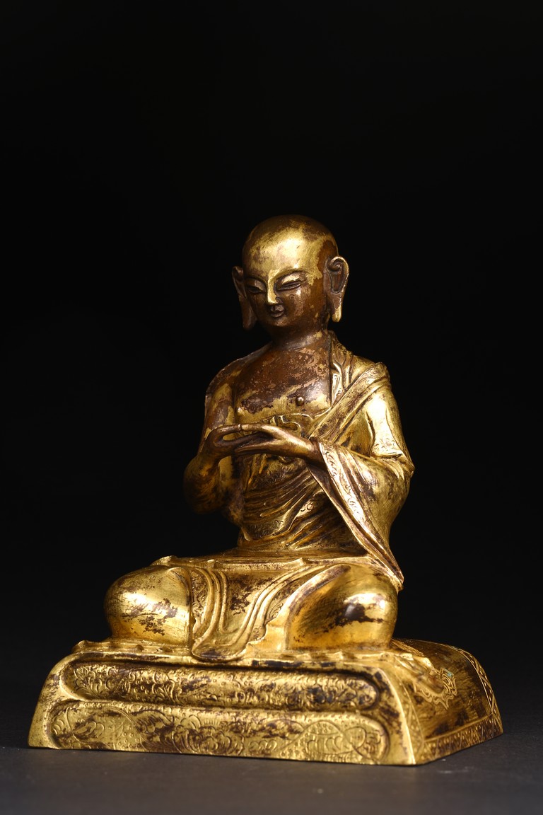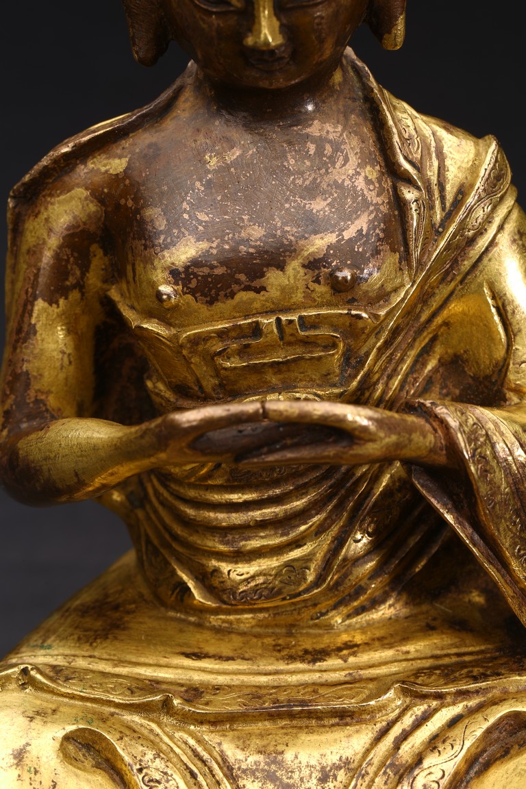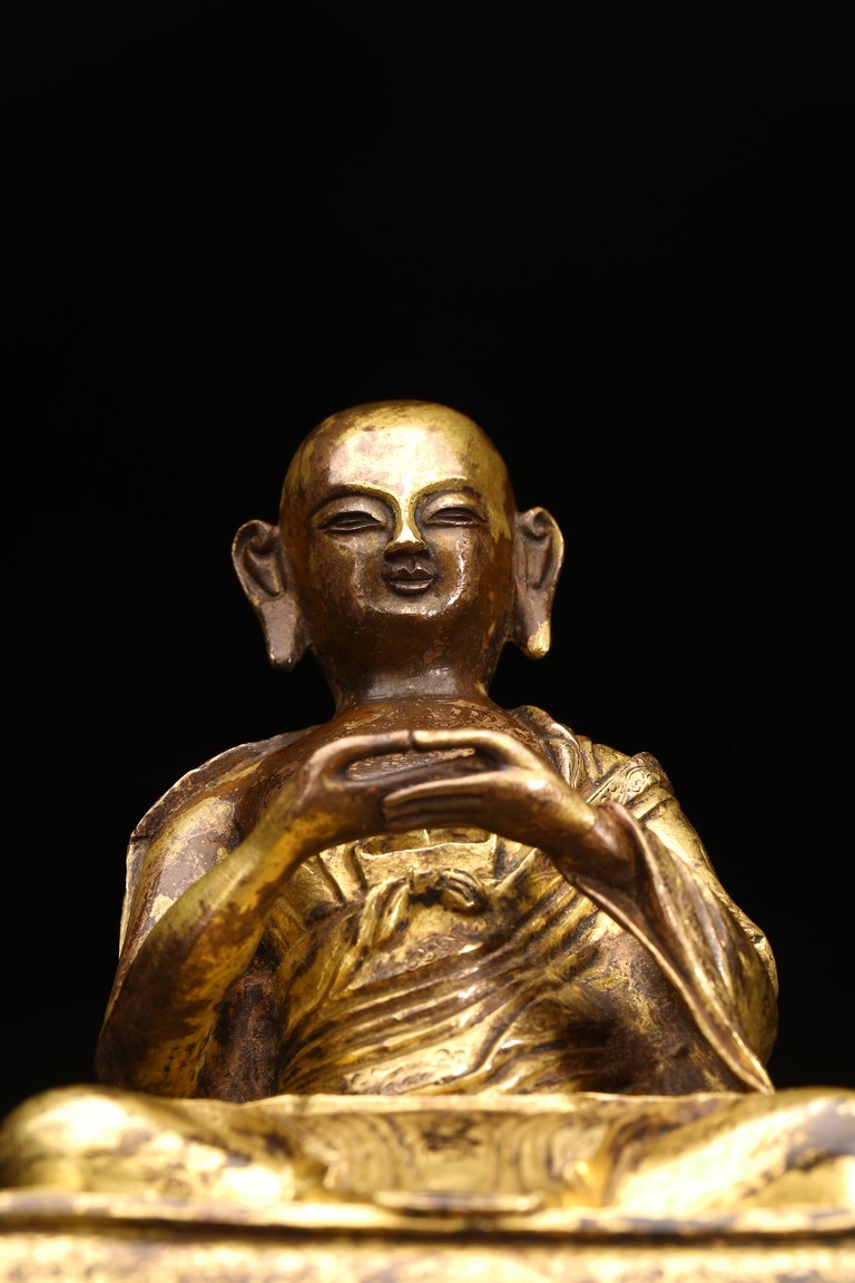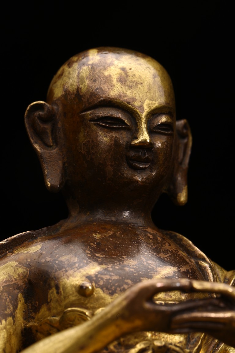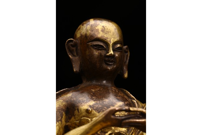 面容俊秀,眉宇間清澈潤朗,祥和寧靜。左右手皆結“禪定印”置於胸前,盤腿而坐。顯得悠然自得,大有看破凡塵,而得大自在的狀態。身上袈裟輕柔貼體,衣褶自然流暢,垂落於身邊,極為寫實。尊羅漢造像金水保存良好,銅質潤澤,熠熠生輝,花紋刻劃細密、生動,工藝精湛,藝術價值極高。