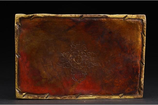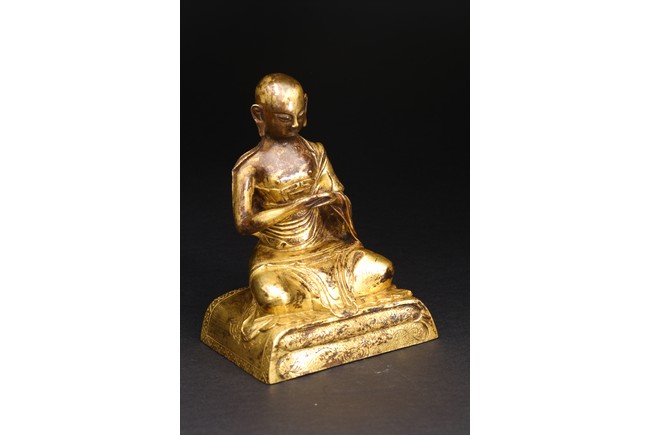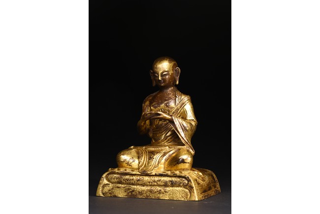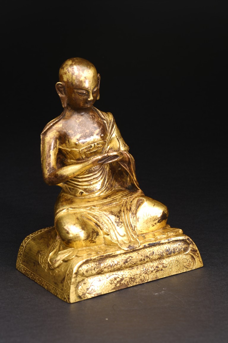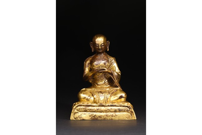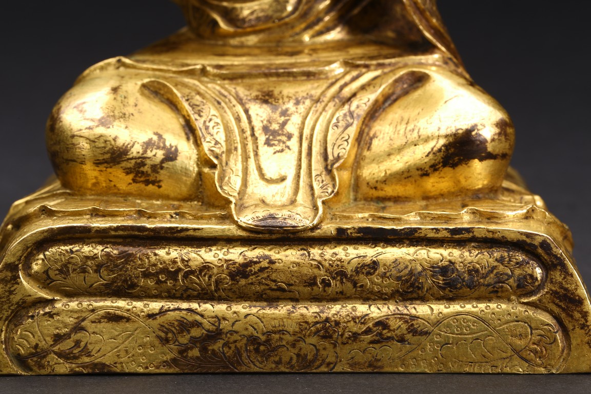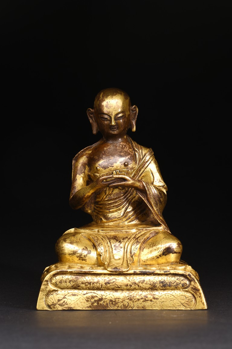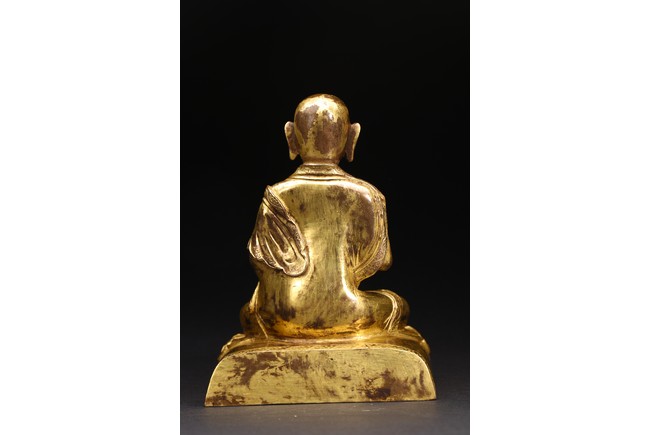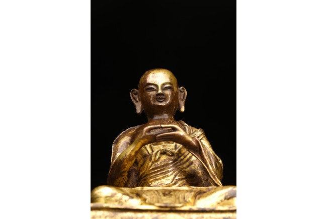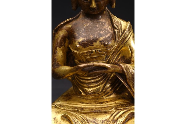 面容俊秀,眉宇間清澈潤朗,祥和寧靜。左右手皆結“禪定印”置於胸前,盤腿而坐。顯得悠然自得,大有看破凡塵,而得大自在的狀態。身上袈裟輕柔貼體,衣褶自然流暢,垂落於身邊,極為寫實。尊羅漢造像金水保存良好,銅質潤澤,熠熠生輝,花紋刻劃細密、生動,工藝精湛,藝術價值極高。