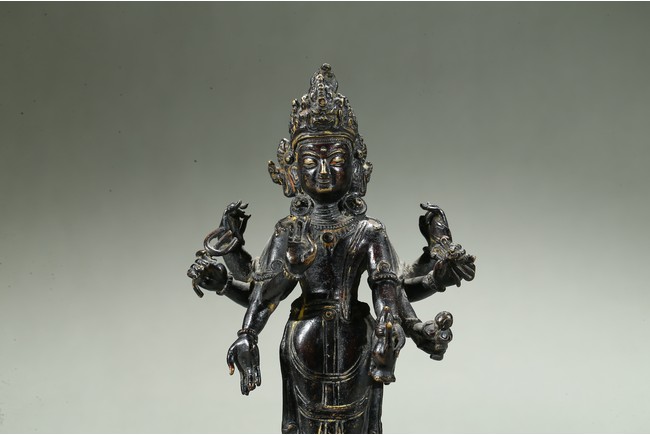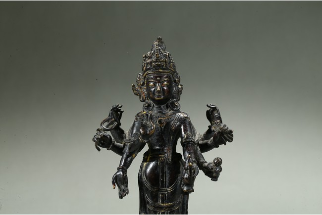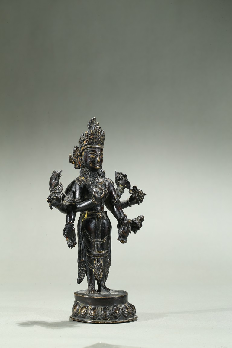 The deity is shown standing upon a lotus throne, wearing loose fitting dhoti and adorned with beaded necklace, his hands holding various ritual attributes, with a serene face framed by pointed crown enclosing high chignon. 16th century.