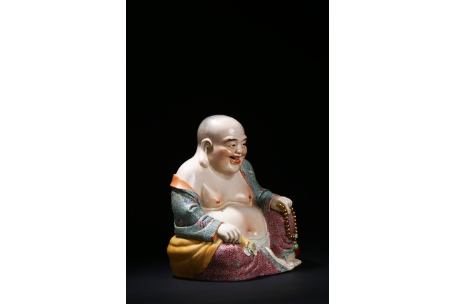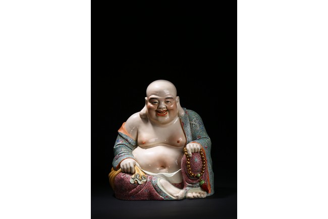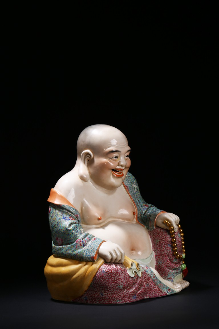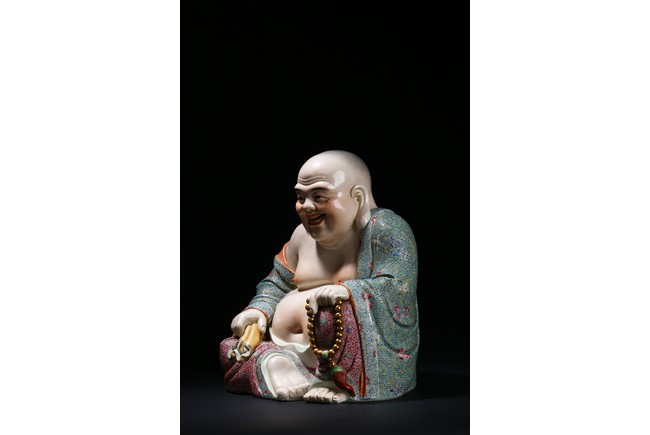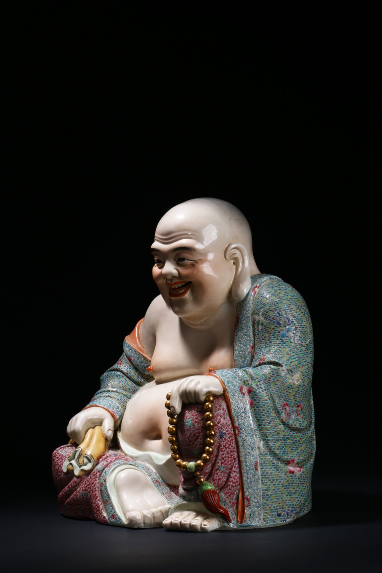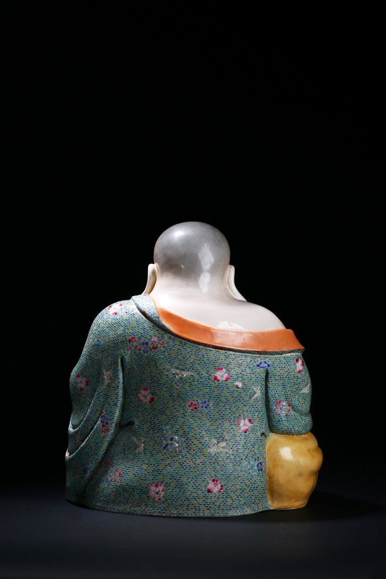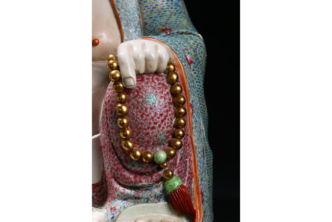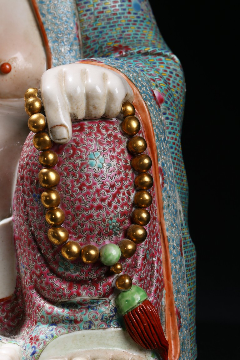 Republic period. Modelled seated and holding a string of prayer beads in his left hand, his robe decorated with cranes and floral sprigs reserved on dense scrolled and rectangles ground , the base with impressed mark 'Zeng Long Shen Zhi'.