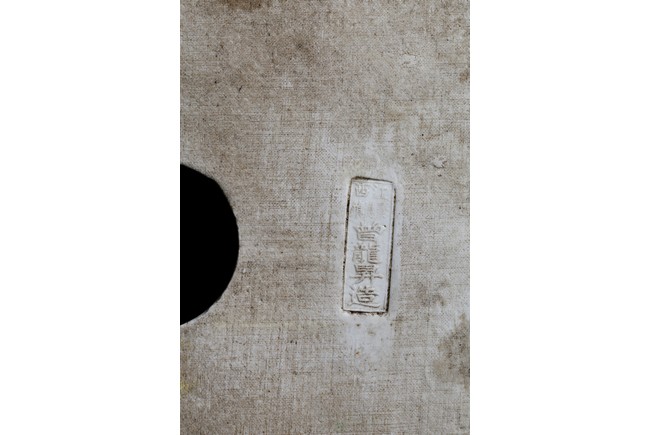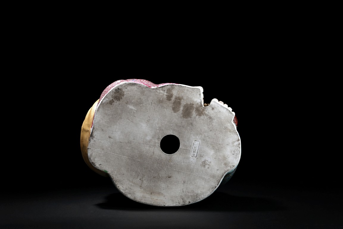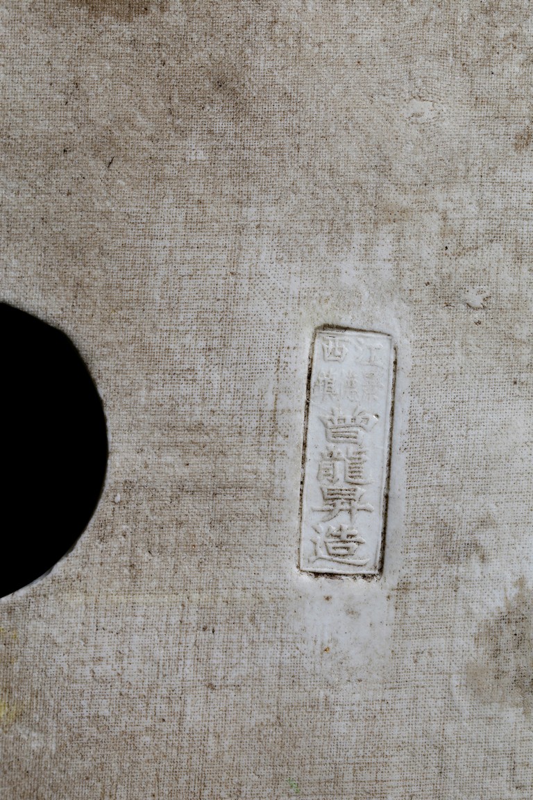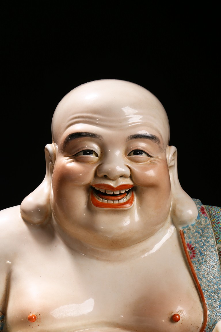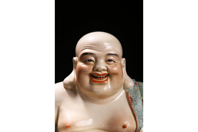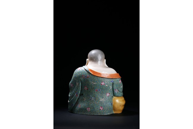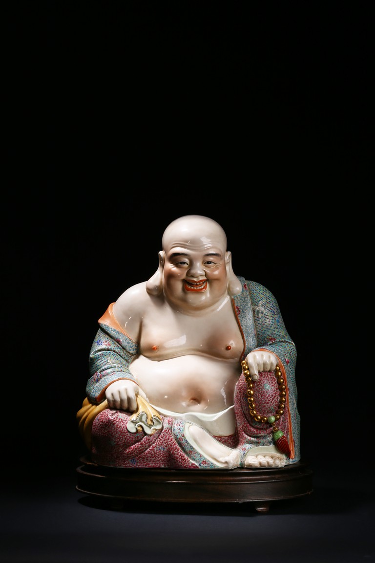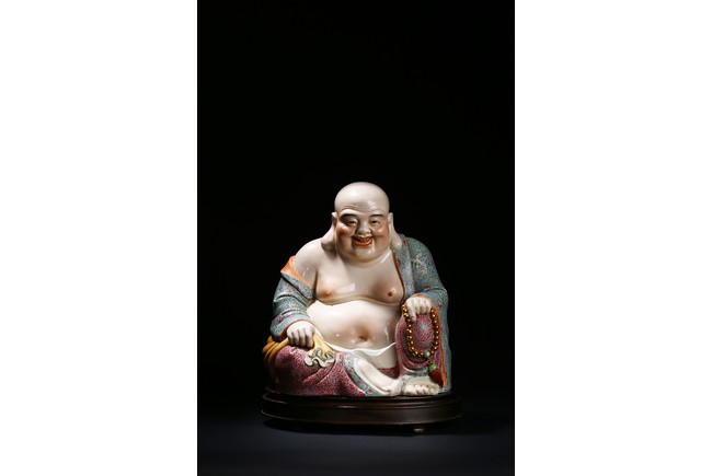 Republic period. Modelled seated and holding a string of prayer beads in his left hand, his robe decorated with cranes and floral sprigs reserved on dense scrolled and rectangles ground , the base with impressed mark 'Zeng Long Shen Zhi'.