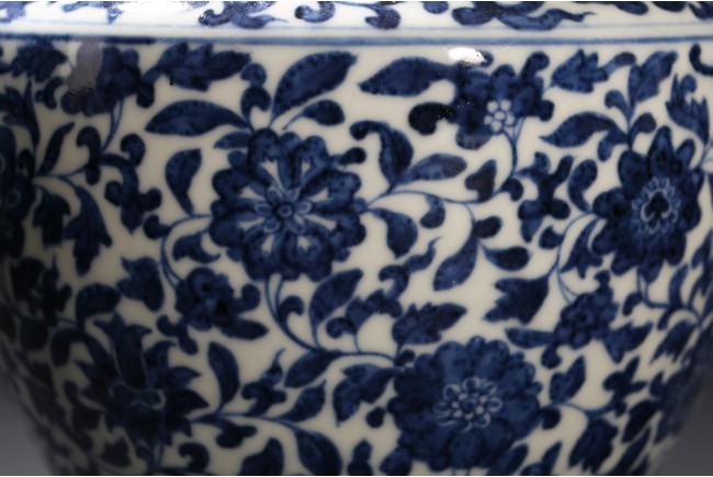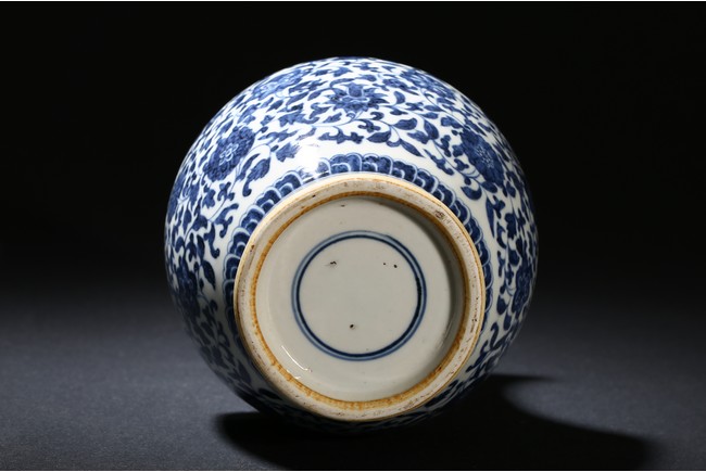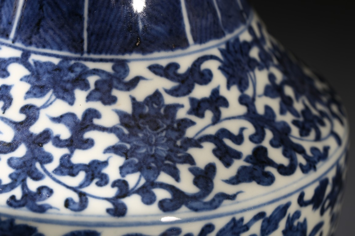 The vase exterior decorated with floral scrolls, base with double rings.