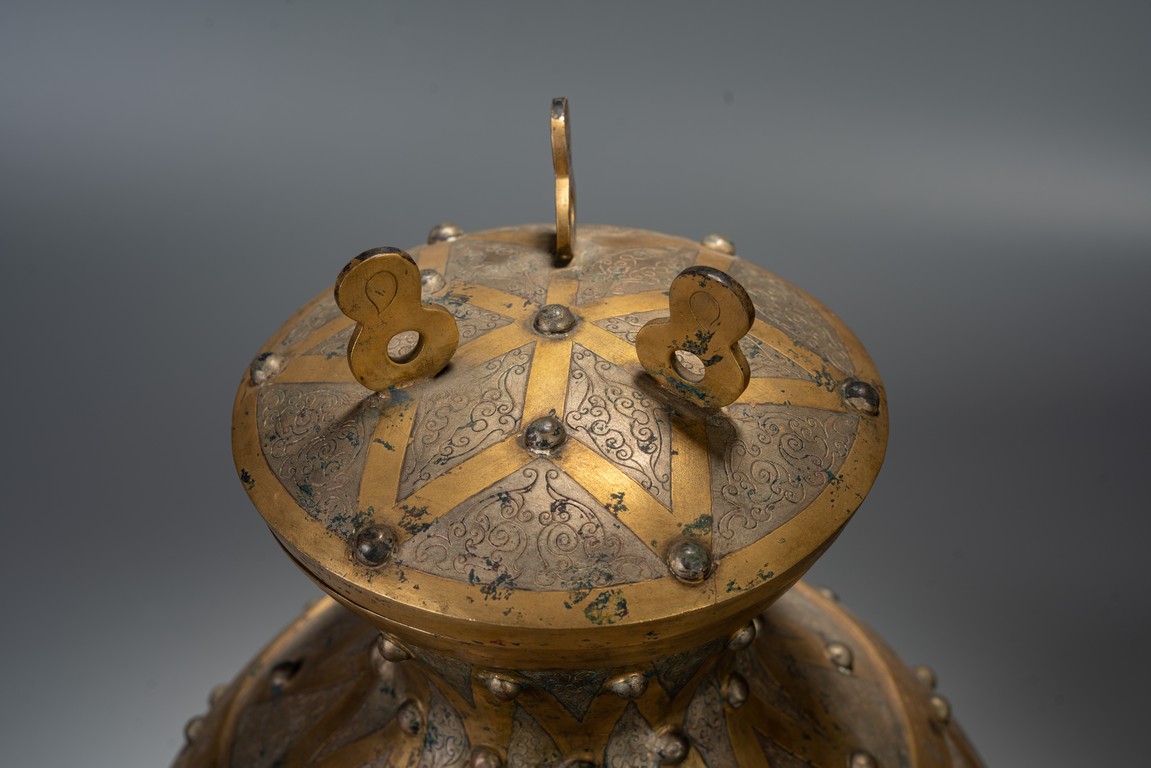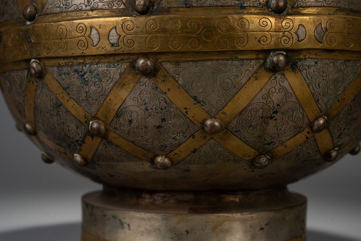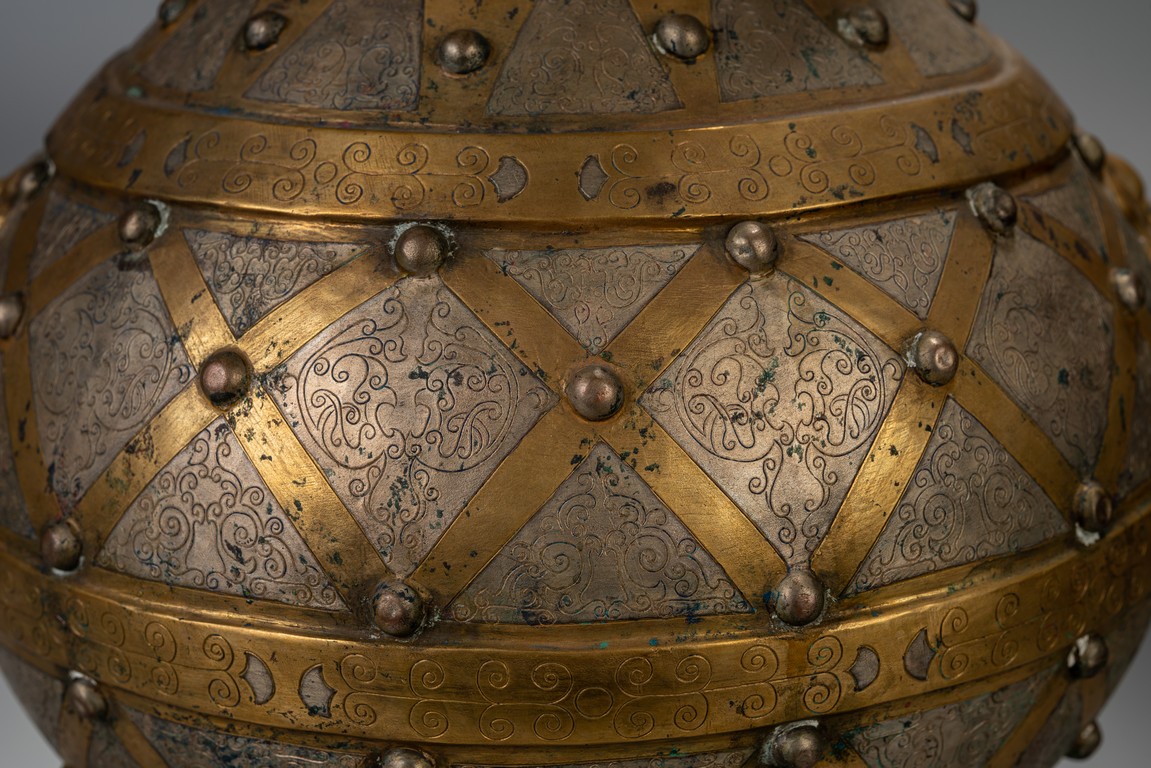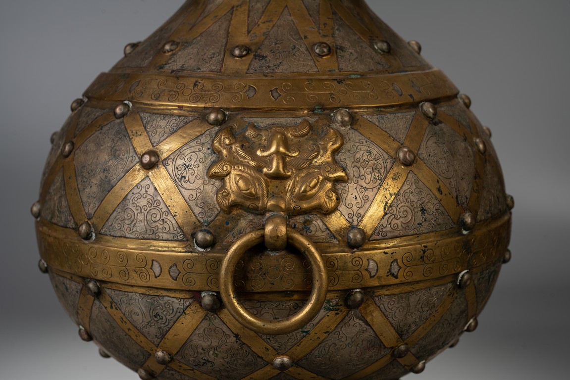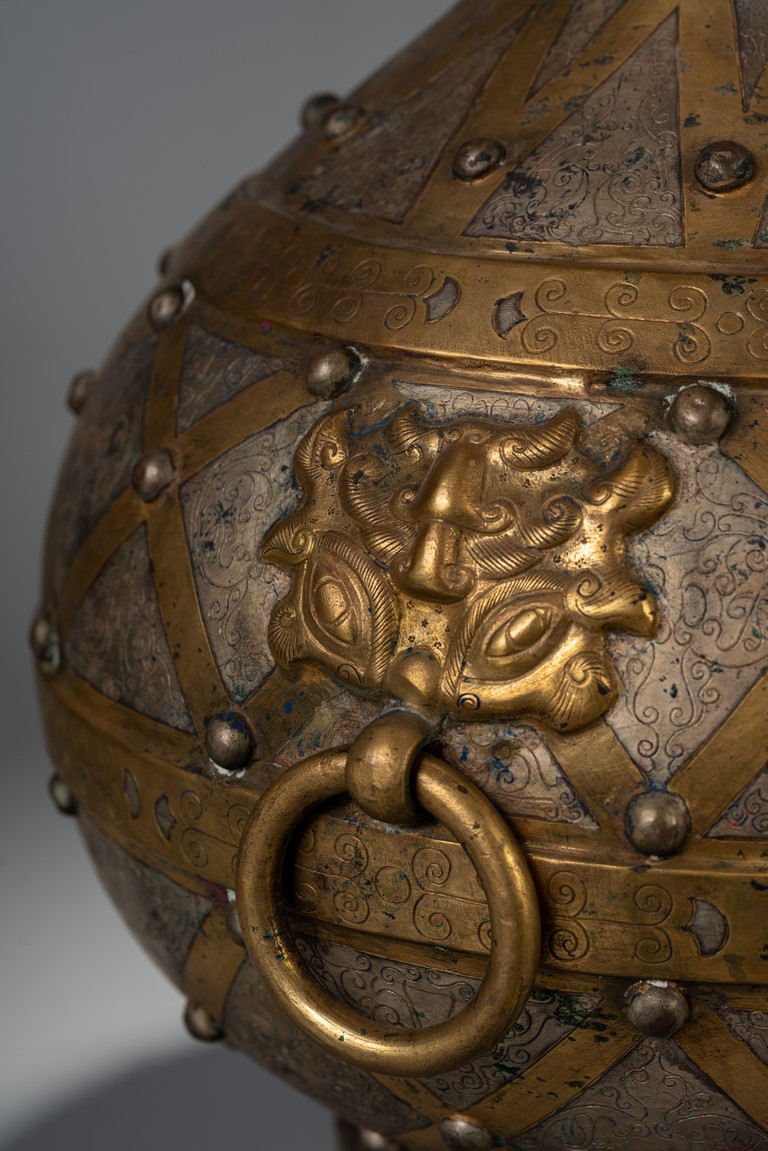 of archaic form, the body incised with scrolled pattern, divided into zones by concentric raised gilt bronze ribs, the shoulders set with taotie mask handles suspending loose rings, with raised bosses, the slightly convex cover set with three projections.