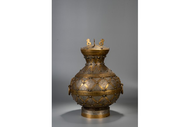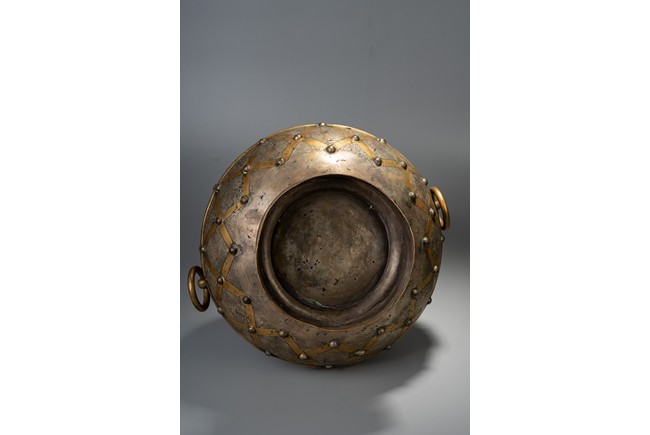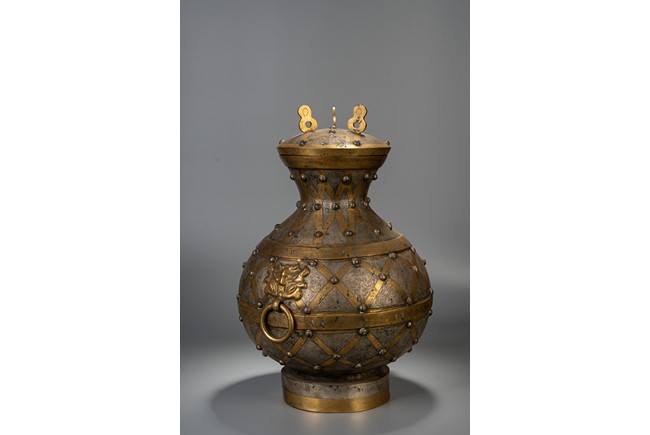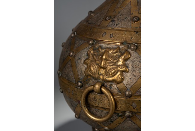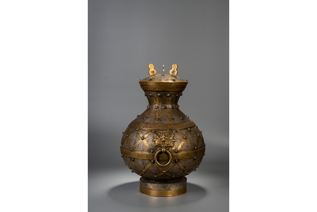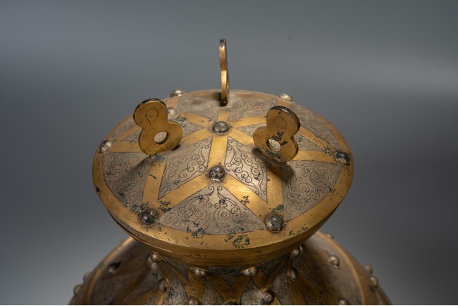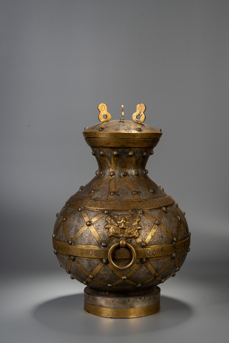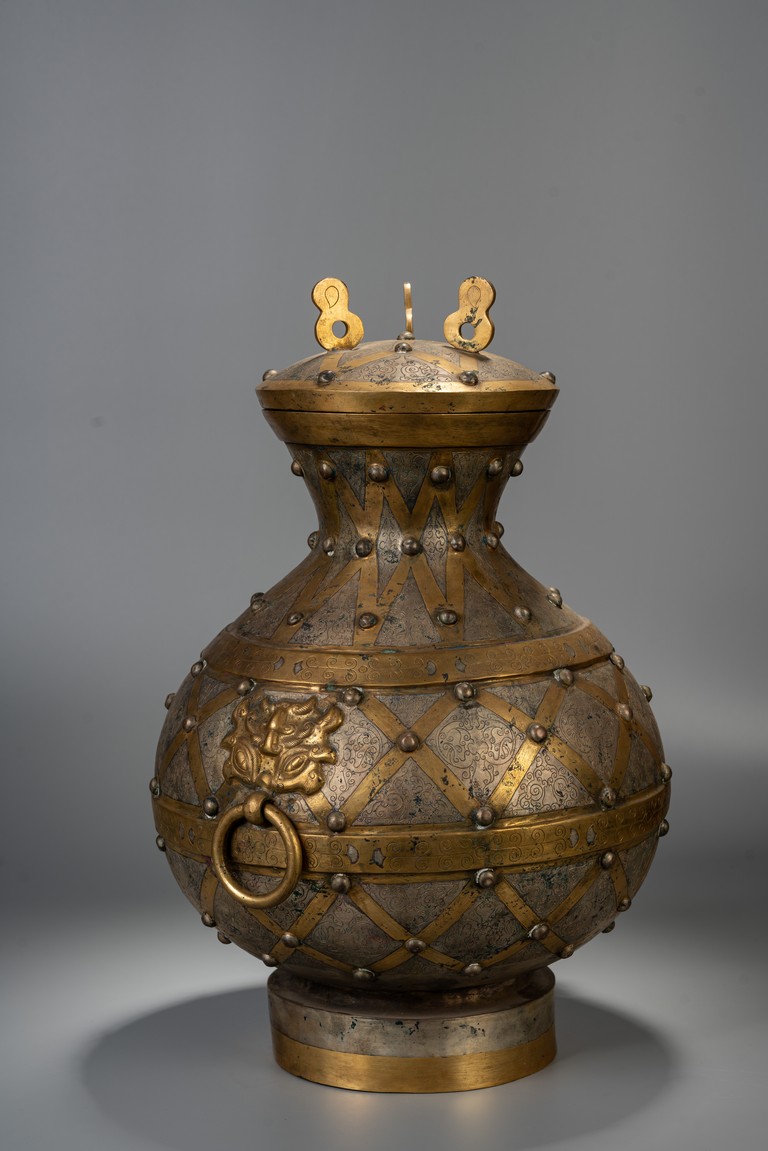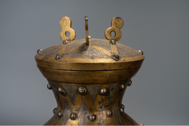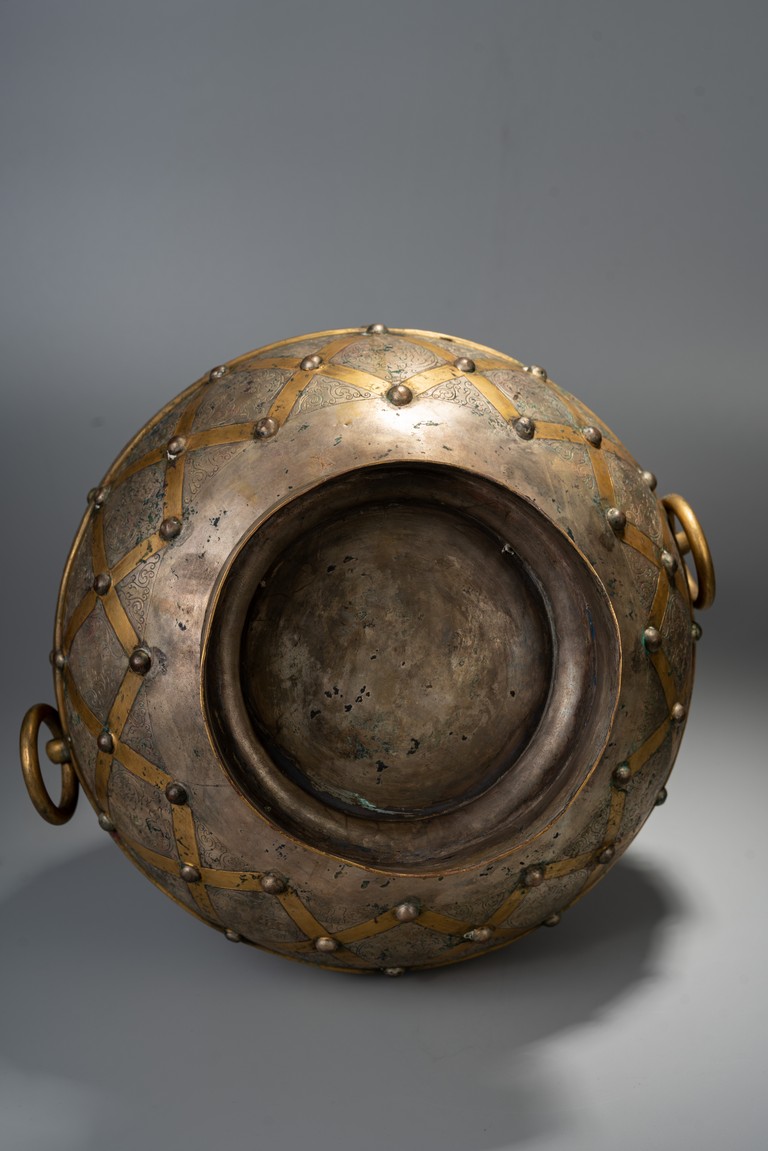 of archaic form, the body incised with scrolled pattern, divided into zones by concentric raised gilt bronze ribs, the shoulders set with taotie mask handles suspending loose rings, with raised bosses, the slightly convex cover set with three projections.