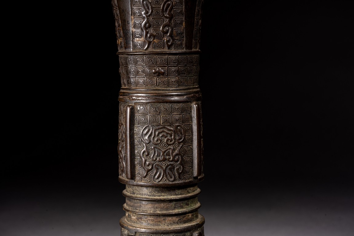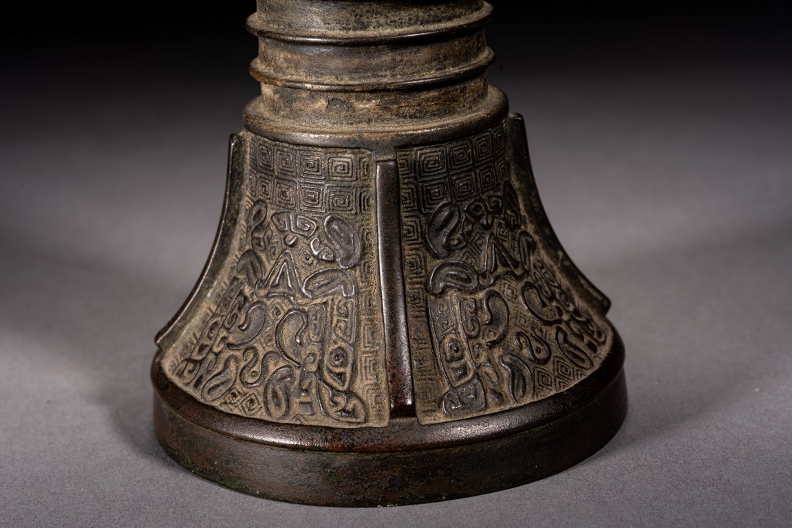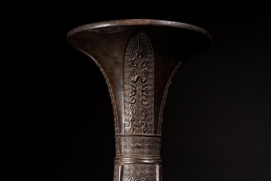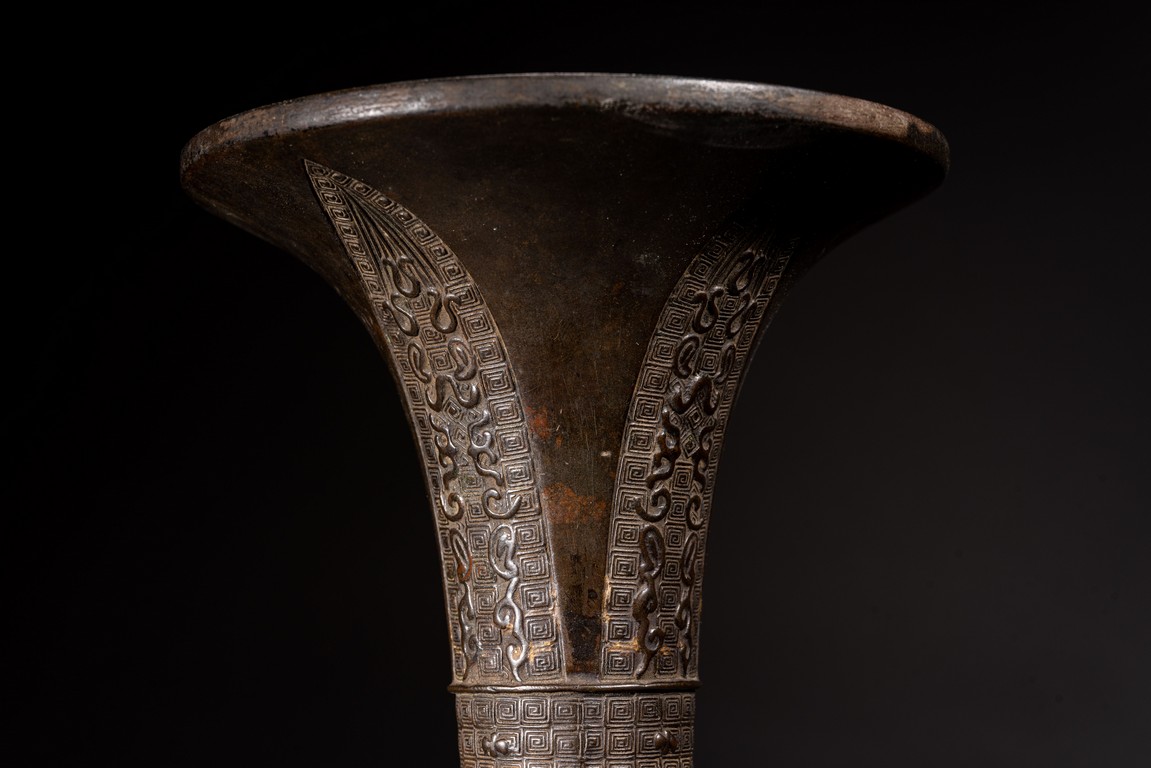 精銅鑄花觚,敞口呈喇叭狀,束腹,高圈足,圈足外撇。整器從口沿至圈足的紋飾分三部分,整體鋪鑄回字紋為地,其上為饕餮紋,布局似商周青銅紋飾。